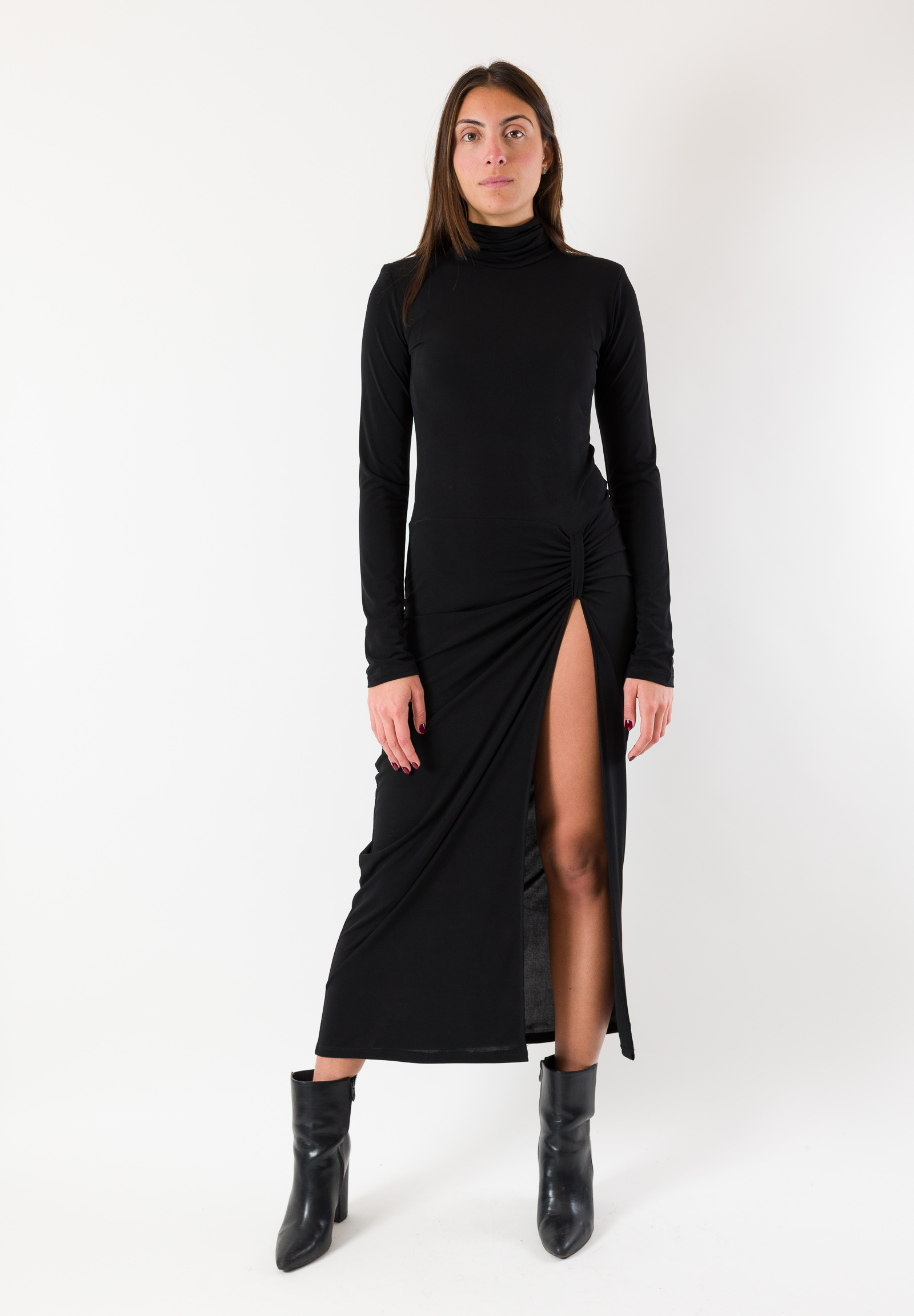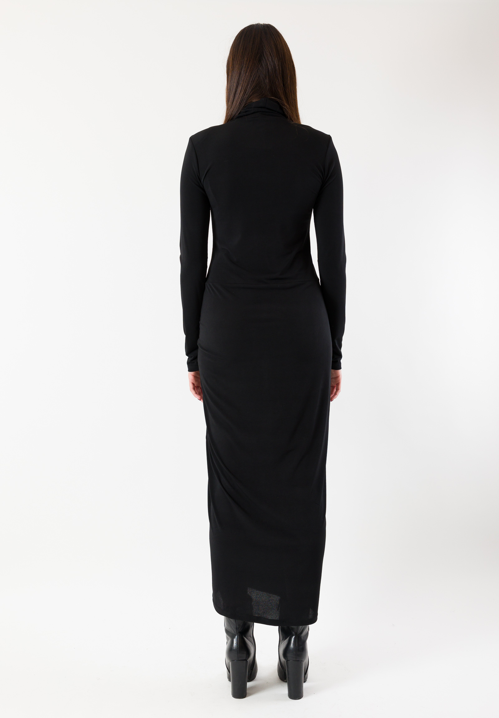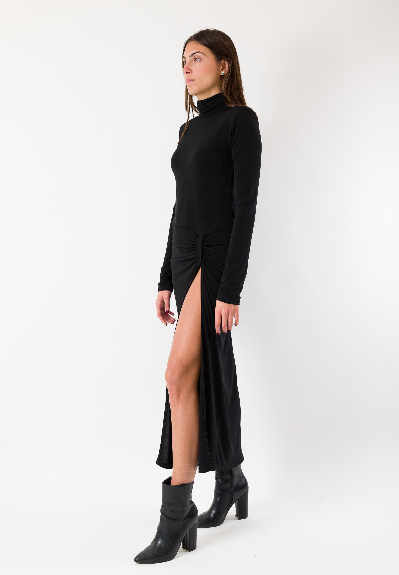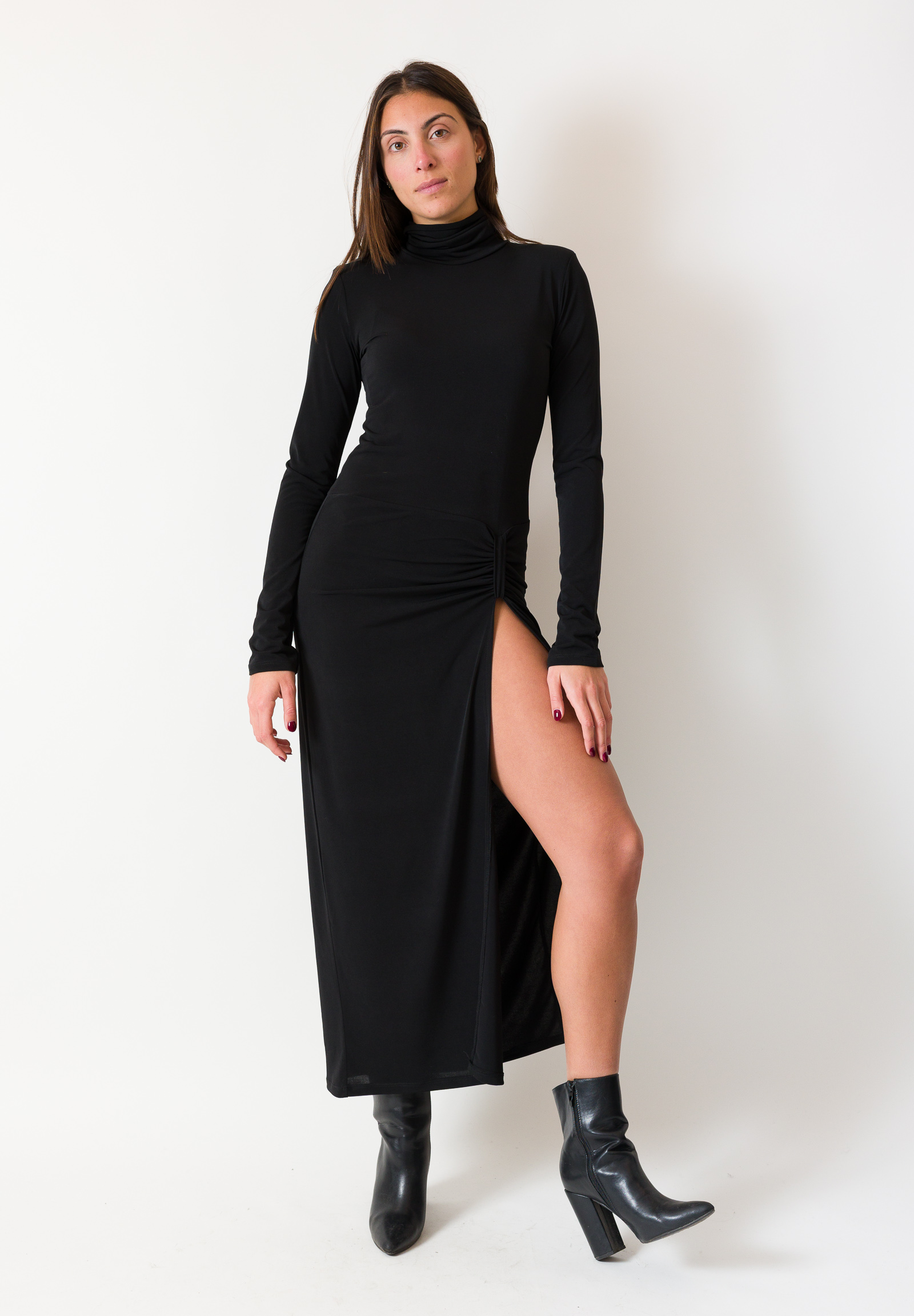 La linea lunga e scivolata slancia la figura, mentre larriccio laterale allaltezza del punto vita crea un effetto modellante che enfatizza le curve. Lo spacco profondo aggiunge un tocco seducente ma sempre raffinato, perfetto per eventi, cene di gala e look da party natalizio.