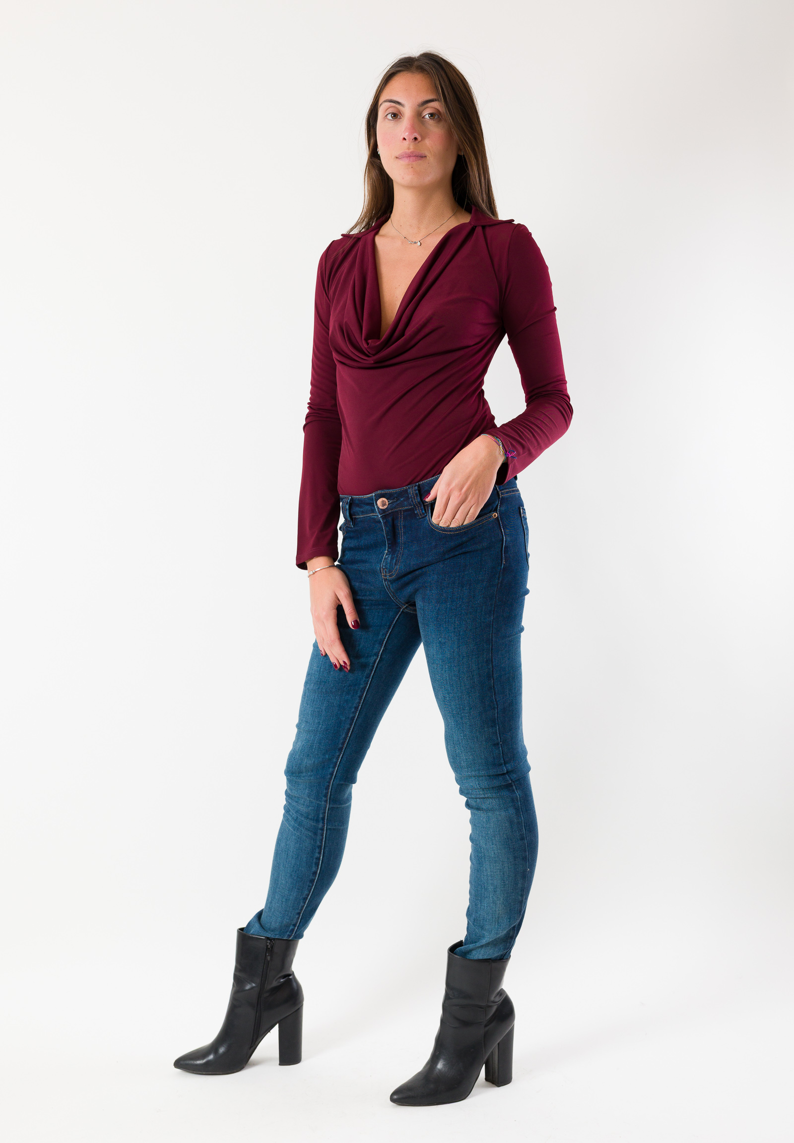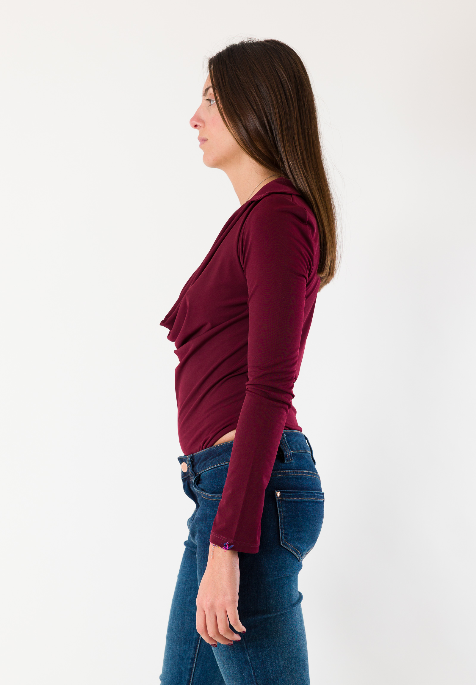 Lo scollo drappeggiato aggiunge un tocco sensuale e sofisticato, ideale da abbinare sia a gonne che a pantaloni per look natalizi femminili e glamour.
