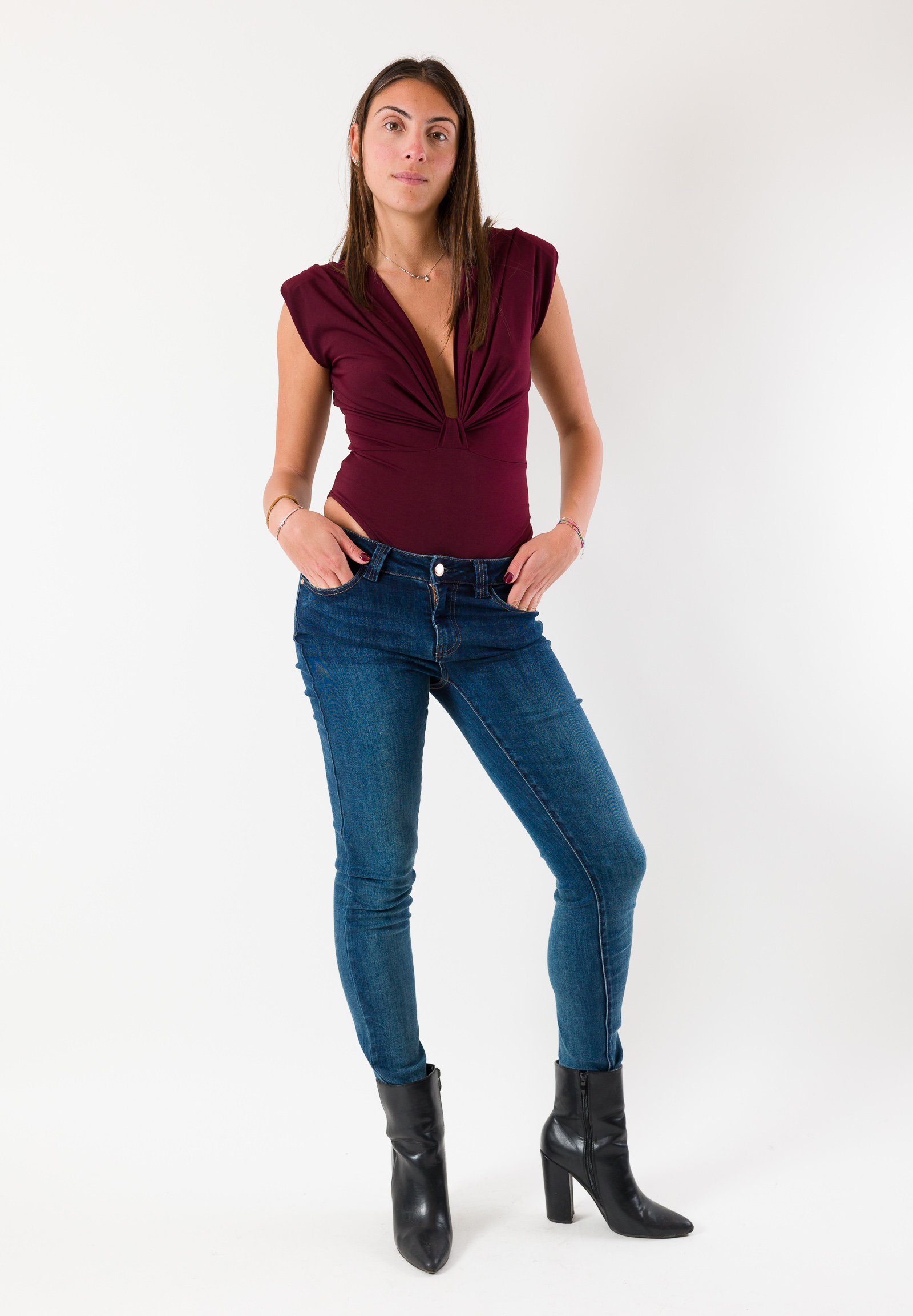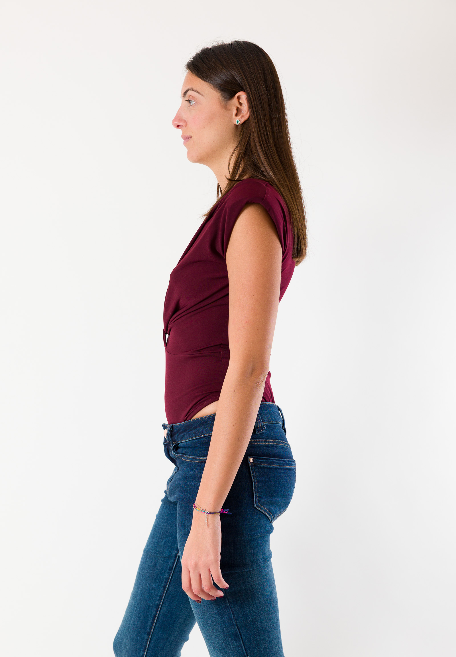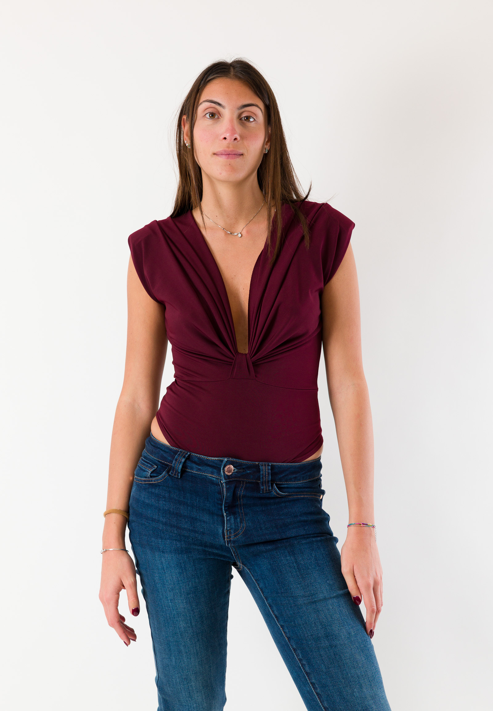 Caratterizzato da un profondo scollo drappeggiato, questo body esalta il décolleté con eleganza senza risultare eccessivo.