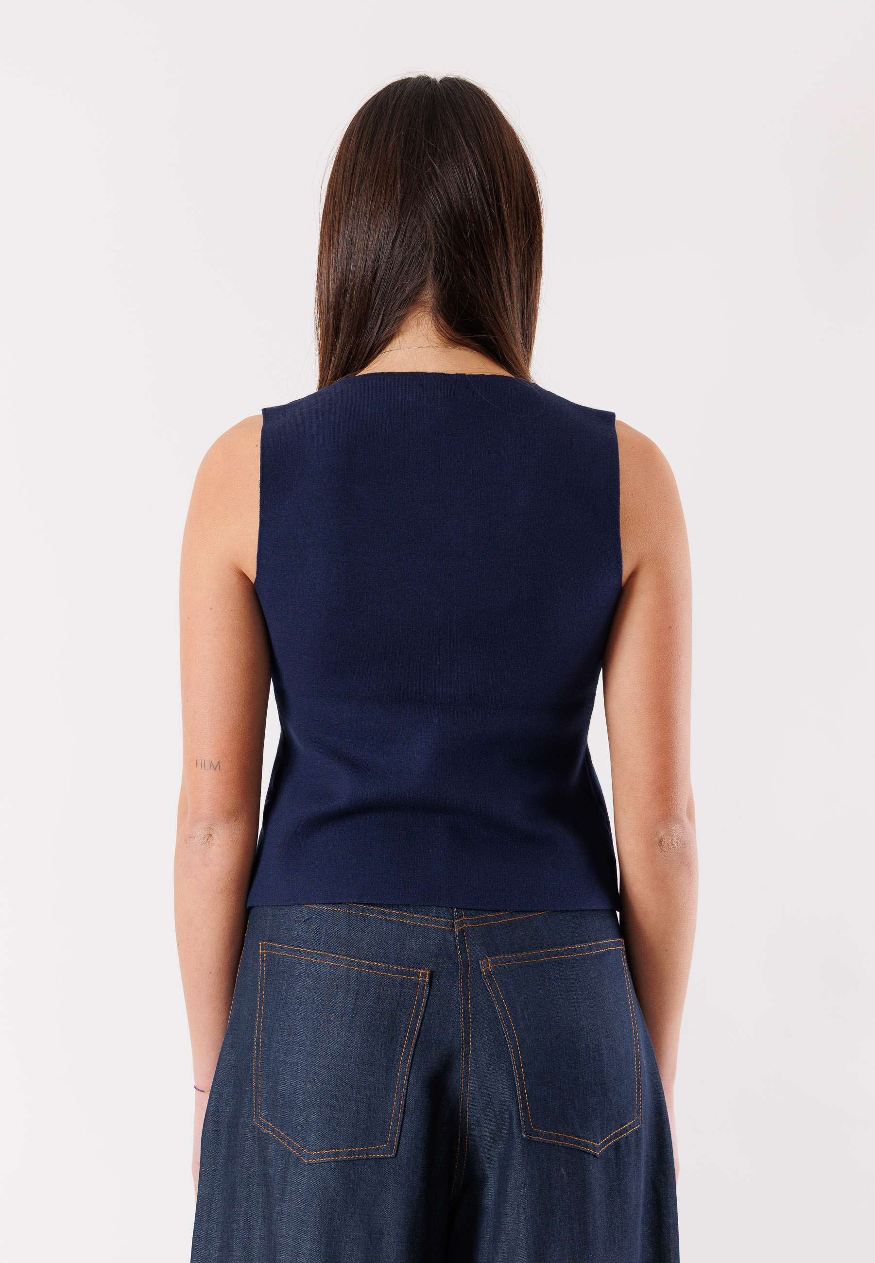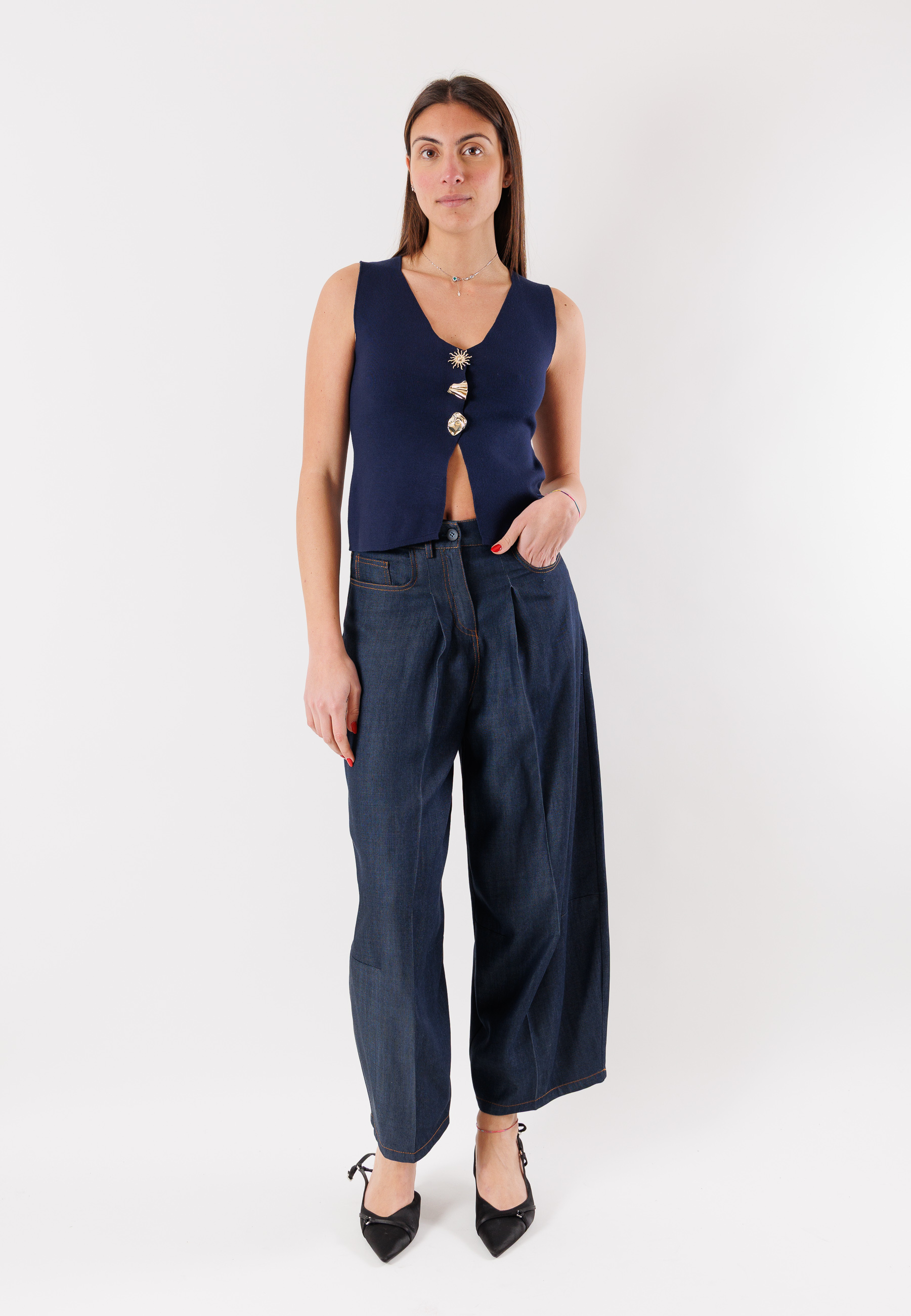 Realizzato in un tessuto fluido e leggero, questo gilet garantisce comfort e una vestibilità piacevole, adattandosi con naturalezza al corpo. Estremamente versatile, ideale da abbinare a pantaloni coordinati, jeans o gonne per creare look casual chic o più sofisticati.