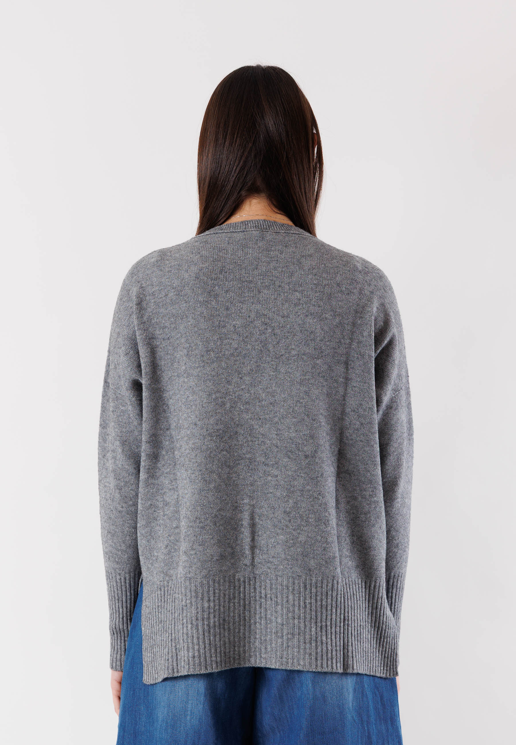 I polsini, lorlo e lo scollo sono rifiniti con maglia a costine che dona struttura al capo, mentre il fondo asimmetrico con spacchetti laterali aggiunge un tocco contemporaneo.