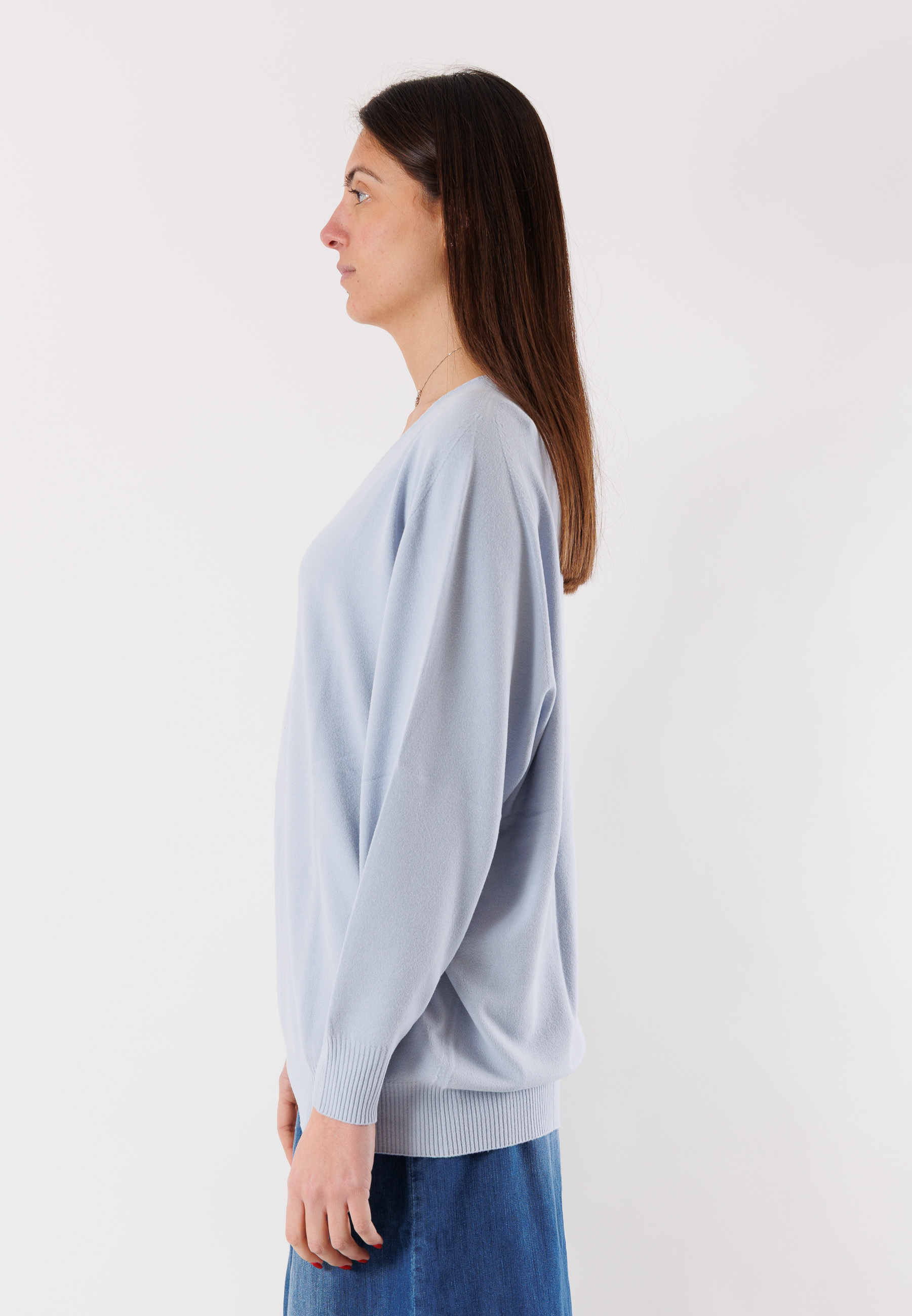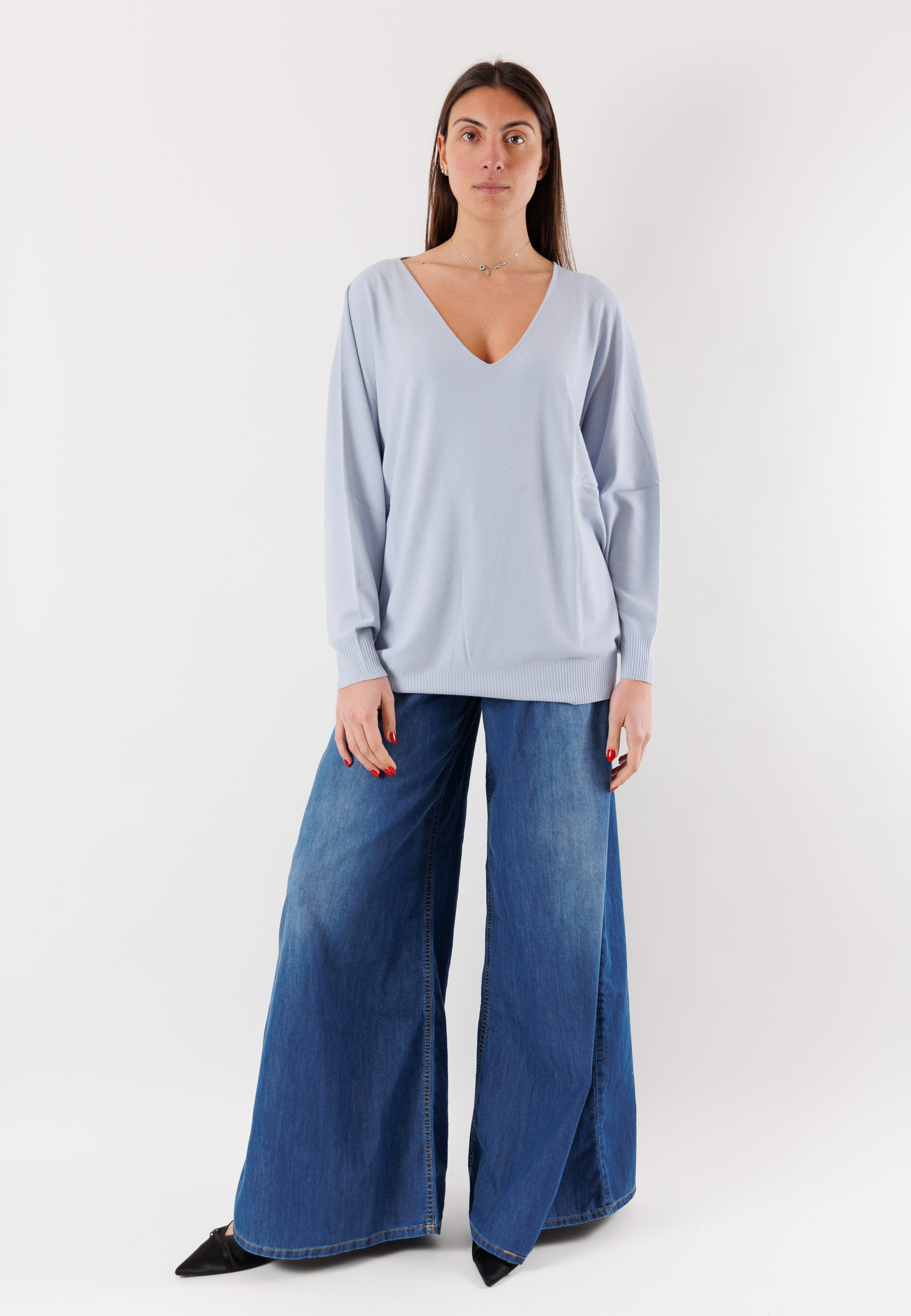 Il design con scollo a V valorizza il décolleté e rende il capo versatile, perfetto sia con jeans che con gonne a vita alta.