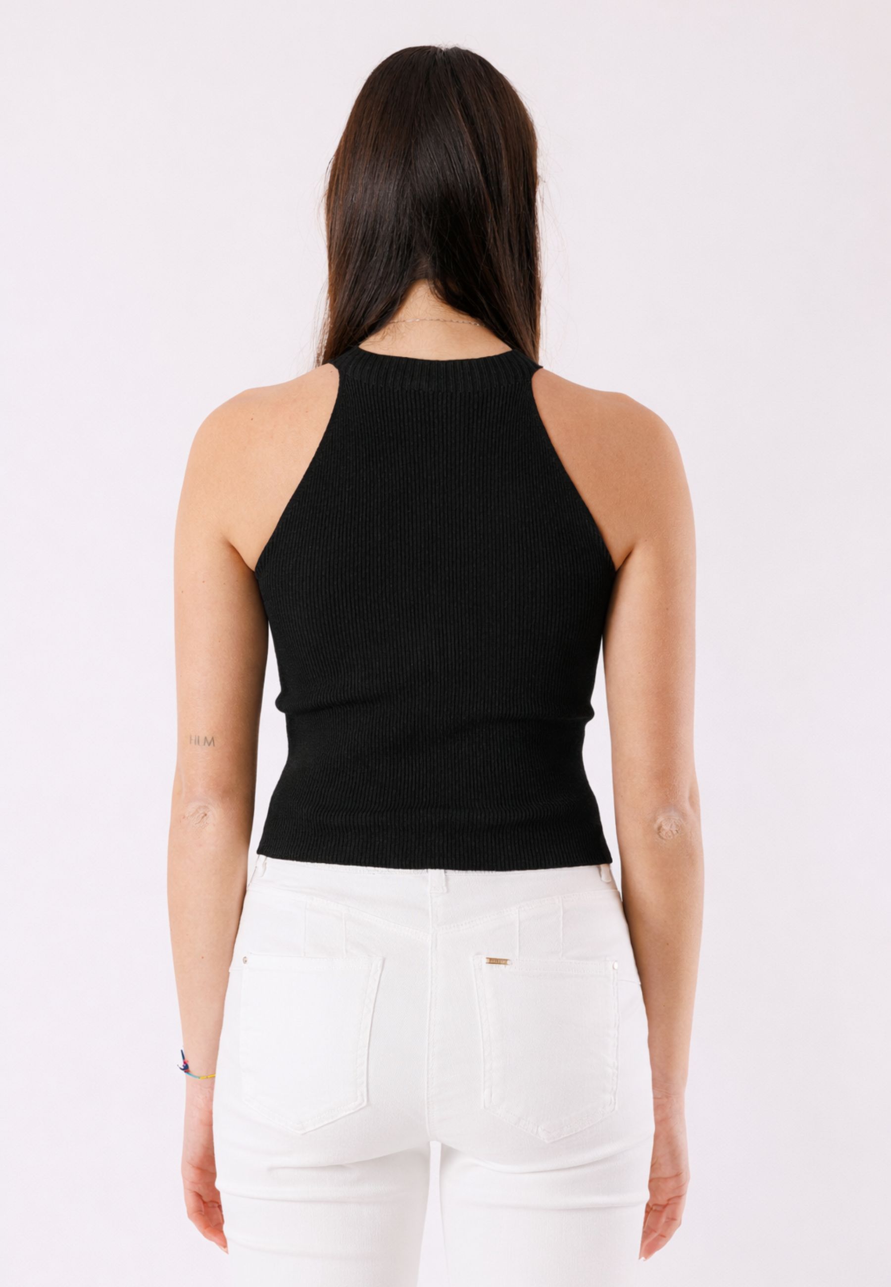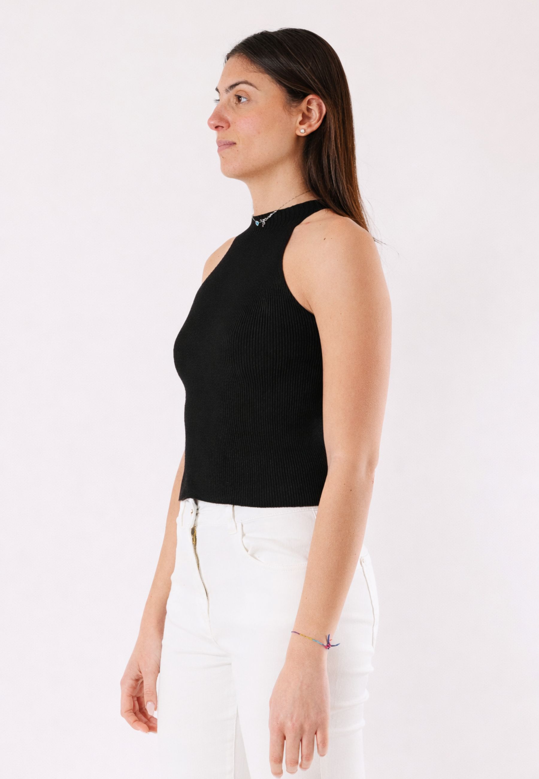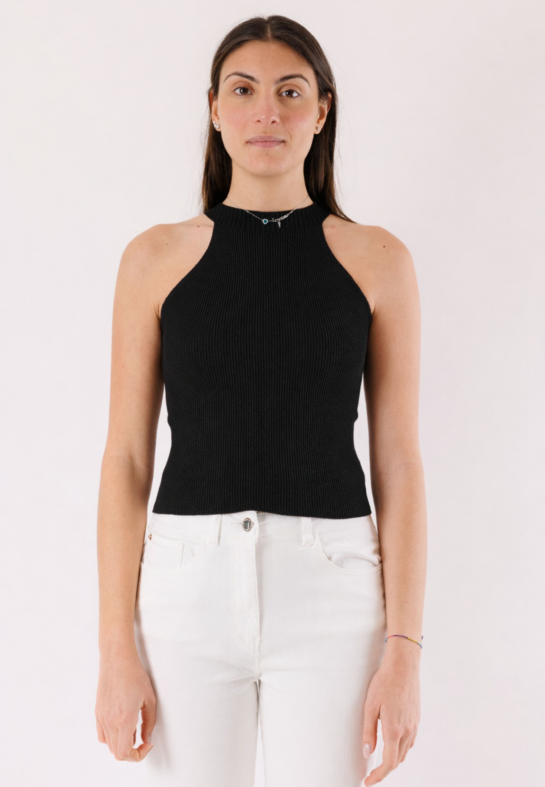 Questo top Kontatto è un capo essenziale e versatile, perfetto per creare outfit moderni e minimal. Il design presenta una linea aderente che valorizza naturalmente la silhouette e una scollatura morbida e sagomata, pensata per donare equilibrio e raffinatezza allinsieme. Il taglio senza maniche lo rende ideale per la stagione calda oppure come base da indossare sotto giacche, cardigan e blazer.