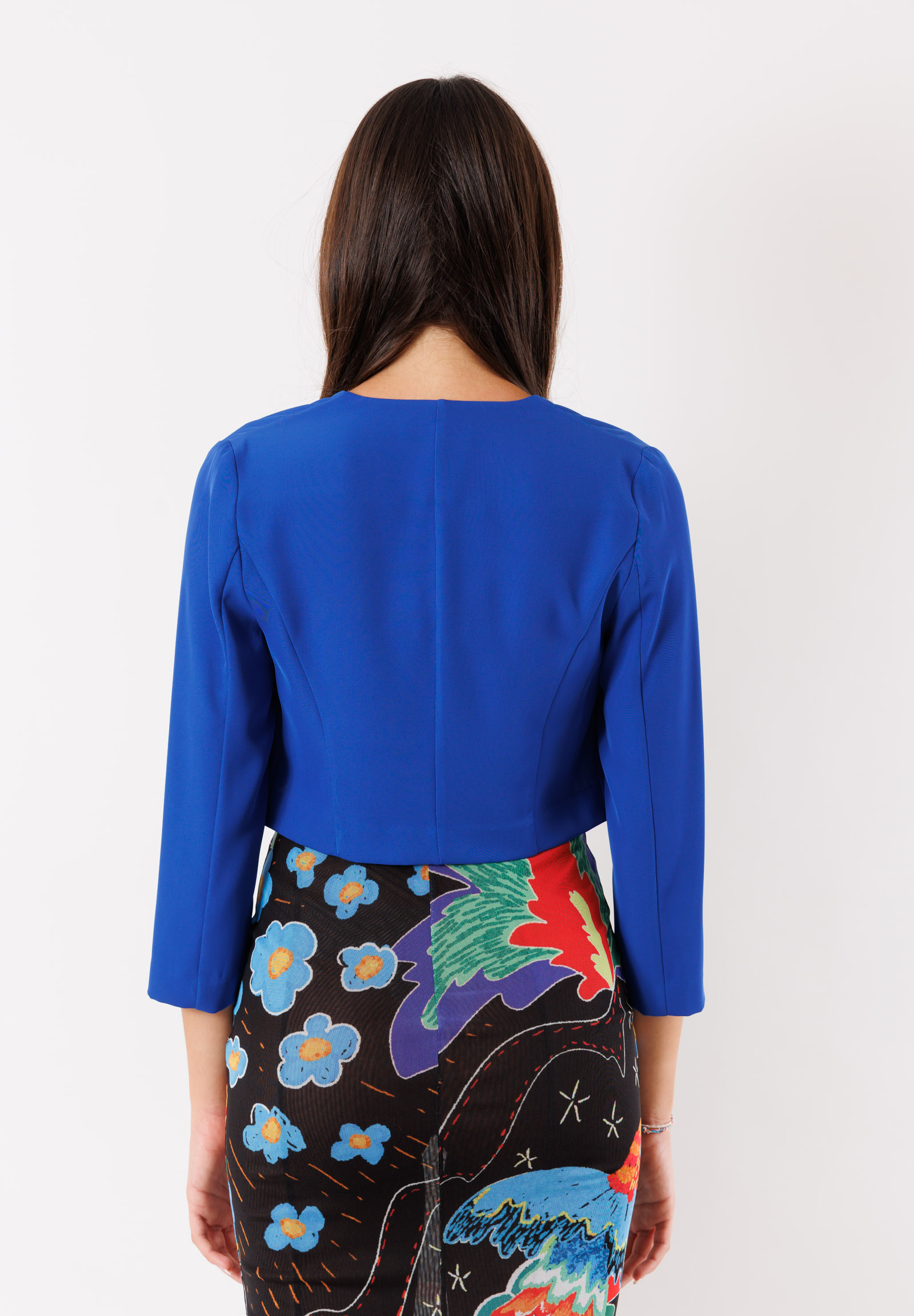 Il design corto e la vestibilità regolare lo rendono perfetto da indossare sopra abiti o top, sia per occasioni speciali che per look quotidiani più sofisticati. Le maniche lunghe e la chiusura frontale aperta donano movimento e leggerezza, completando il look con stile e semplicità.