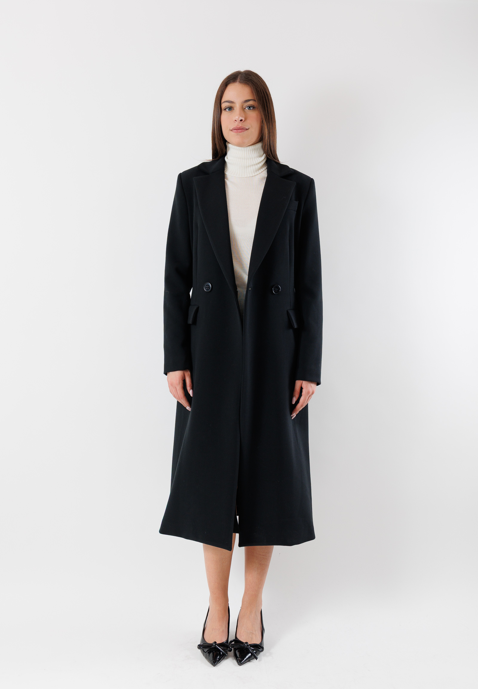 Il design presenta un taglio sartoriale con revers classico, chiusura doppiopetto e tasche laterali a filetto, elementi che conferiscono al capo uno stile sobrio ma sofisticato. La lunghezza sotto al ginocchio lo rende perfetto da abbinare sia a pantaloni eleganti che a stivali alti, per un look impeccabile in ogni occasione.