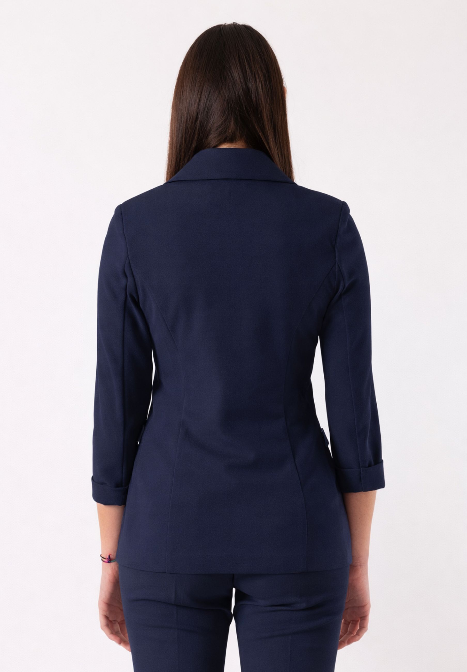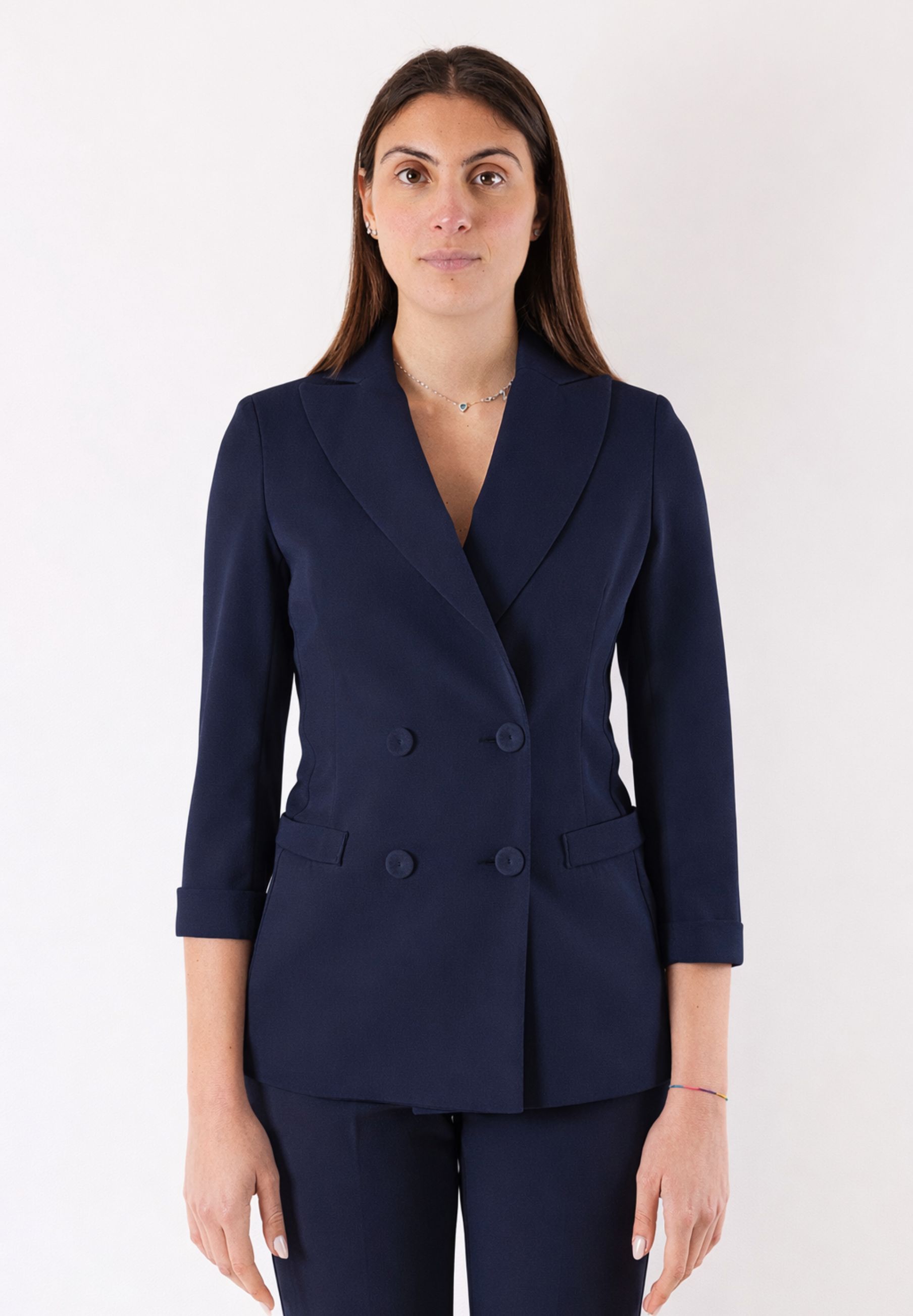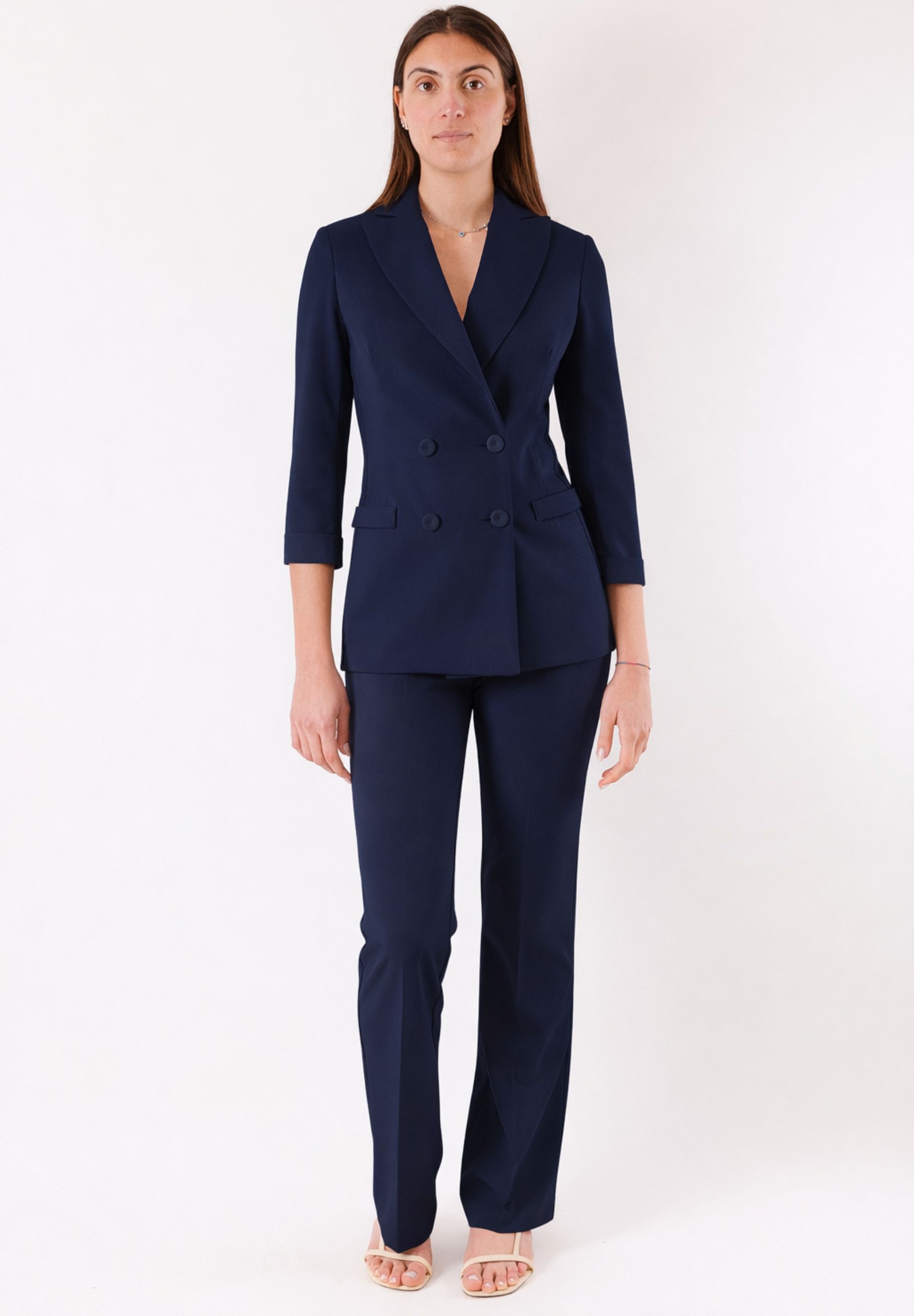 La giacca dal taglio raffinato si abbina armoniosamente al pantalone coordinato, creando una silhouette elegante e femminile. Questo completo è pensato per valorizzare la figura ed è adatto sia a contesti professionali che a occasioni formali o smart casual.