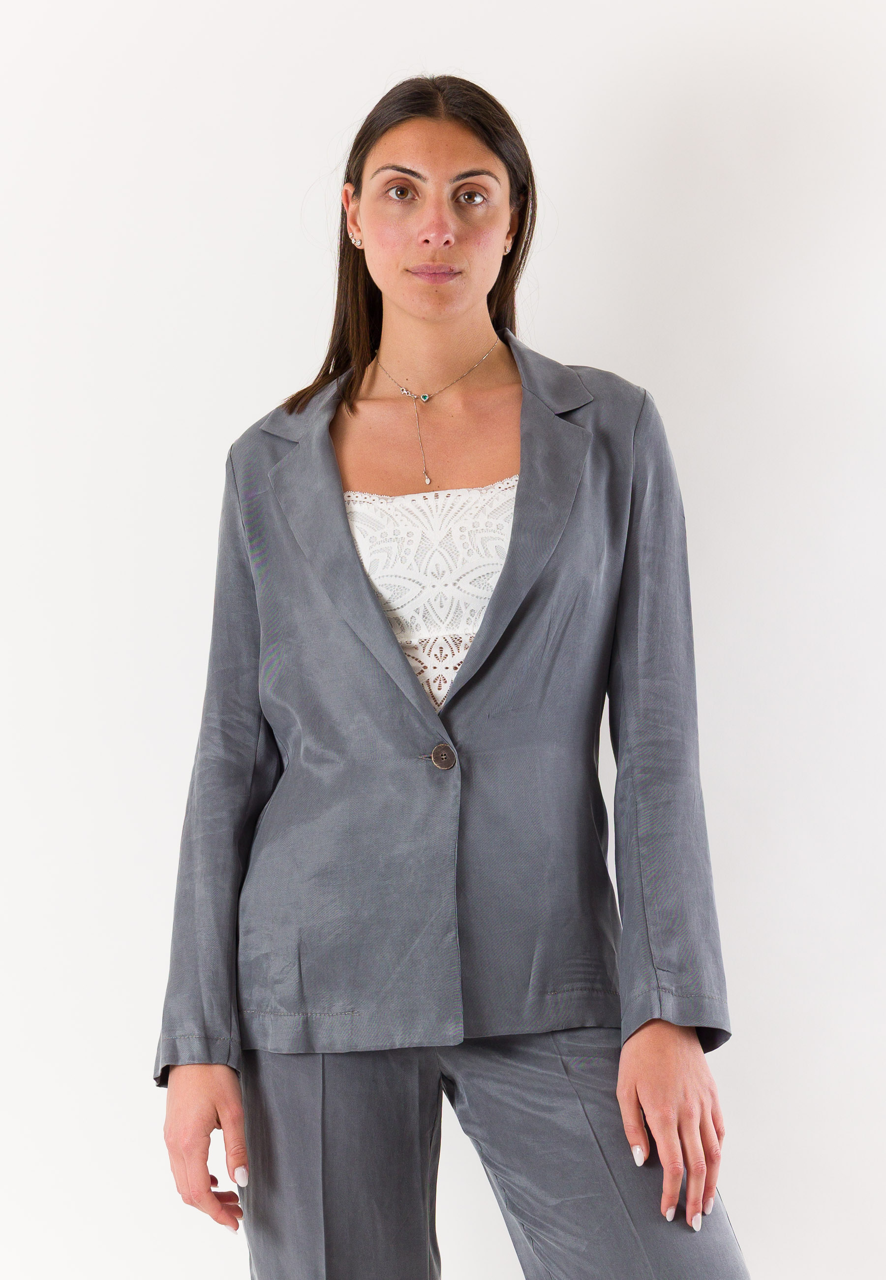 Essenziale ed elegante, questa giacca Mesange a 1 bottone è un capo sartoriale pensato per completare look raffinati e contemporanei. Realizzata in Italia e confezionata in 100% lyocell, offre una texture morbida, fluida e piacevole al tatto, ideale per garantire comfort e vestibilità durante tutta la giornata. Il design presenta una chiusura frontale con un bottone, rever classico e una linea leggermente sagomata che valorizza la silhouette senza costringerla. Le maniche lunghe e il taglio pulito rendono la giacca estremamente versatile, perfetta da abbinare a pantaloni coordinati, gonne o denim. Un capo elegante e moderno firmato Mesange Made in Italy.