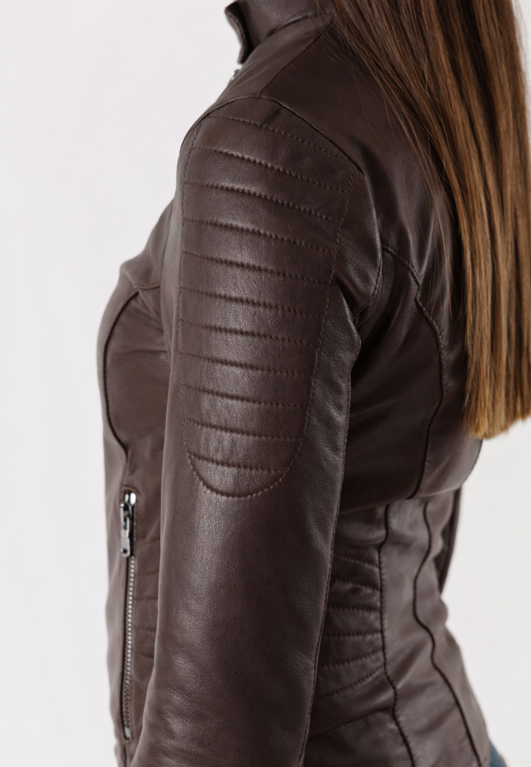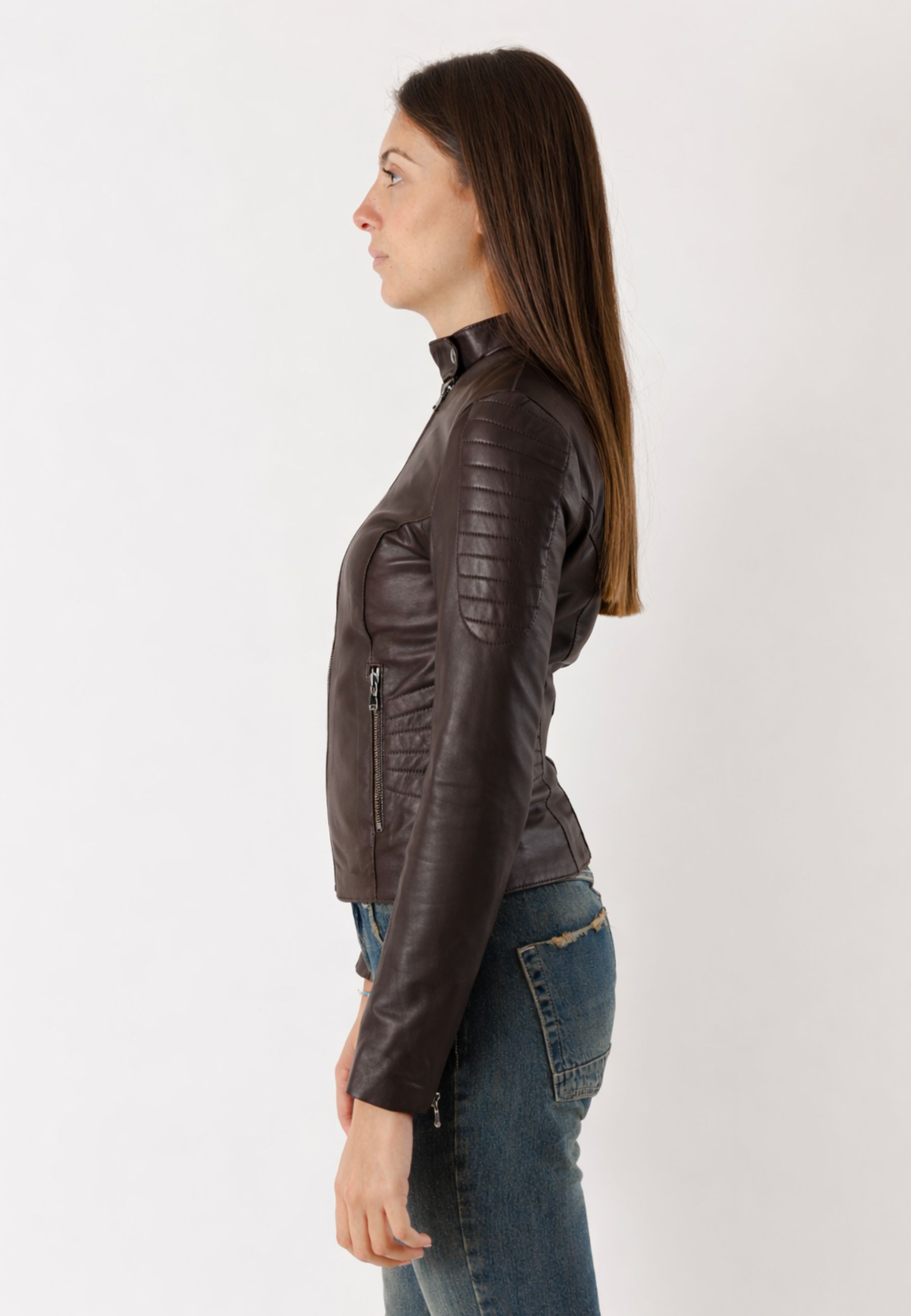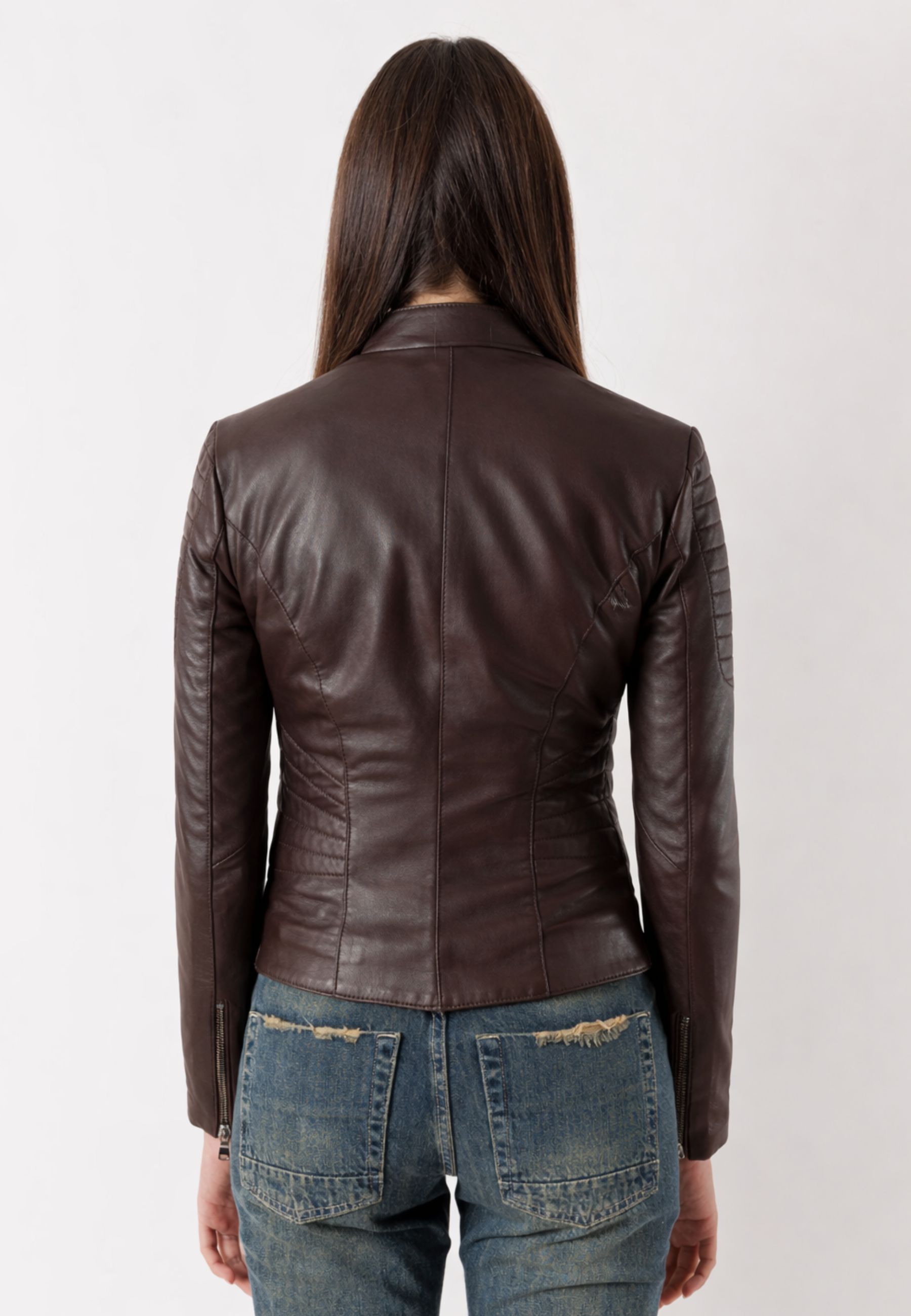 Giacca in vera pelle nera da donna coniuga uno stile deciso con dettagli raffinati. Il design aderente e strutturato valorizza la silhouette, mentre il collo alto conferisce un tocco grintoso e contemporaneo.