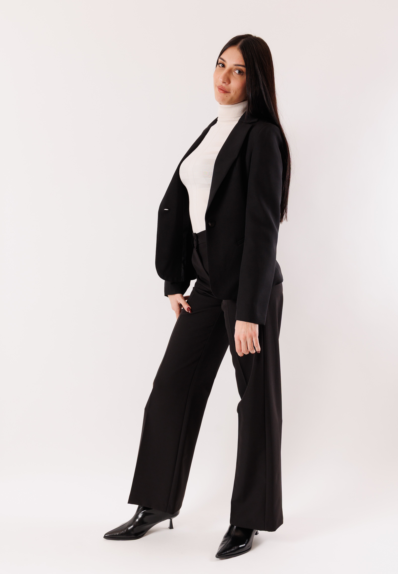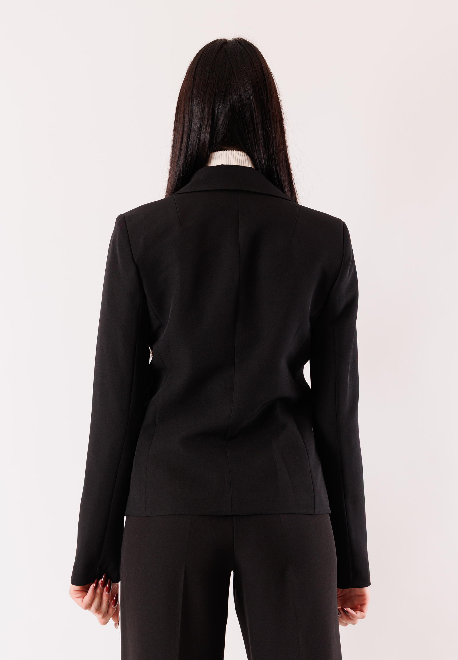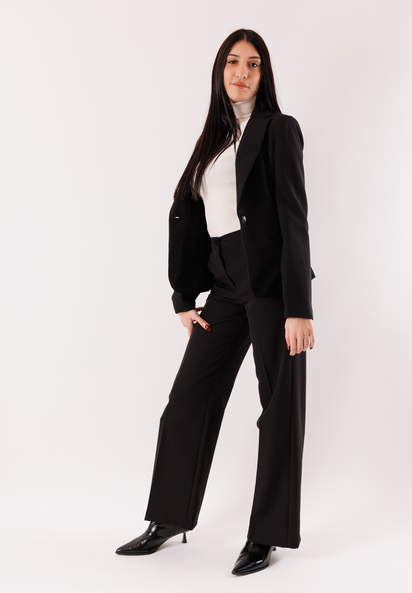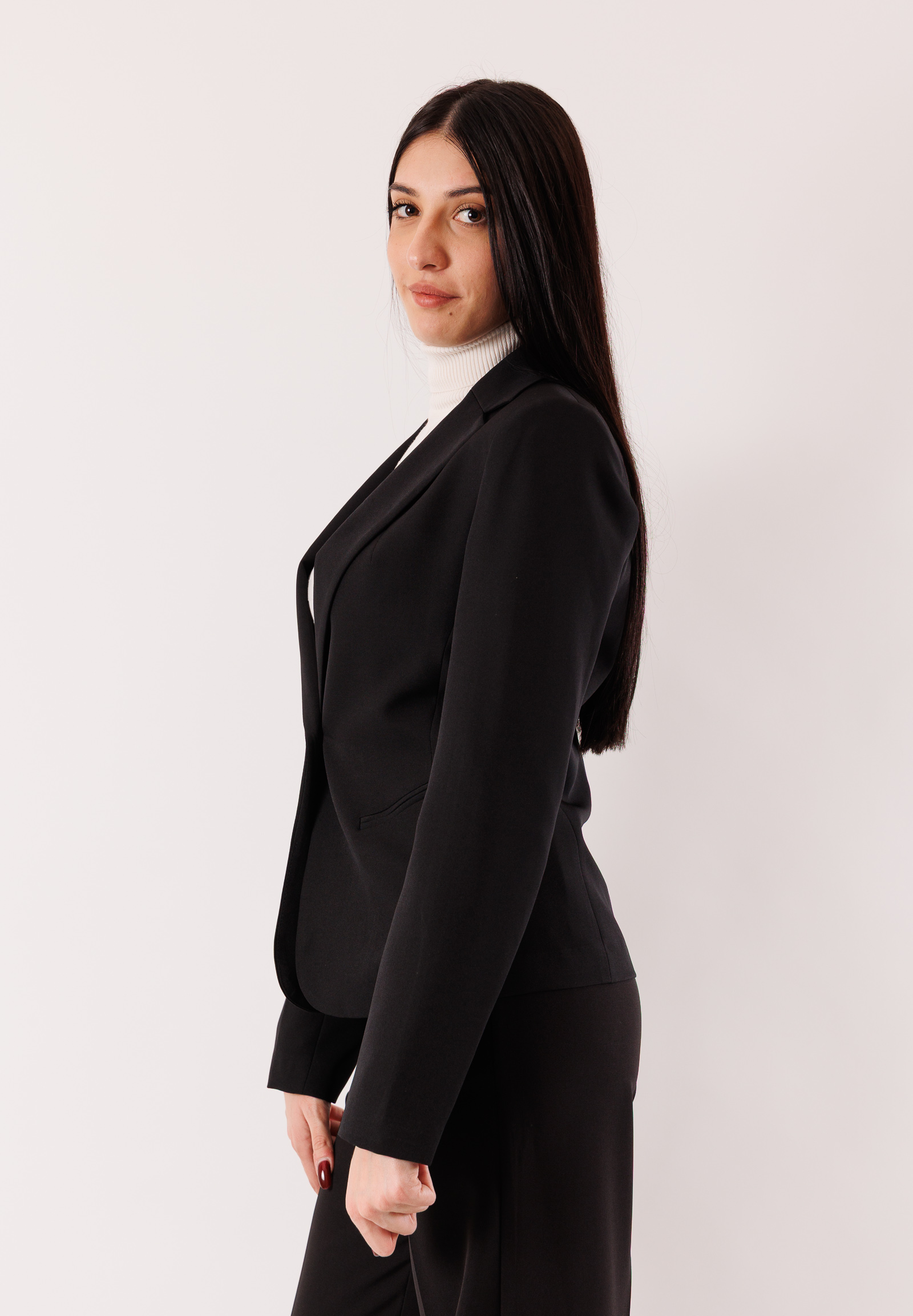 Il modello presenta un revers classico, chiusura con bottone singolo e linee sagomate che valorizzano la figura femminile. Ideale da abbinare a pantaloni coordinati per un completo elegante o a jeans per un look casual chic, questa giacca è un must-have versatile per la stagione.