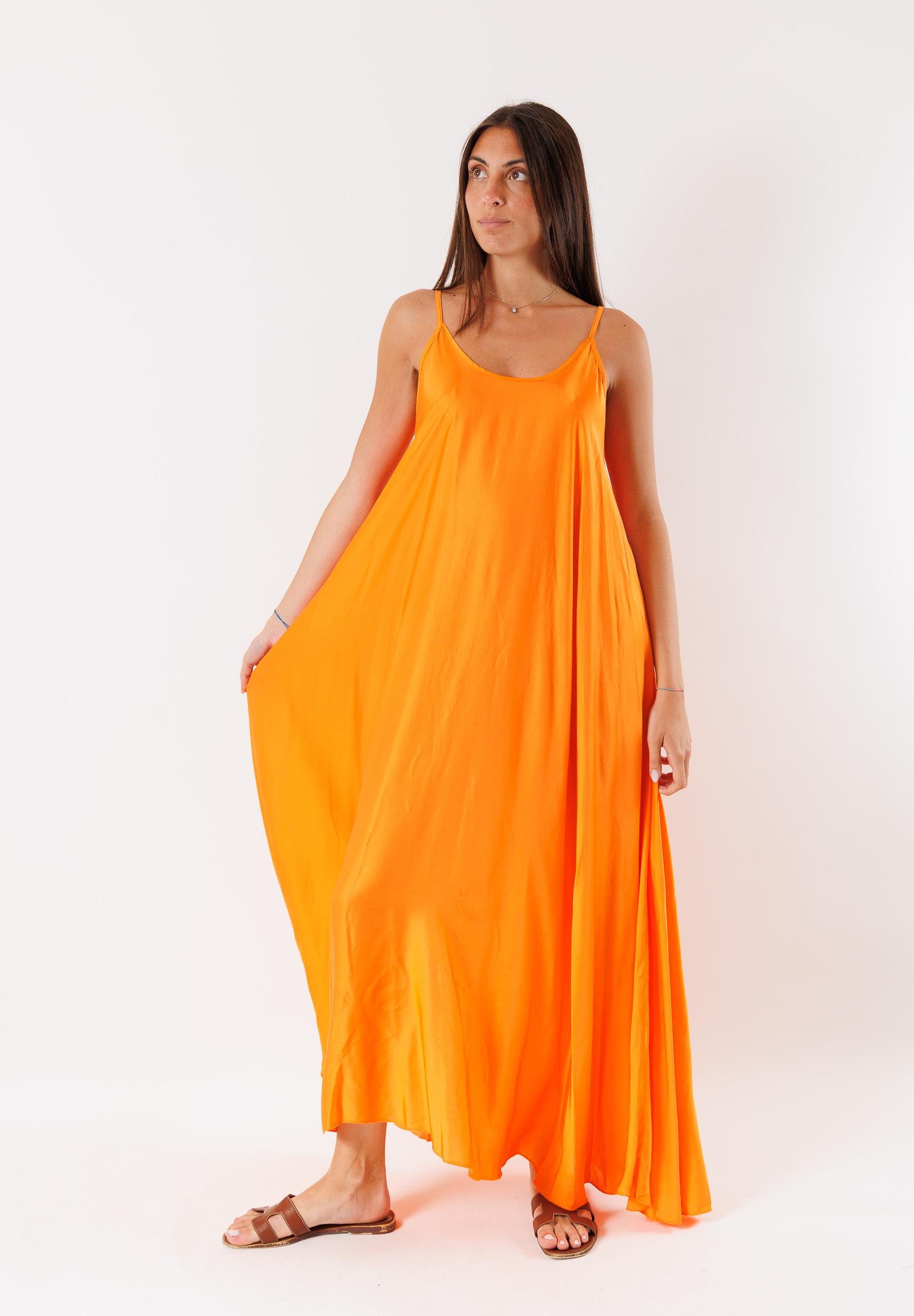 Perfetto per la stagione estiva. Le spalline sottili e lo scollo arrotondato valorizzano la silhouette con leggerezza e movimento, mentre il tessuto leggero e brillante scivola delicatamente sul corpo.