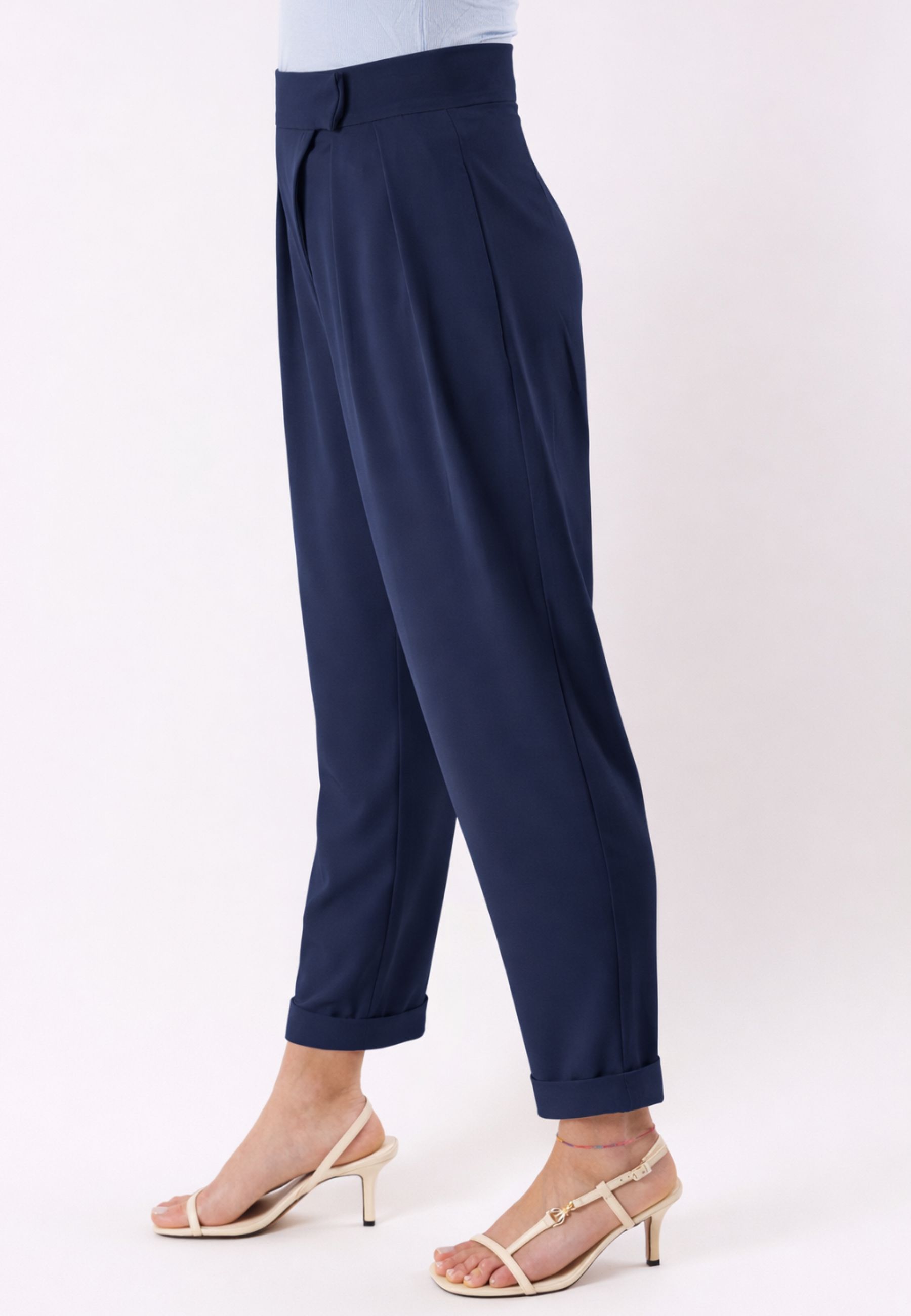 Il modello è caratterizzato da pannelli frontali con pieghe morbide, un dettaglio sartoriale che conferisce volume nella parte superiore e un effetto raffinato e contemporaneo. La linea è leggermente affusolata verso il fondo, creando un equilibrio perfetto tra comfort e stile. La vita liscia rende questi pantaloni ideali da abbinare a top aderenti, camicie o bluse, per look casual chic o più formali.