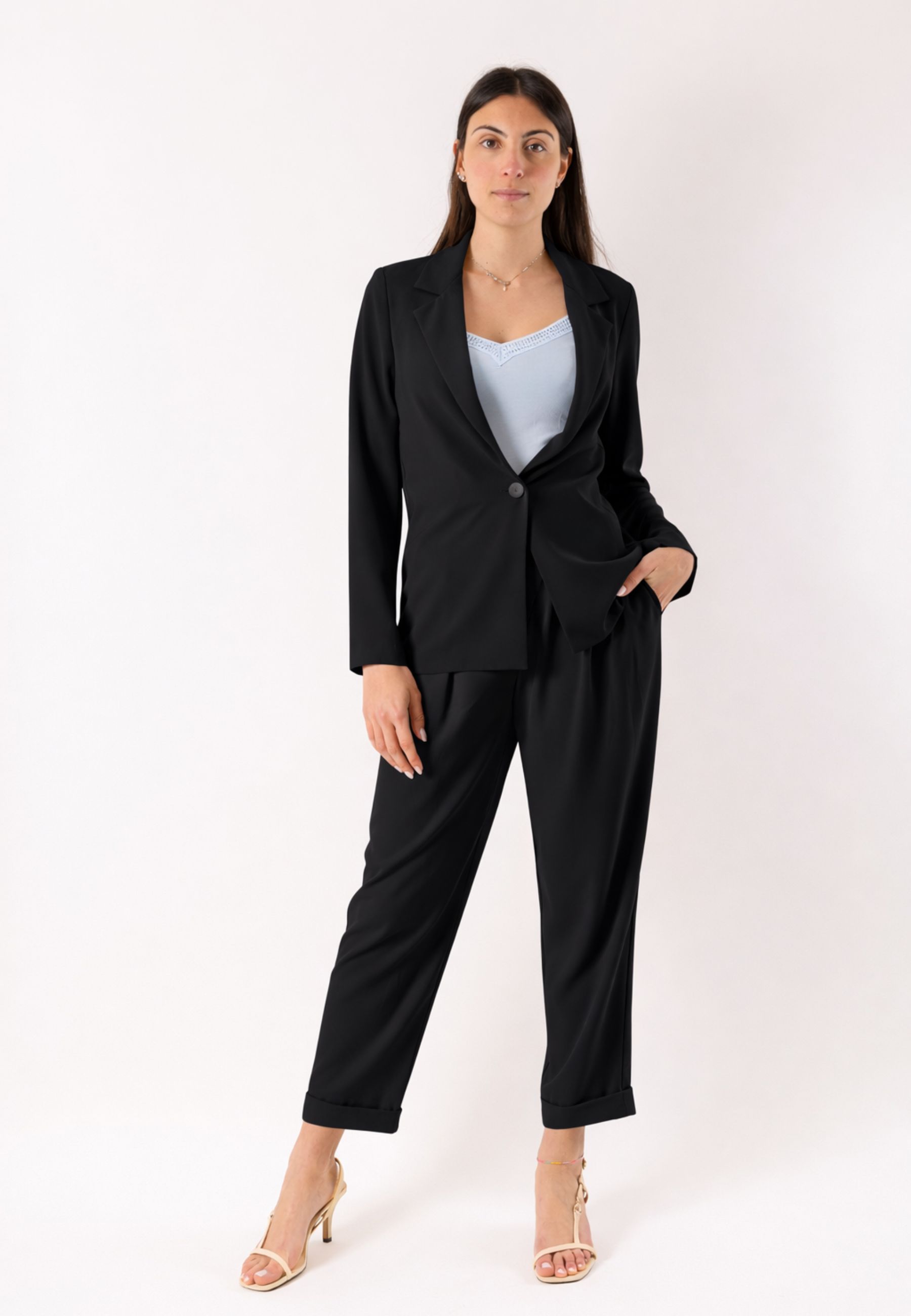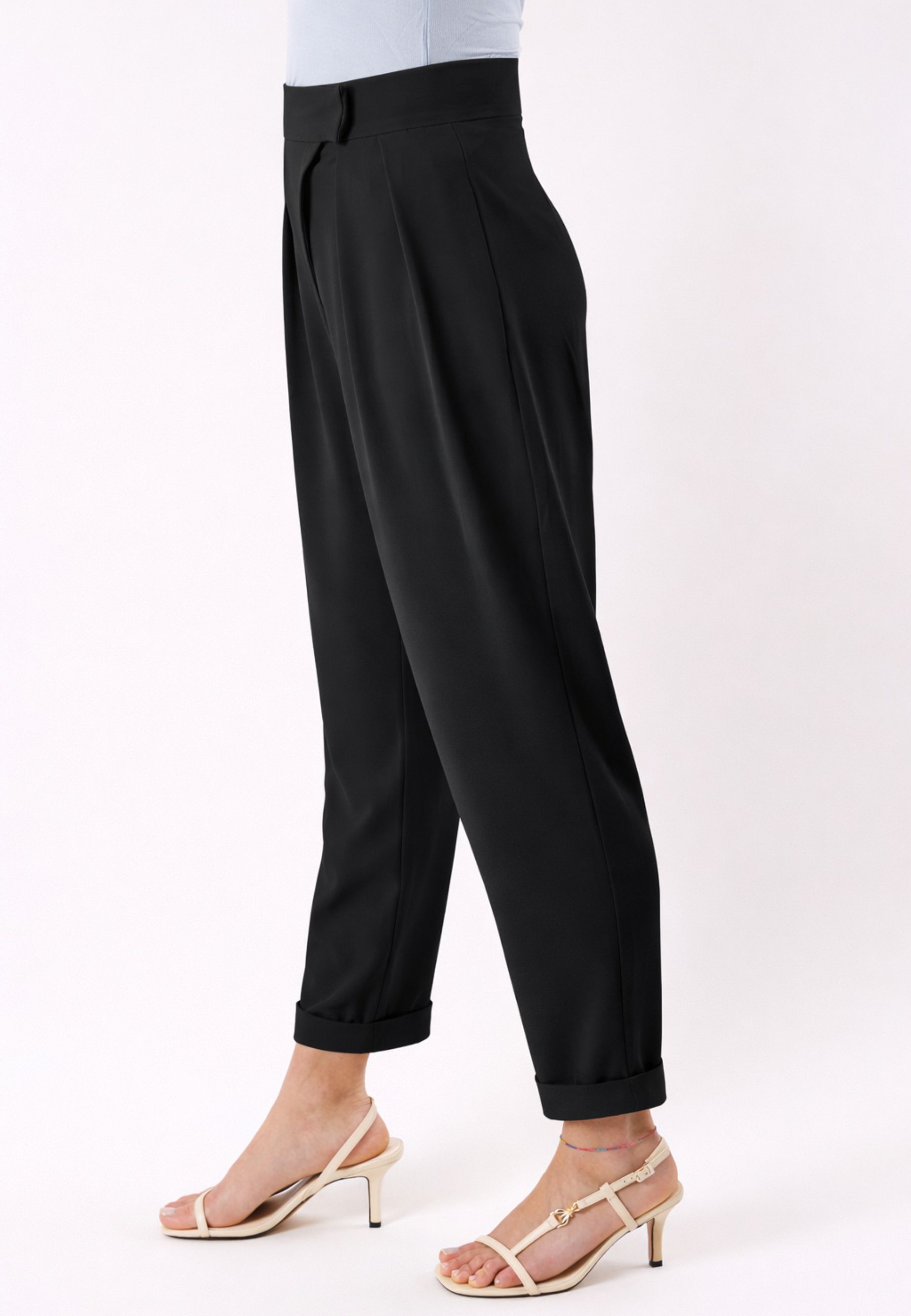Il modello è caratterizzato da pannelli frontali con pieghe morbide, un dettaglio sartoriale che conferisce volume nella parte superiore e un effetto raffinato e contemporaneo. La linea è leggermente affusolata verso il fondo, creando un equilibrio perfetto tra comfort e stile. La vita liscia rende questi pantaloni ideali da abbinare a top aderenti, camicie o bluse, per look casual chic o più formali.