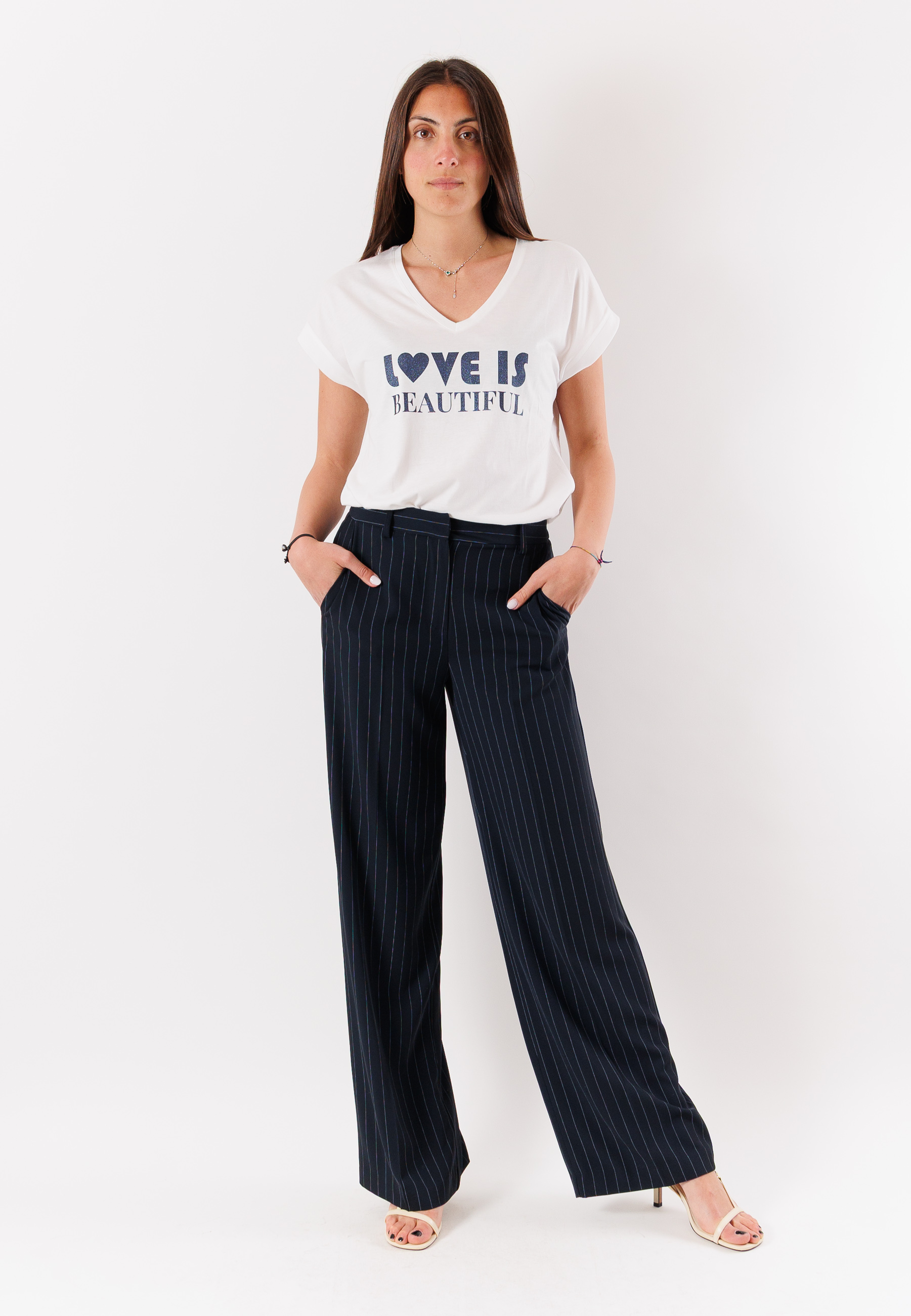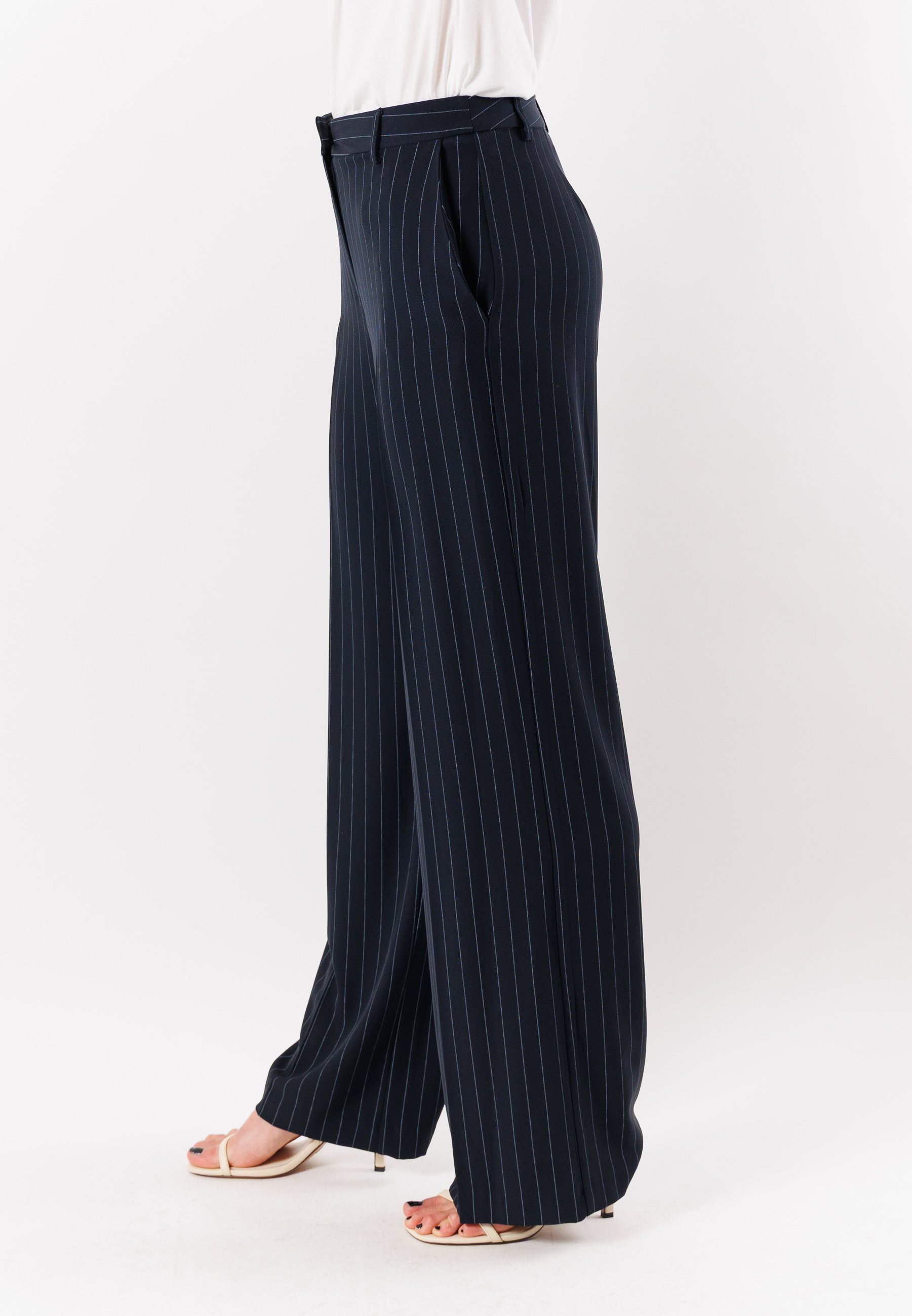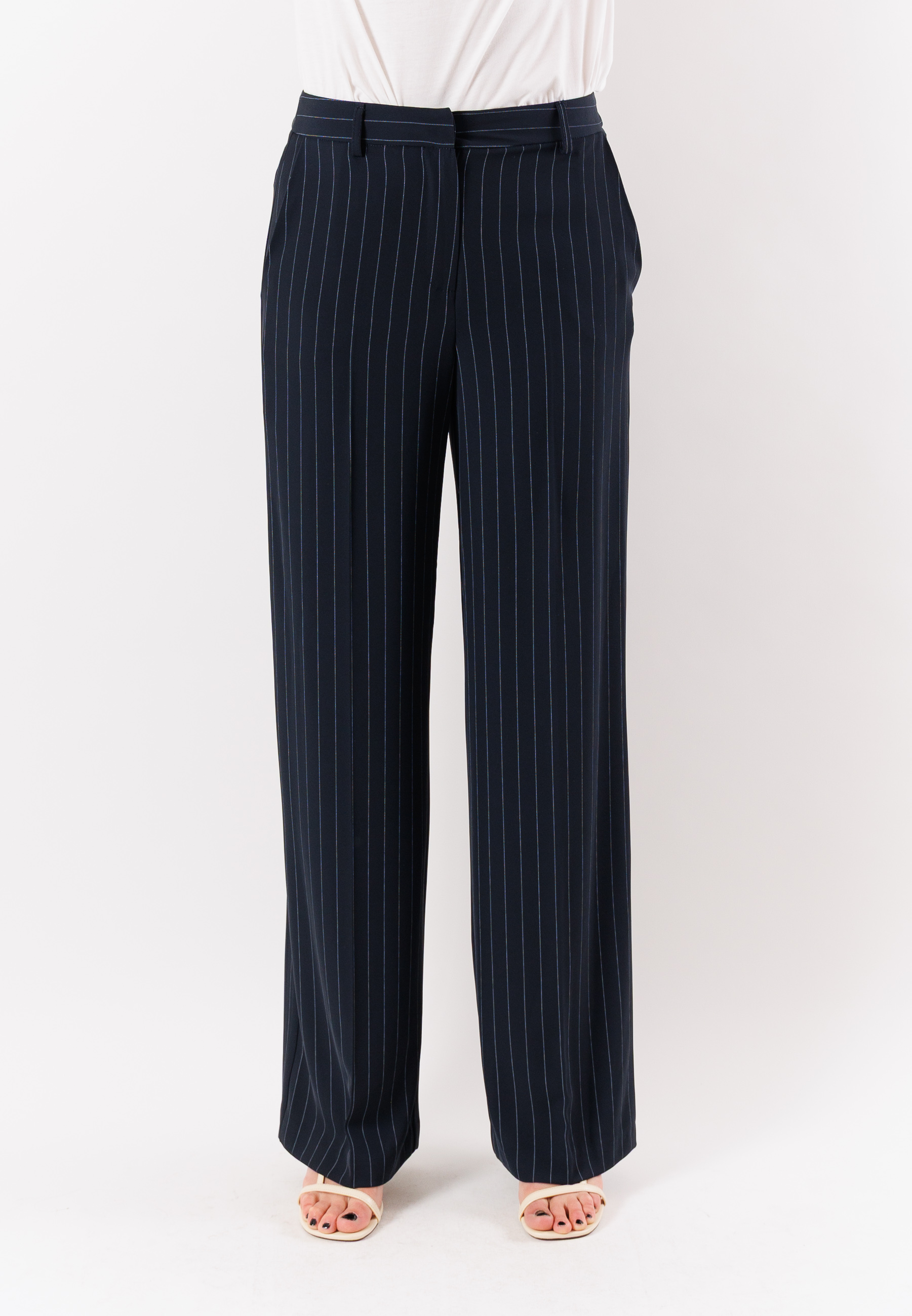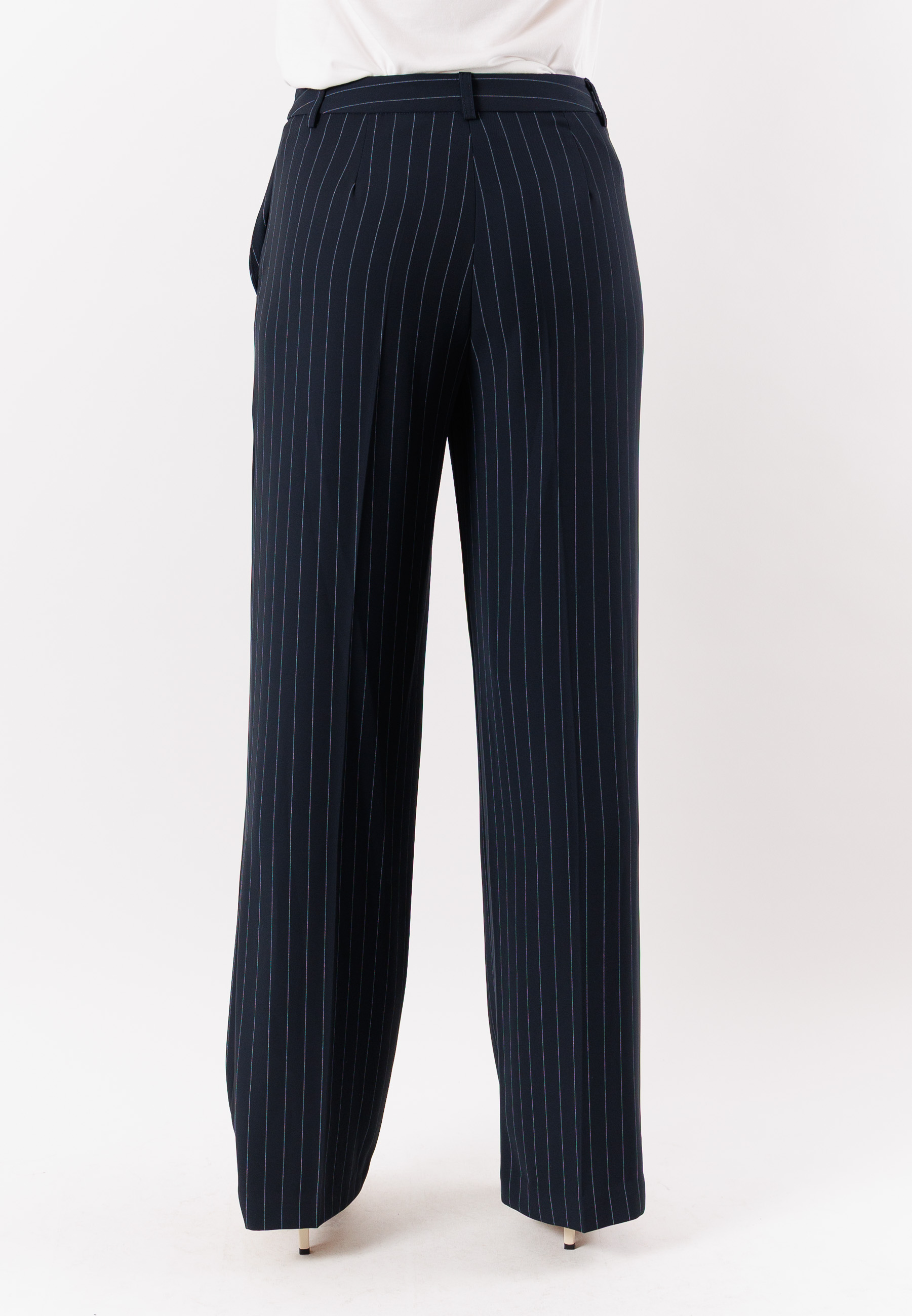 Il design è caratterizzato dal classico motivo gessato, simbolo di eleganza senza tempo, capace di slanciare visivamente la silhouette. Il modello presenta una vita regolare, una gamba dritta e lunga e una linea pulita che garantisce versatilità e stile. Le tasche laterali e le finiture curate completano il capo con unestetica essenziale e sartoriale.