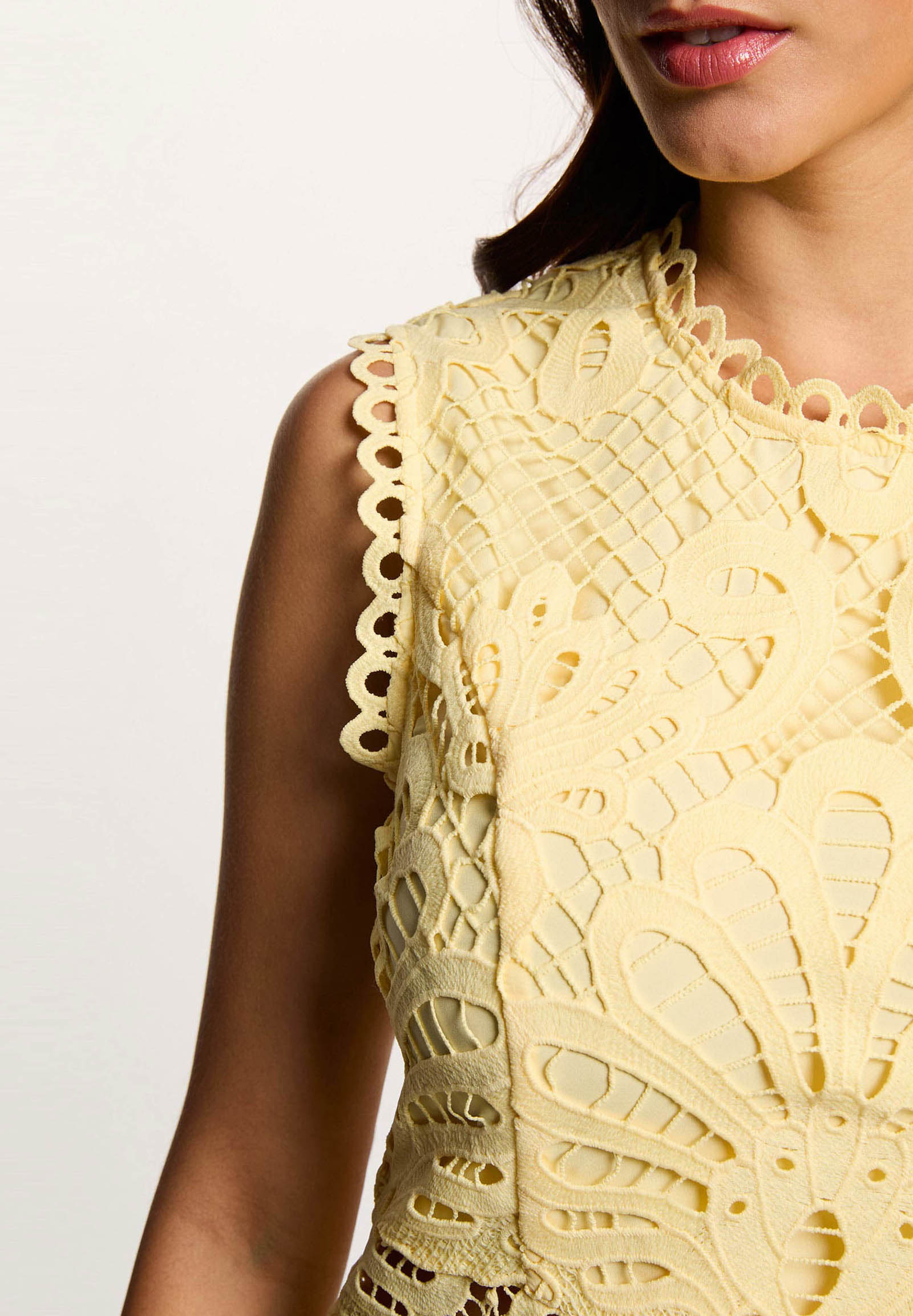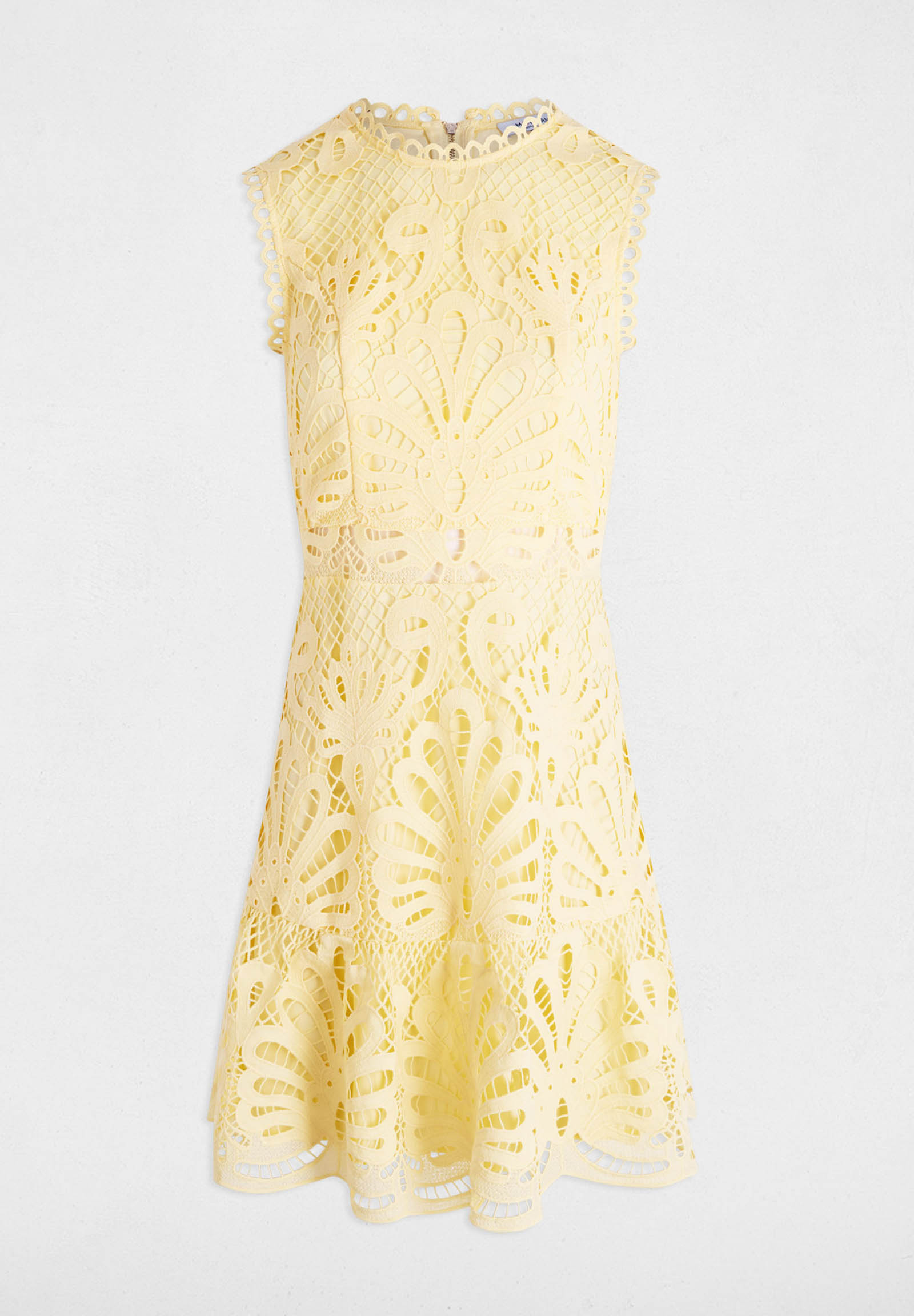 Lo scollo rotondo valorizza la parte superiore con discrezione, mentre le spalline larghe garantiscono stabilità e unestetica pulita. La vita leggermente definita accompagna la silhouette senza costringerla, dando spazio alla gonna svasata che si muove in modo armonioso. Il dettaglio distintivo è il bordo smerlato sul fondo, un elemento che esalta i ricami e aggiunge un tocco prezioso.