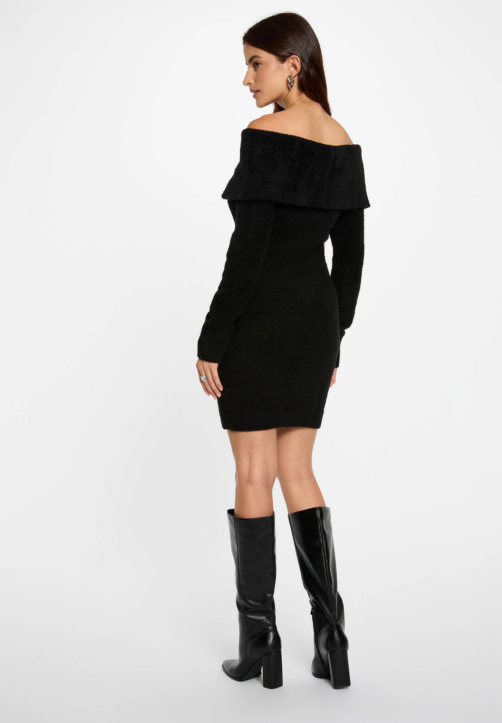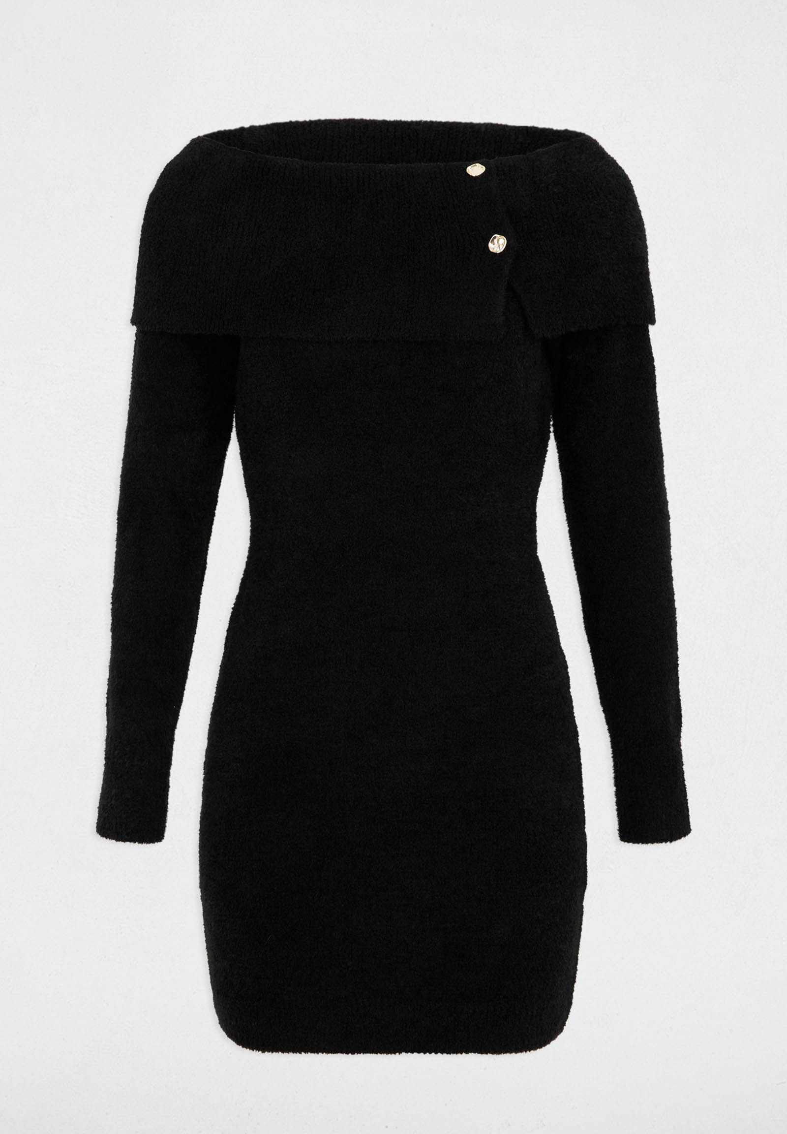 Abito corto con spalle scoperte, perfetto per valorizzare la femminilità con eleganza e modernità. Il design aderente mette in risalto la silhouette, mentre il dettaglio del risvolto superiore con bottoni decorativi dona un tocco raffinato e glamour.