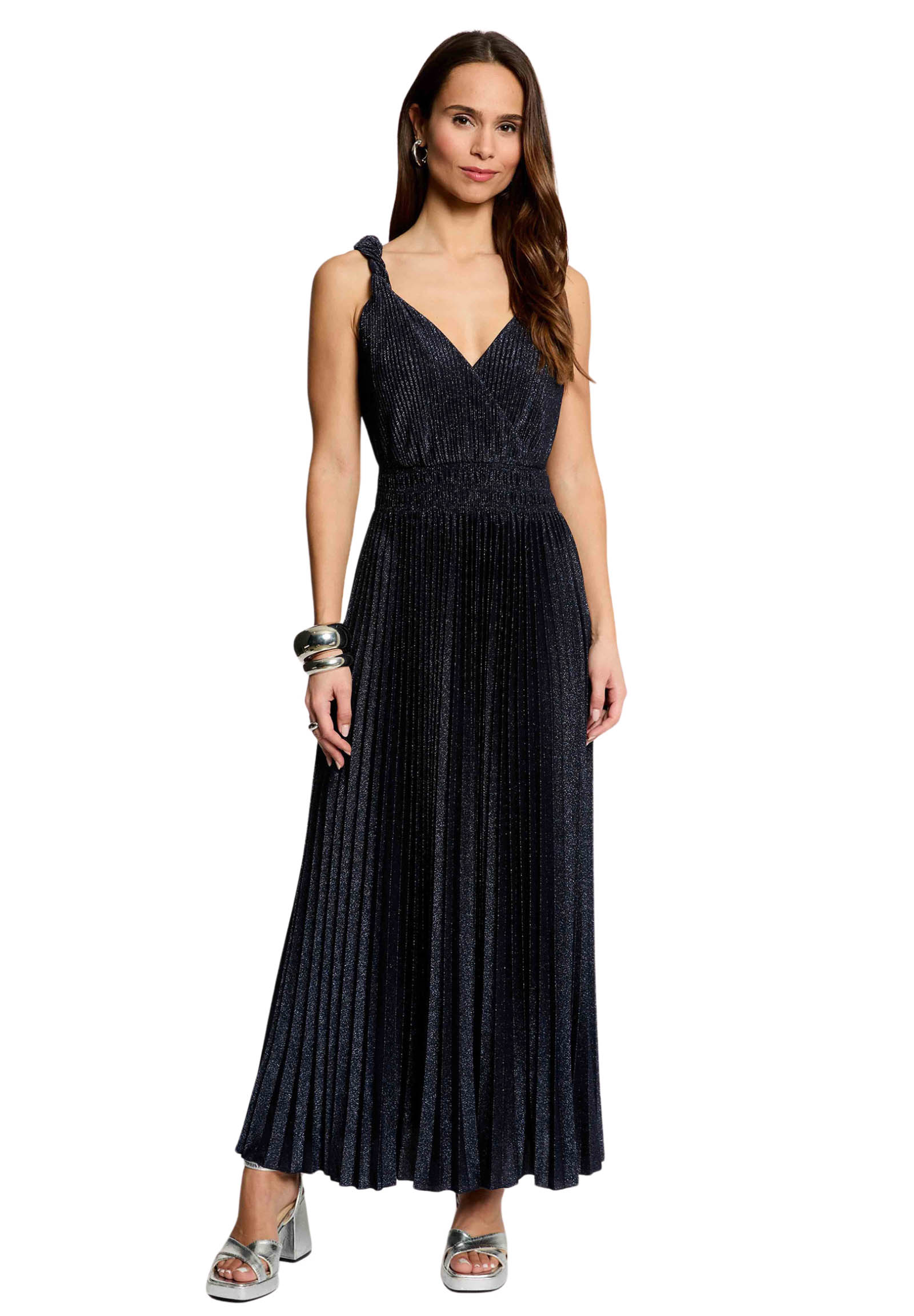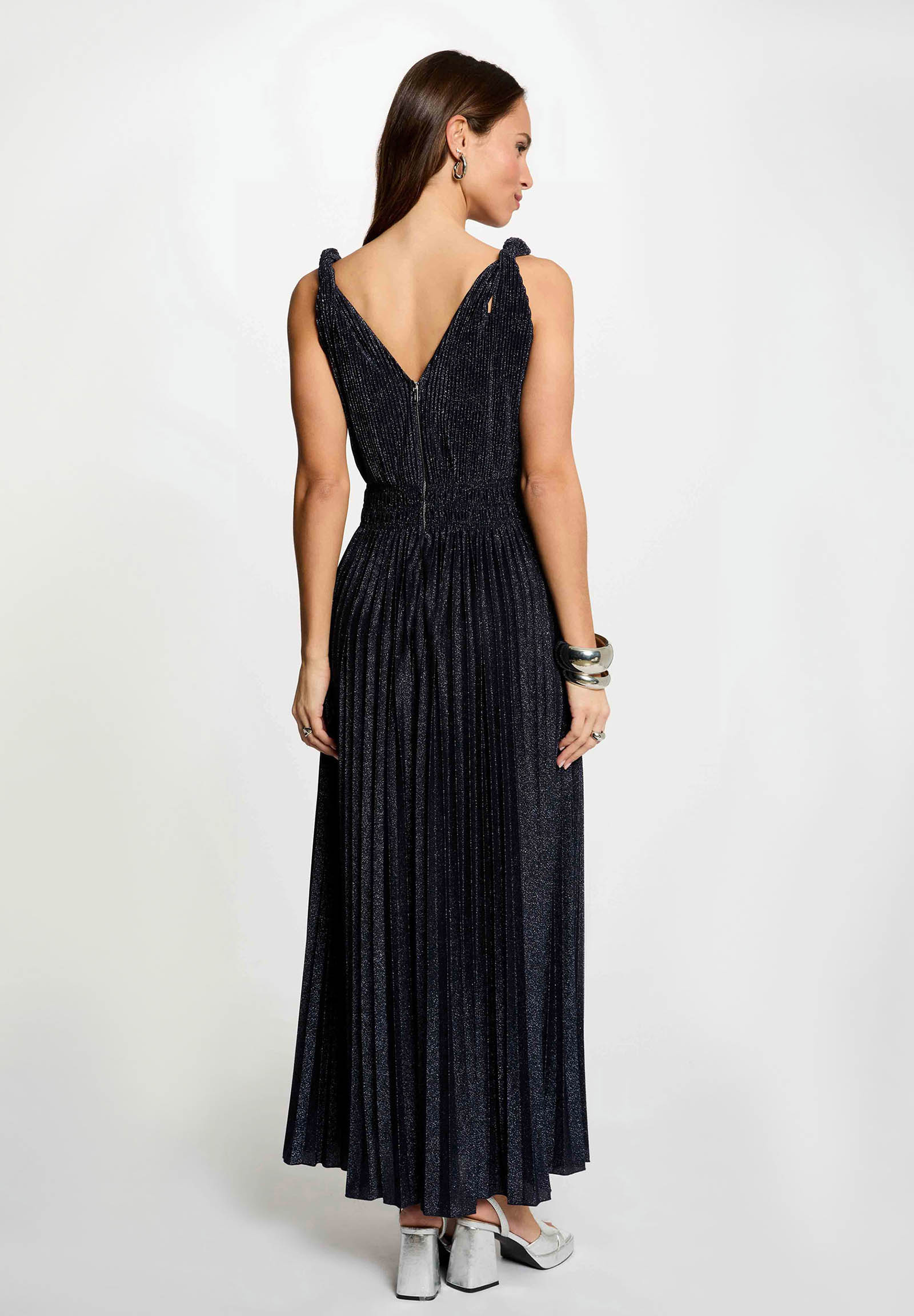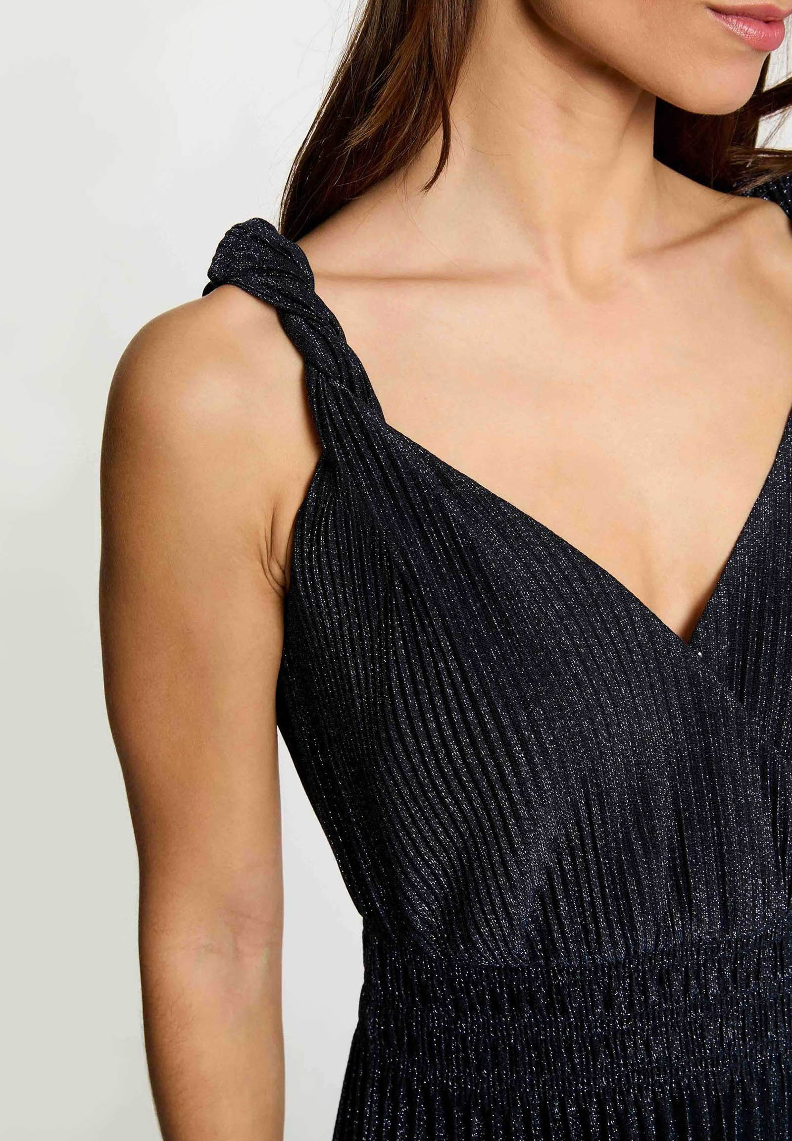 Abito Morgan de Toi realizzato in 62% poliestere, 22% viscosa, 14% filo metallizzato e 2% elastan, studiato per offrire eleganza, comfort e una vestibilità fluida. Il modello presenta una linea lunga e plissé, con scollo a V e spalline sottili annodate, dettagli che valorizzano la silhouette con un effetto raffinato e femminile.