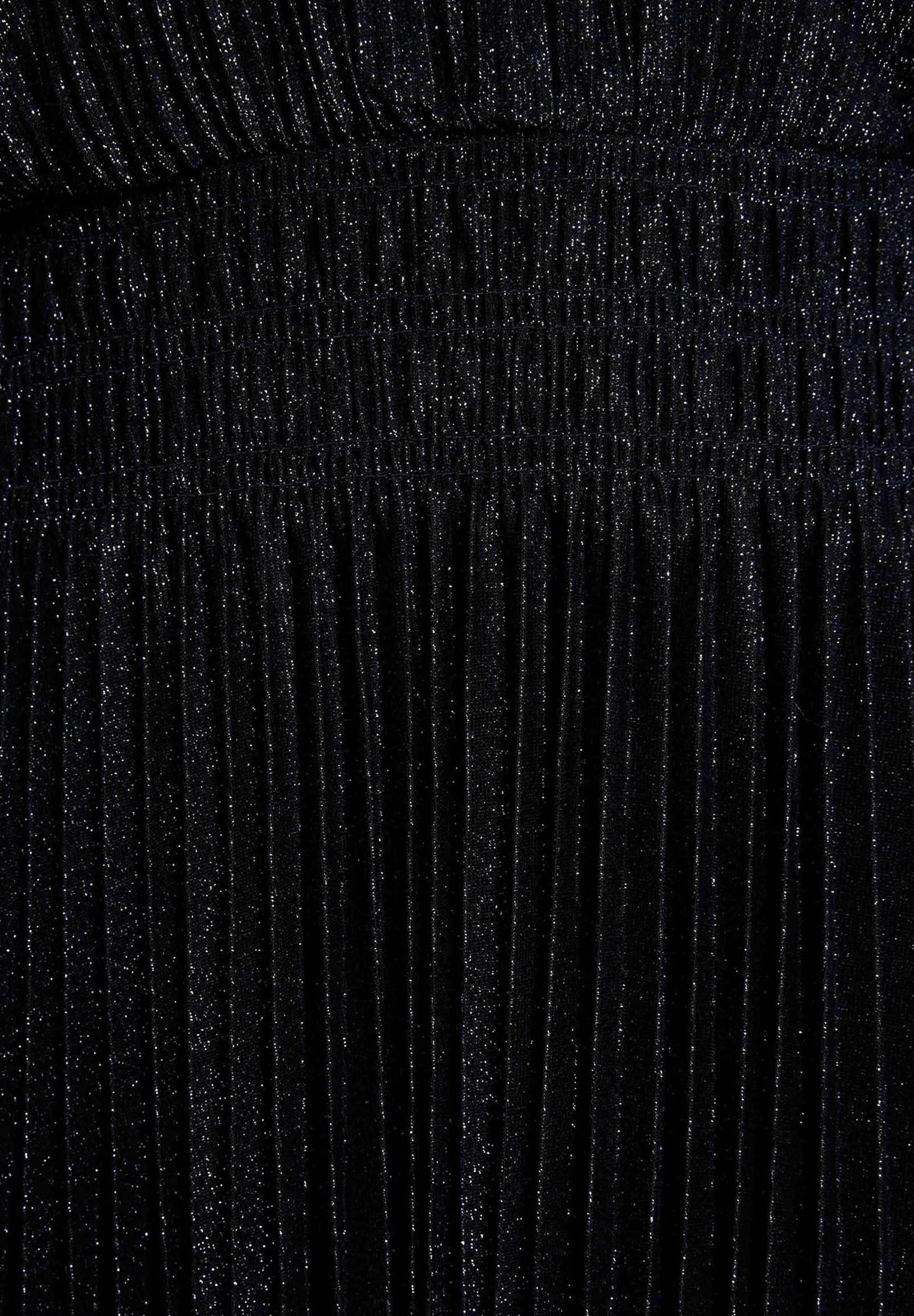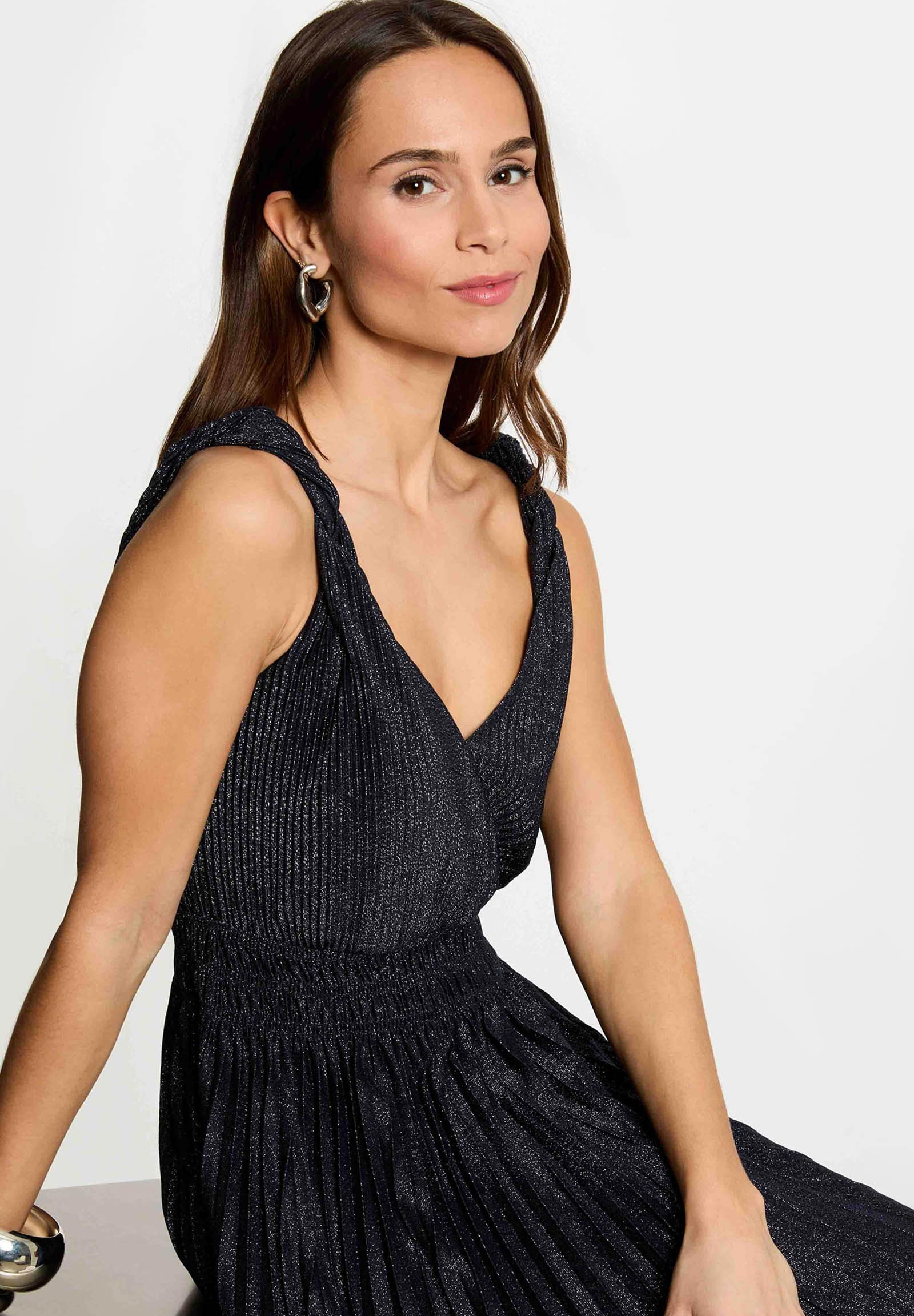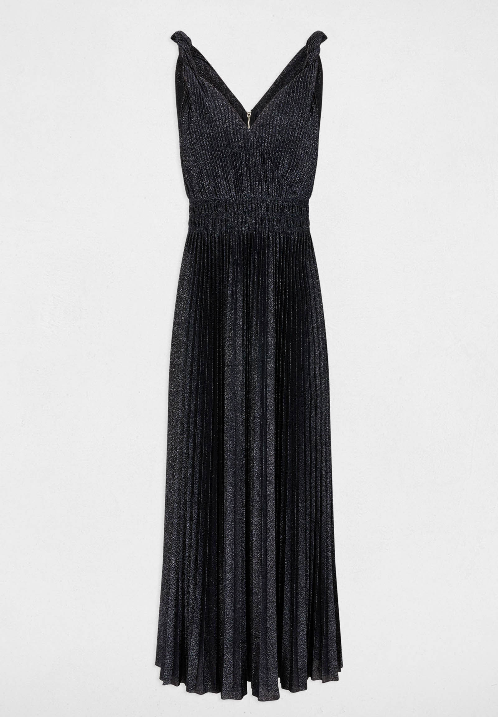 Abito Morgan de Toi realizzato in 62% poliestere, 22% viscosa, 14% filo metallizzato e 2% elastan, studiato per offrire eleganza, comfort e una vestibilità fluida. Il modello presenta una linea lunga e plissé, con scollo a V e spalline sottili annodate, dettagli che valorizzano la silhouette con un effetto raffinato e femminile.