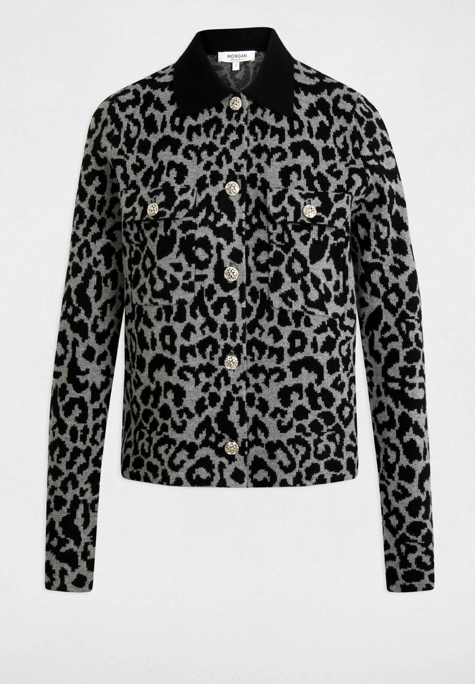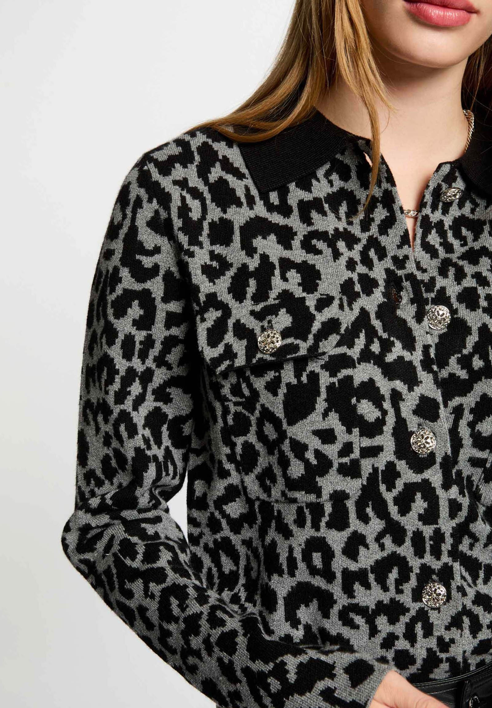 La stampa animalier all-over dona carattere e grinta al look, mentre il colletto a contrasto aggiunge un dettaglio elegante e contemporaneo. Con la sua vestibilità versatile, questo cardigan è perfetto da indossare con jeans in pelle, gonne o pantaloni sartoriali, adattandosi sia a outfit casual sia a look più ricercati.