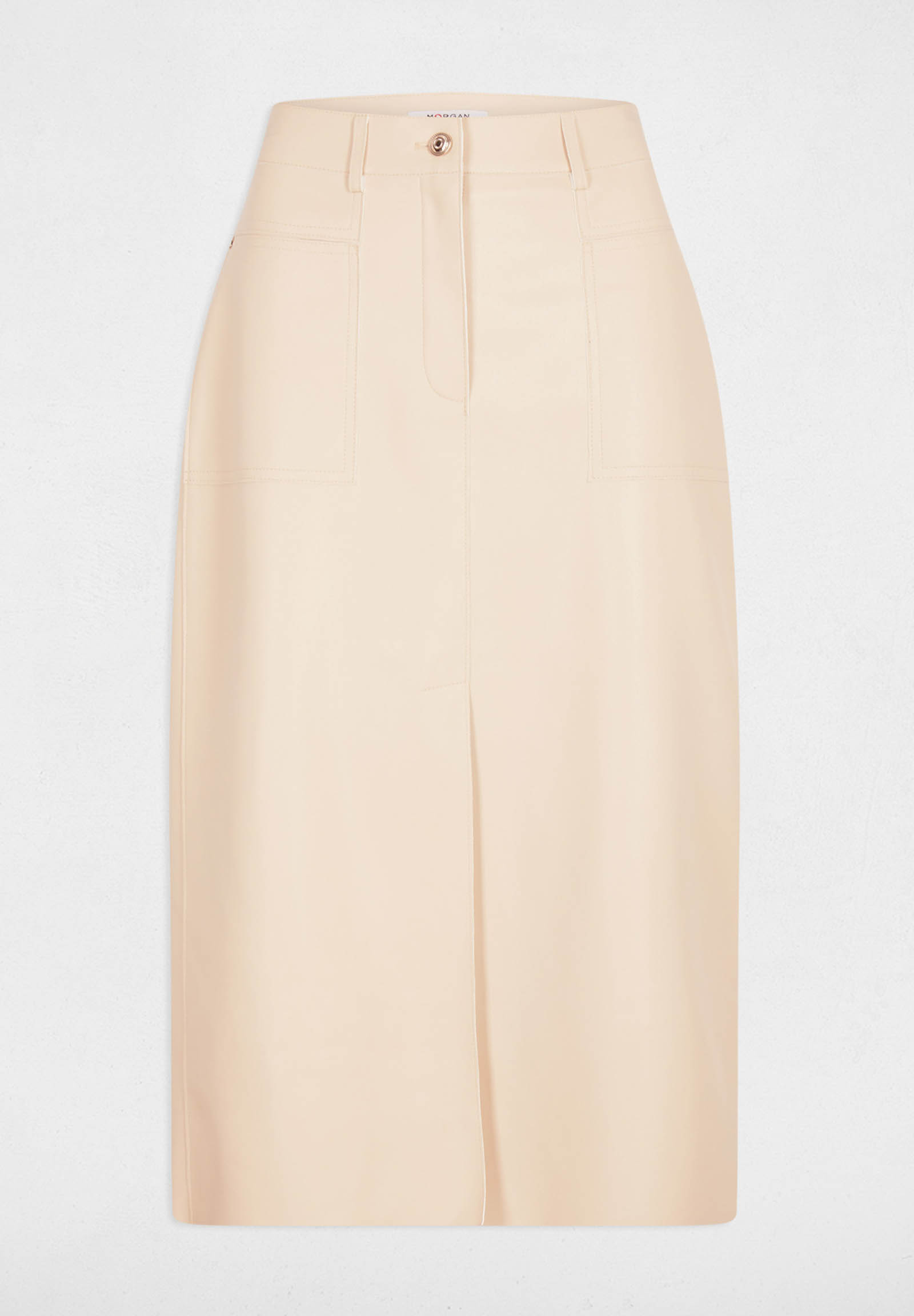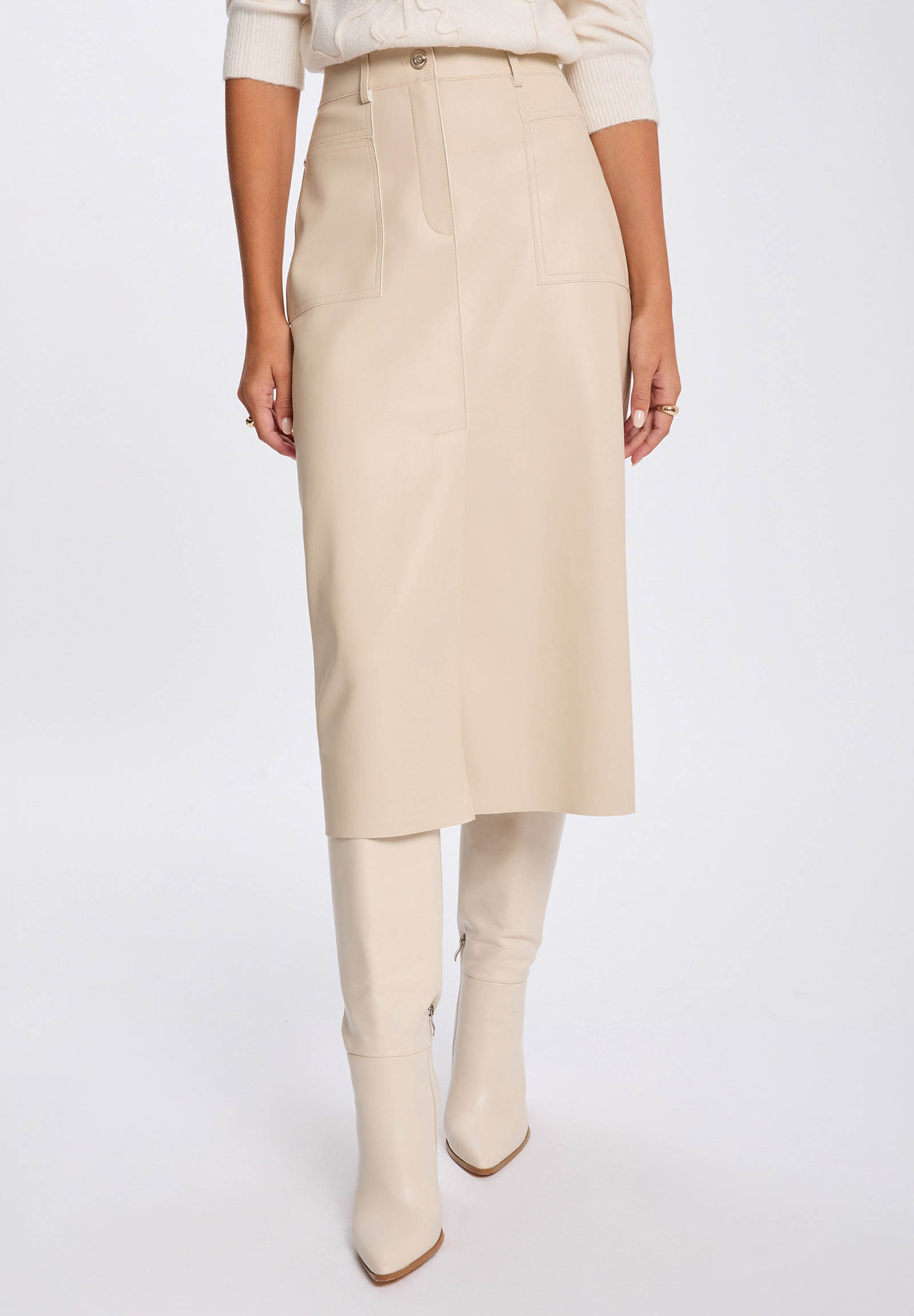 Il design presenta una linea morbida e leggermente svasata, pensata per valorizzare la silhouette e garantire comfort nei movimenti. La finitura effetto pelle rende questa gonna ideale per creare look contemporanei, dal casual chic con maglie leggere e stivaletti, fino a combinazioni più ricercate con camicie o blazer.