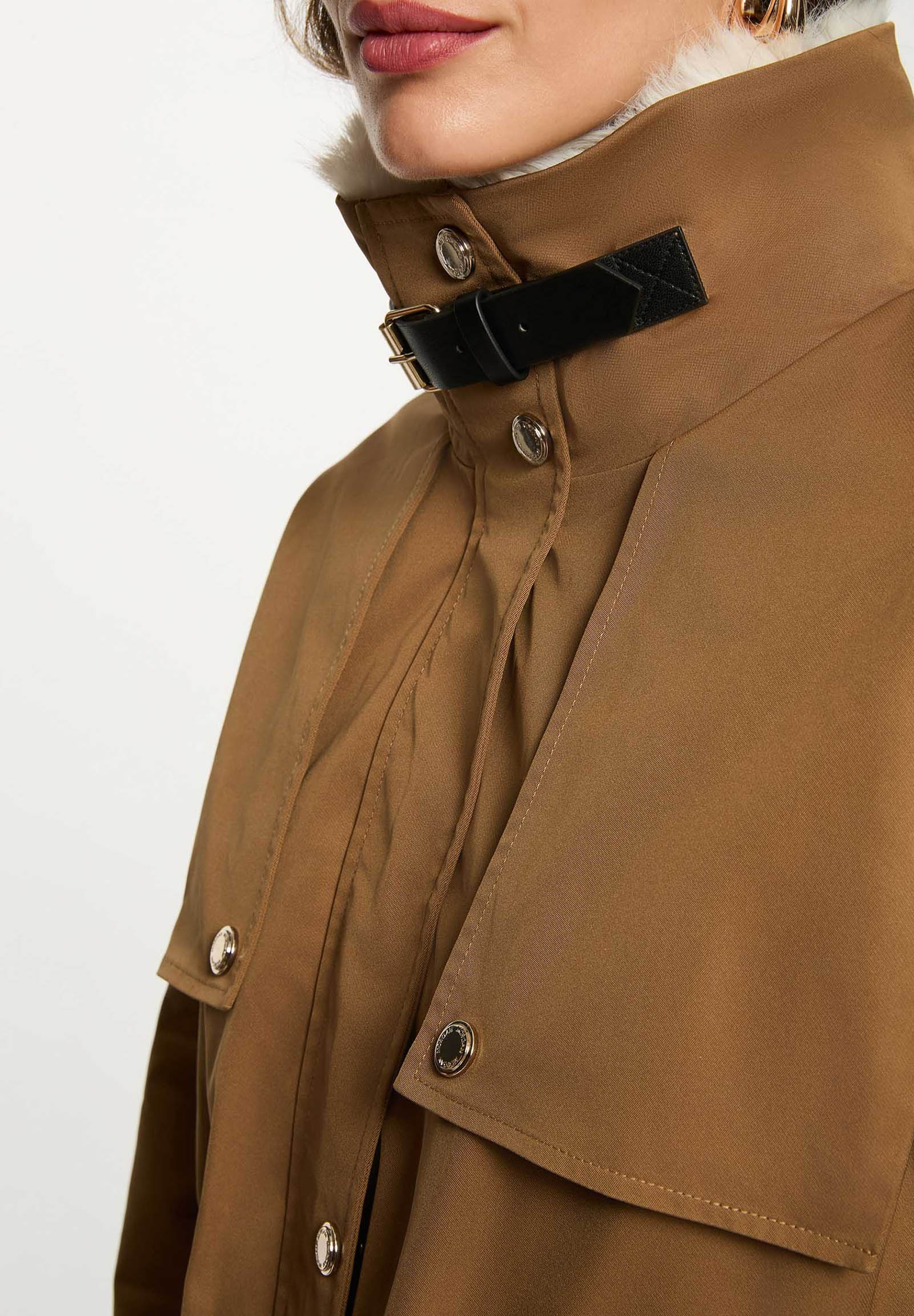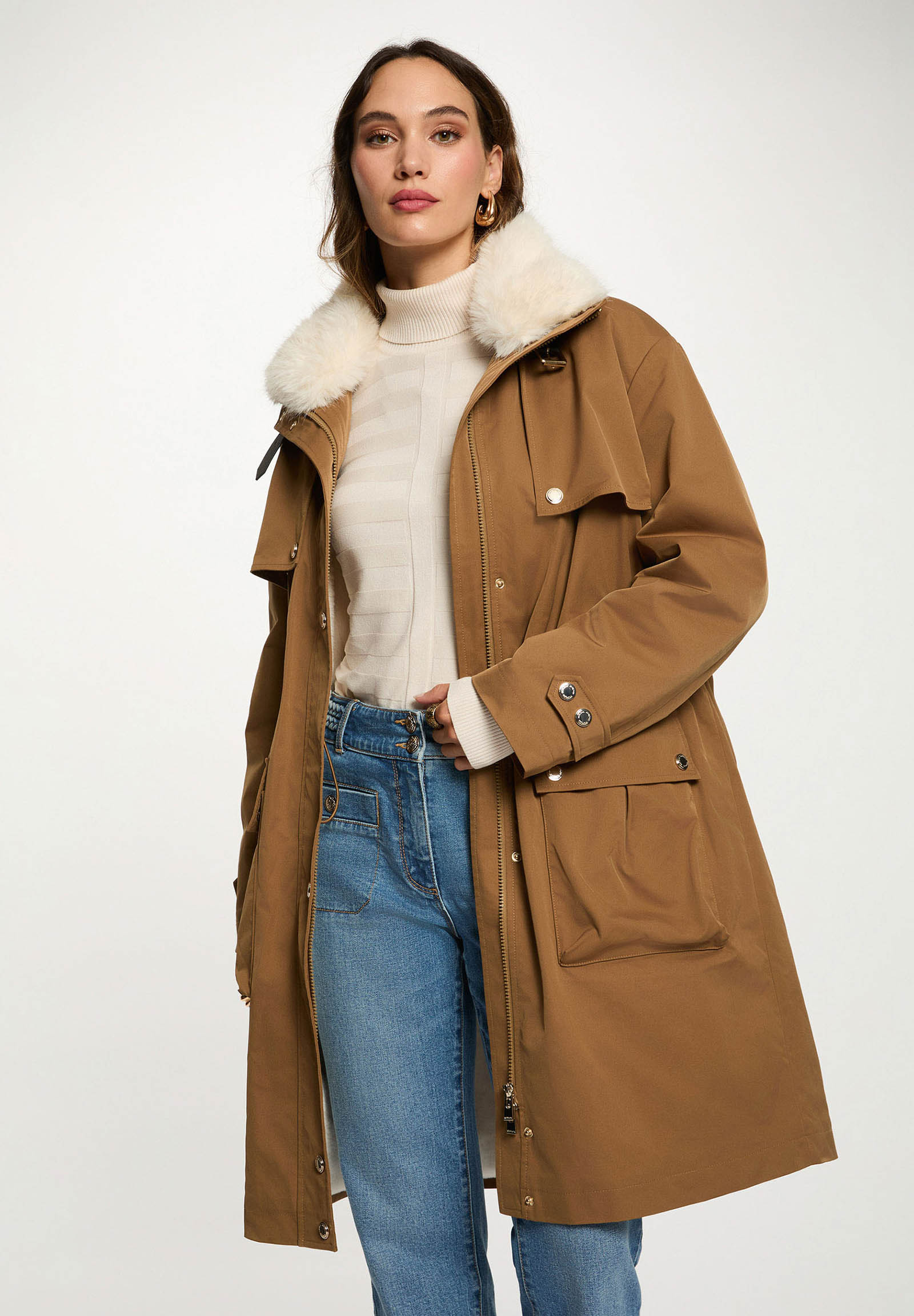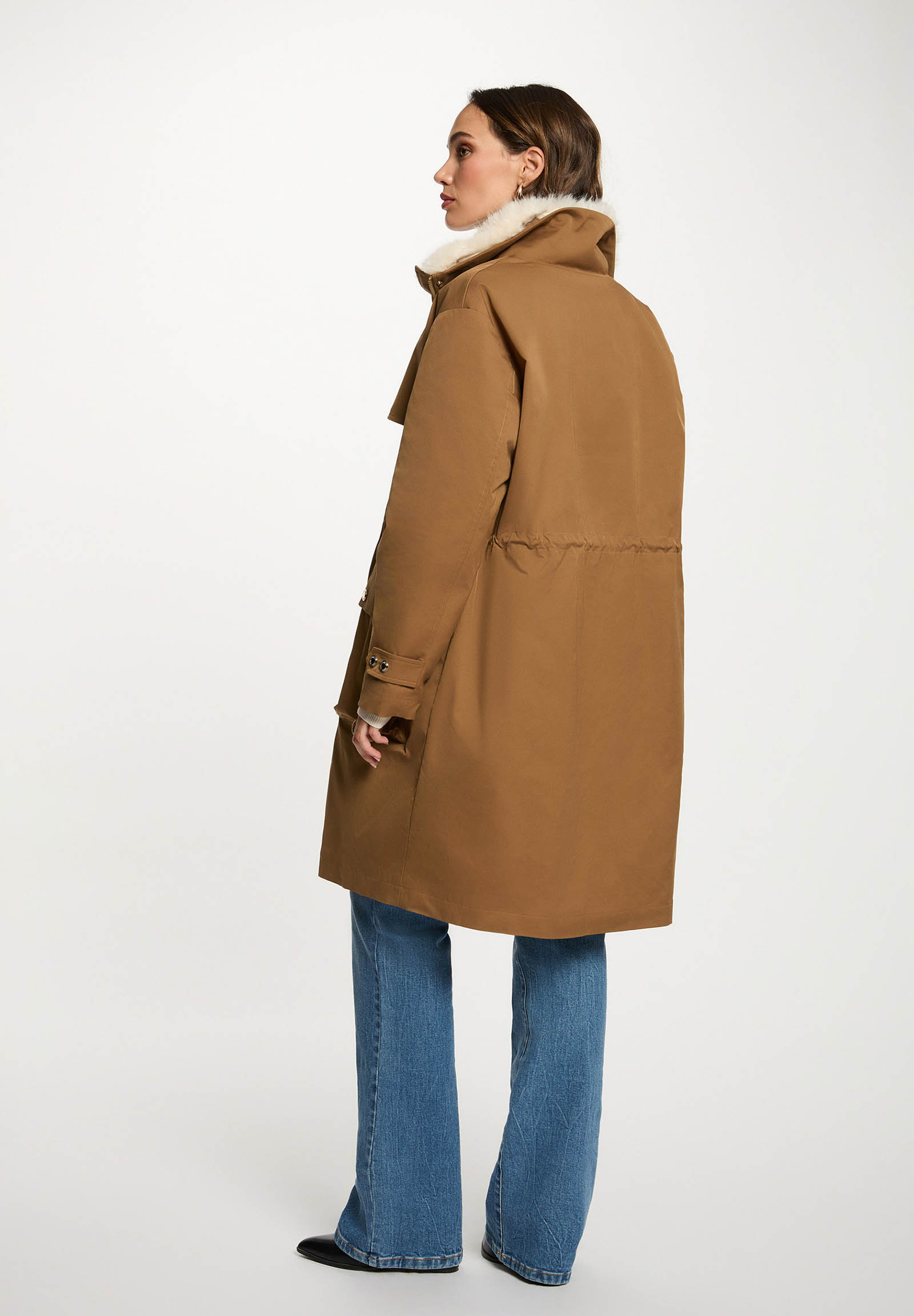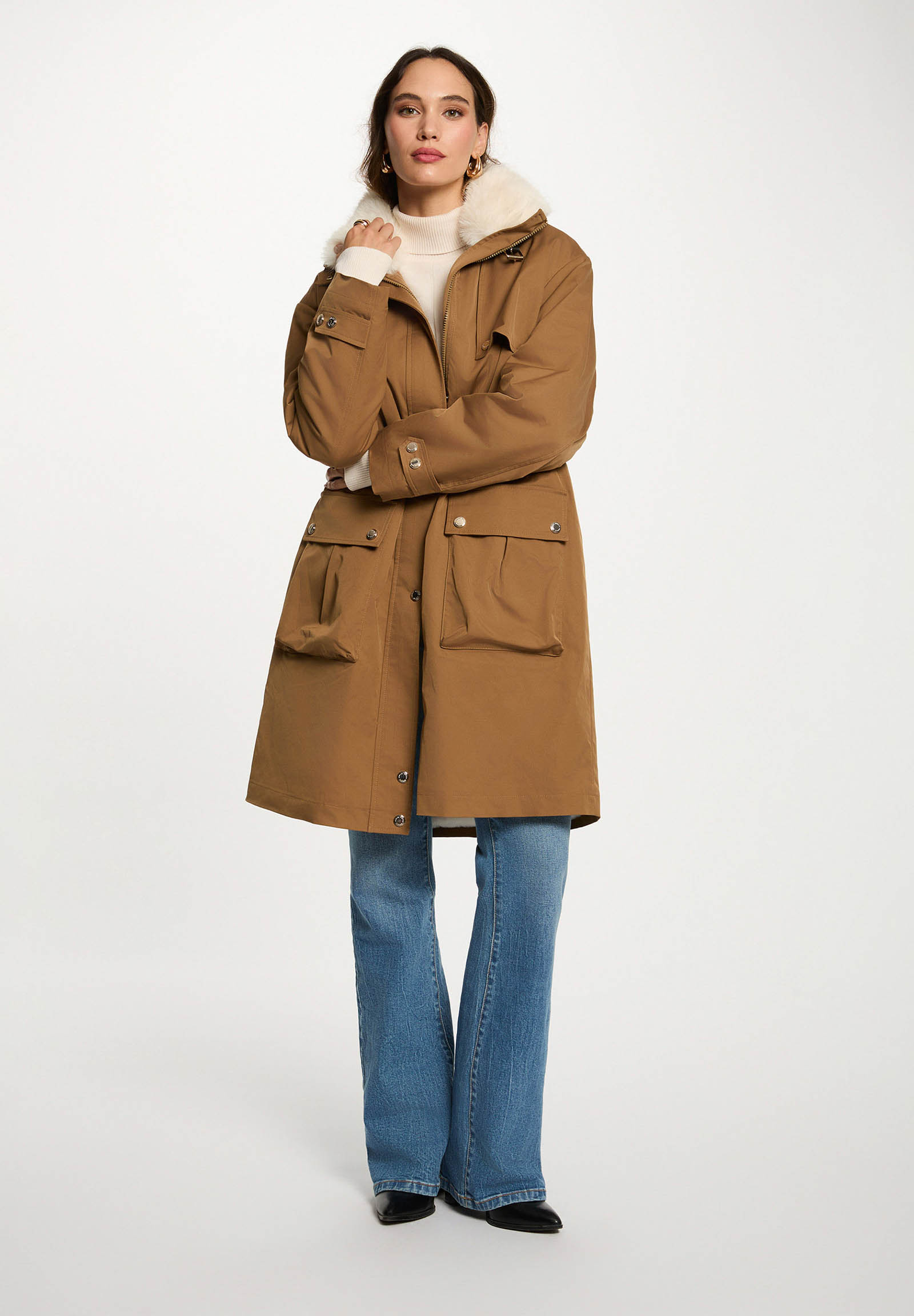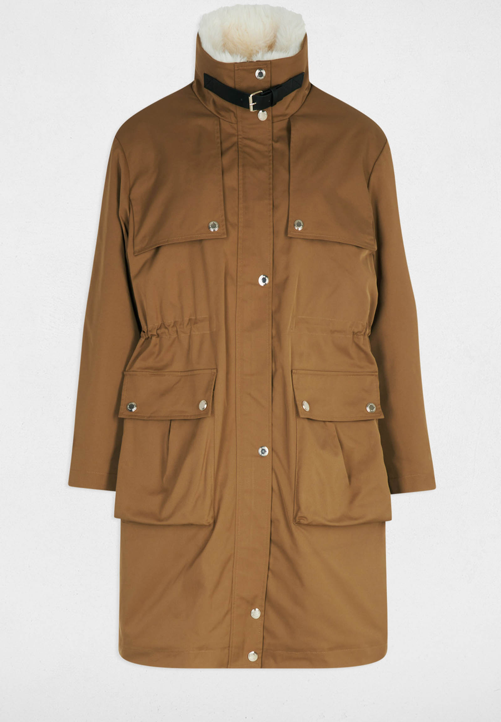 Parka lungo dalla linea moderna, perfetto per affrontare la stagione fredda con stile e comfort. Il design casual-chic è valorizzato dal colletto in ecopelliccia removibile e dai dettagli regolabili in vita, che sottolineano la silhouette senza rinunciare alla praticità.