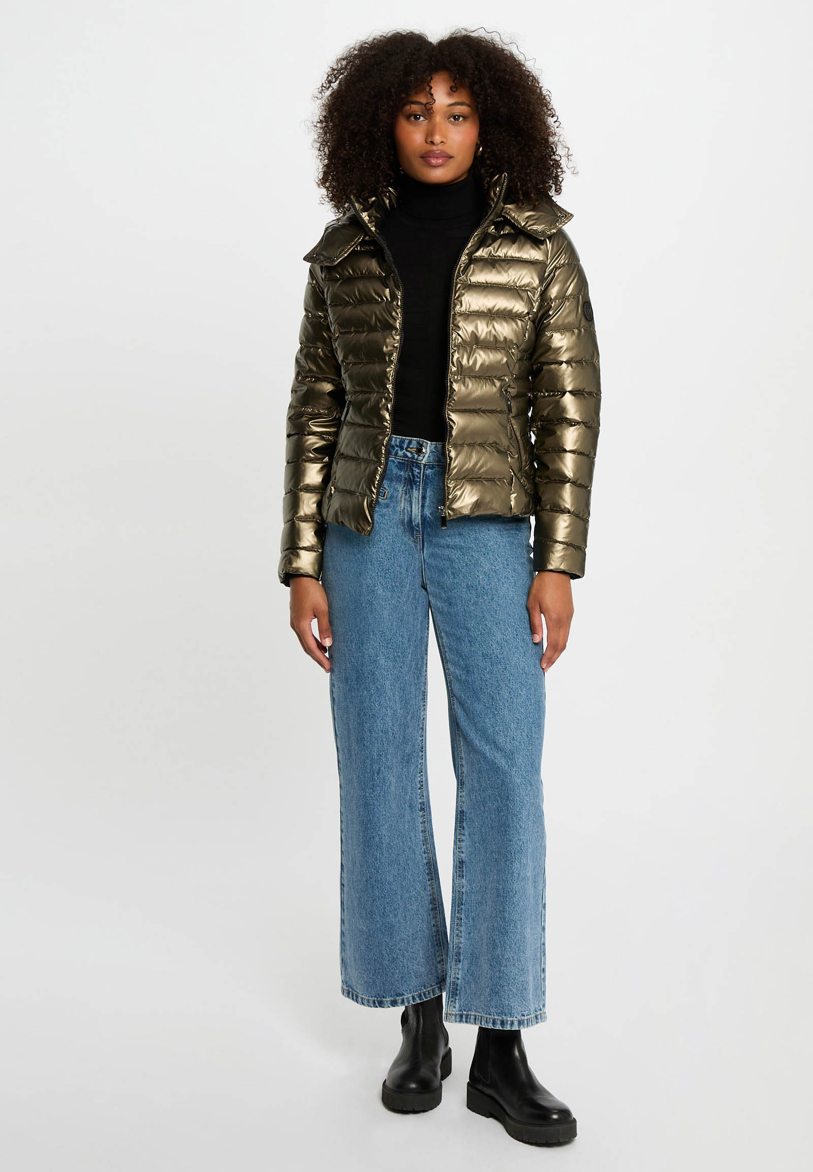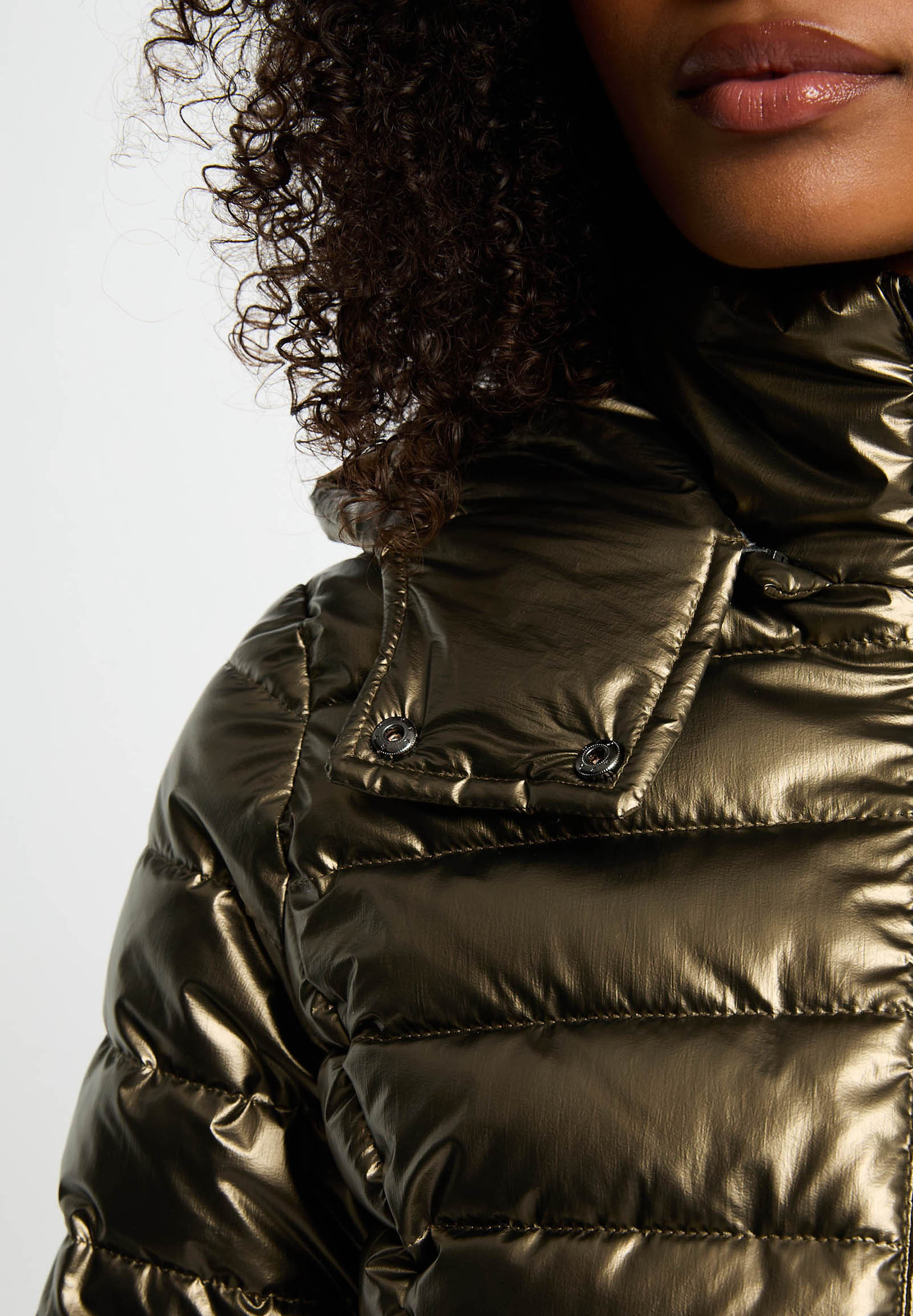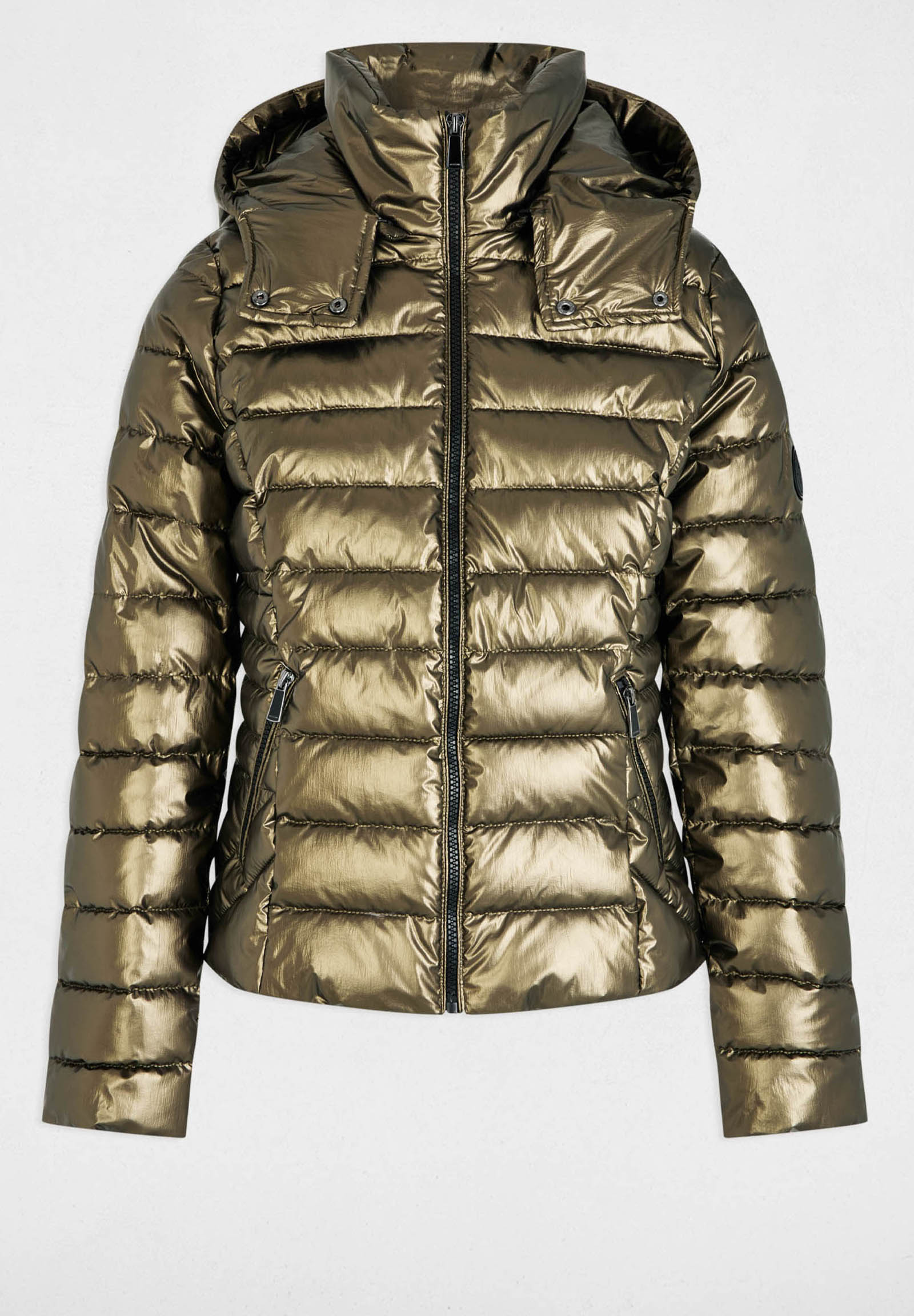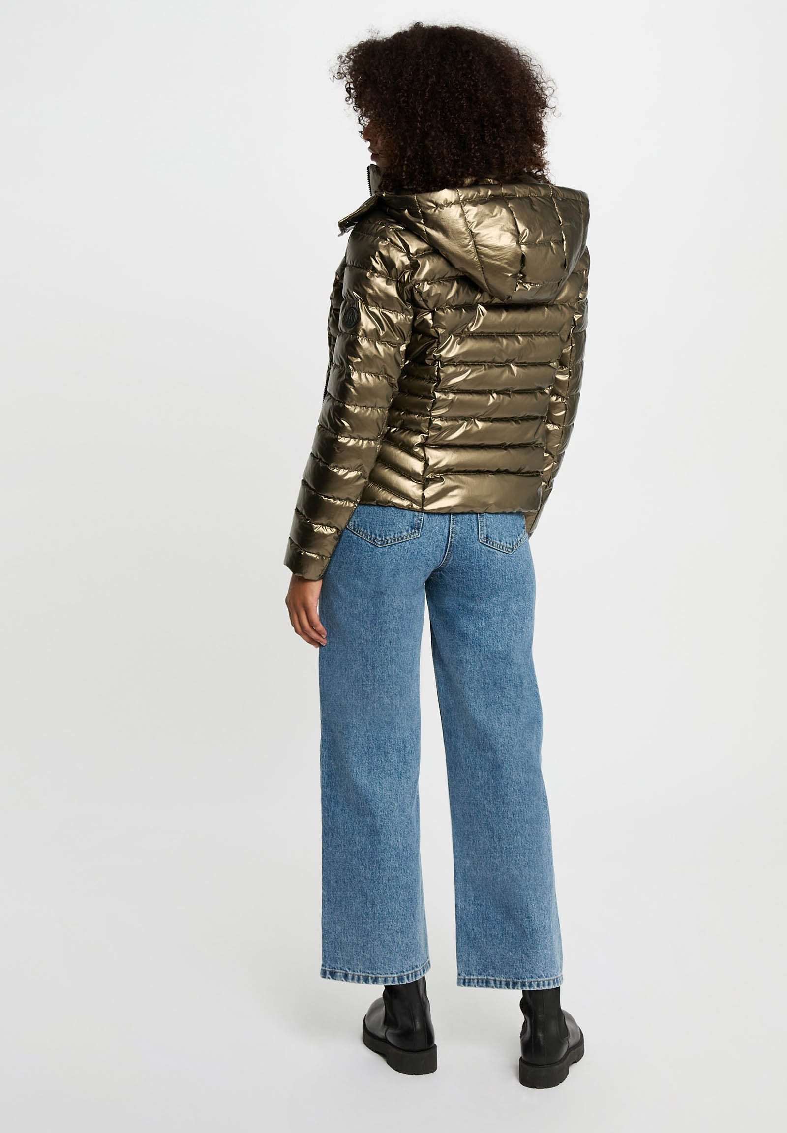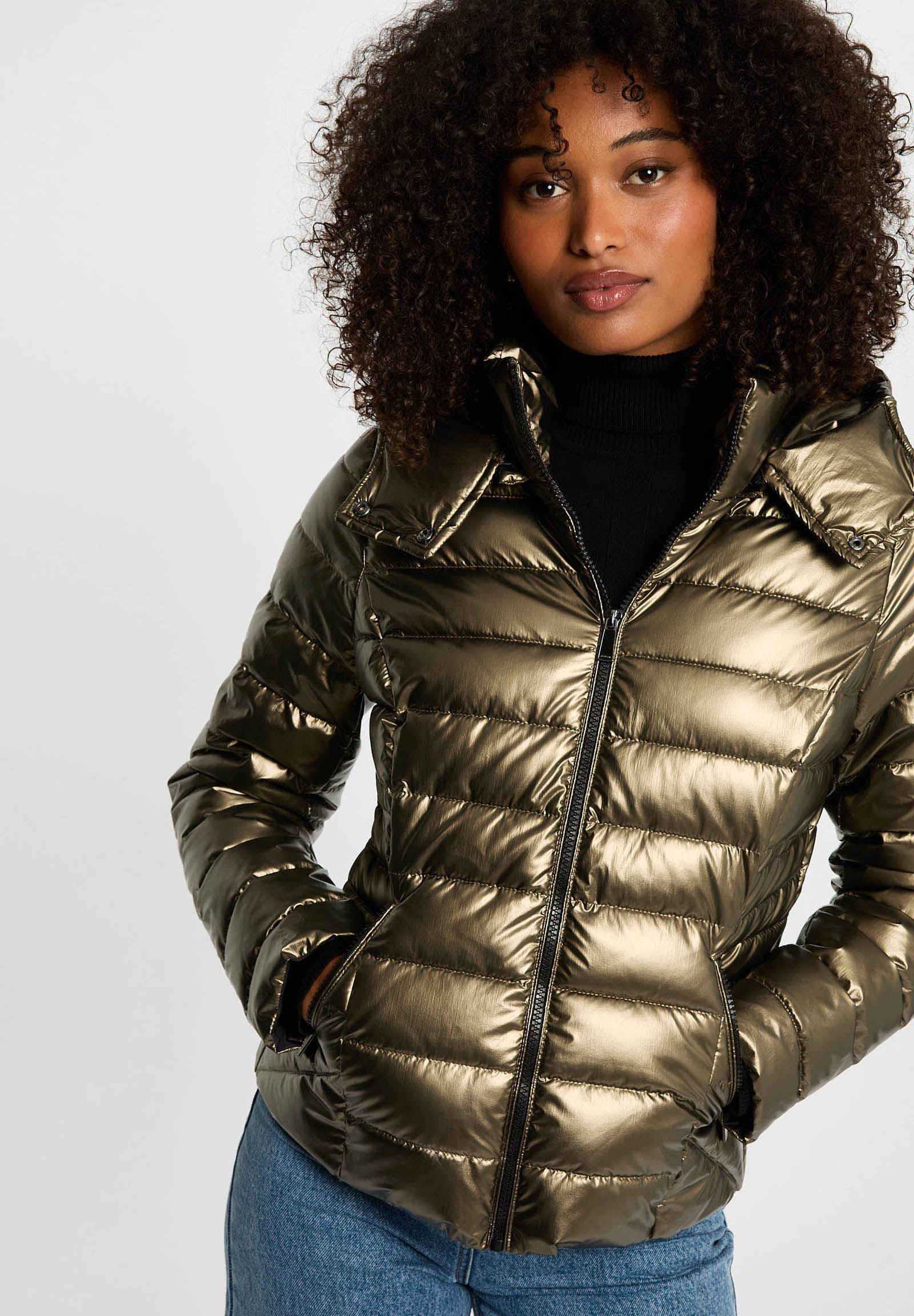 Il design trapuntato con finitura lucida e il colore blu intenso donano un look moderno e femminile, perfetto per completare outfit casual chic. Il modello con cappuccio e zip frontale offre praticità e protezione, mentre la linea slim valorizza la silhouette.