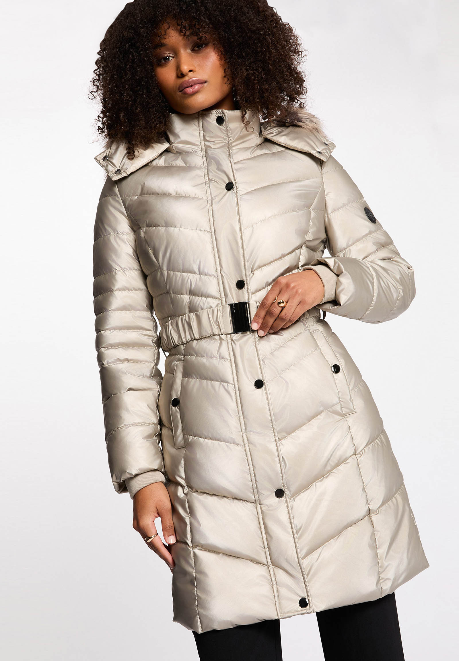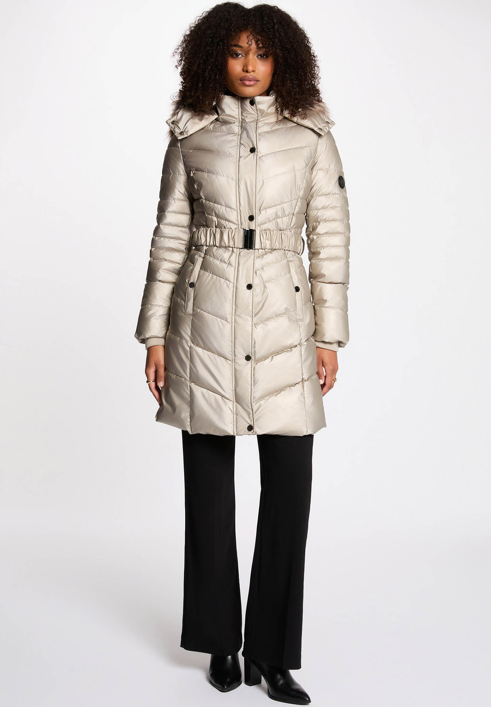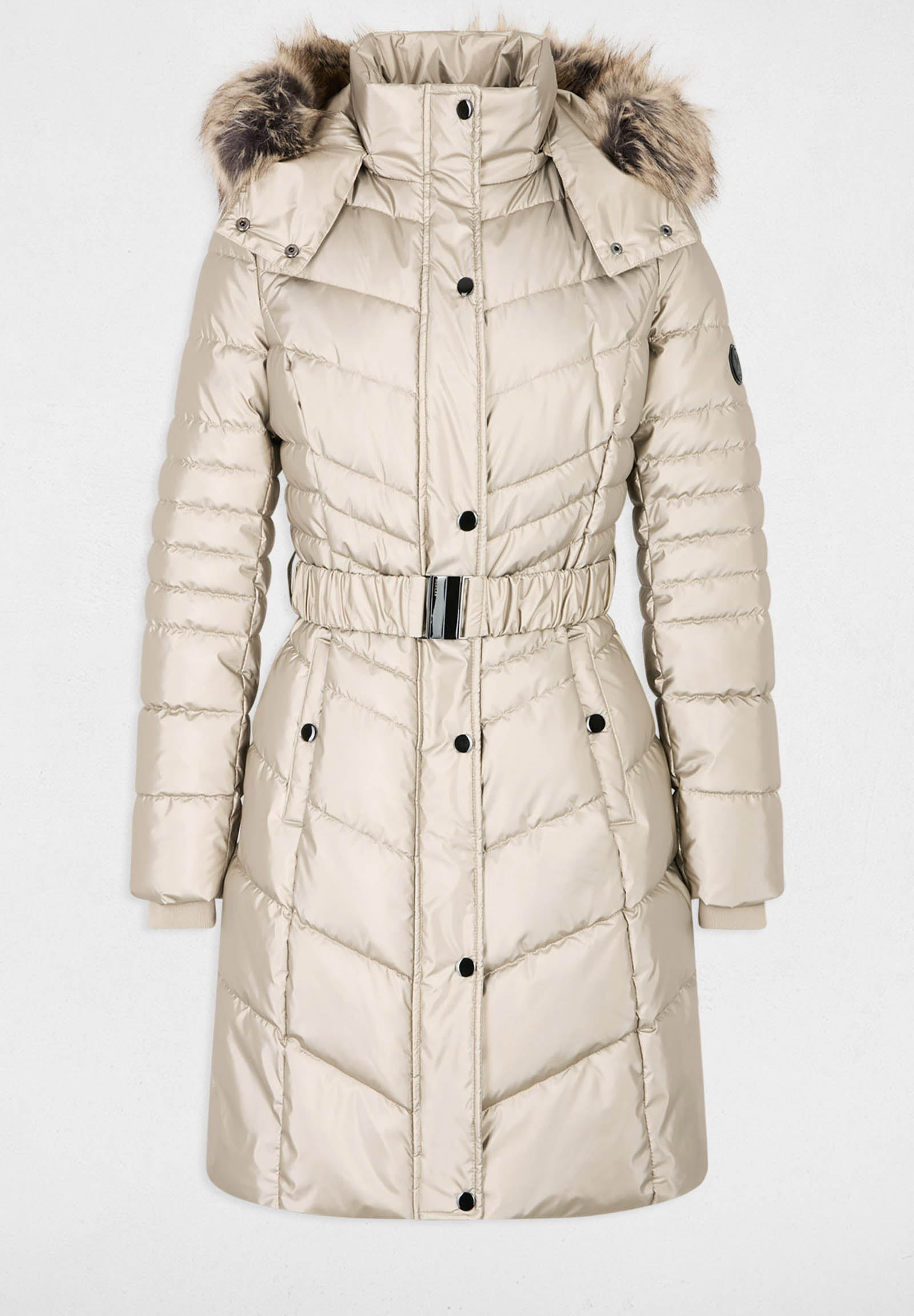 Piumino con cintura e cappuccio con inserto in ecopelliccia GALEX1