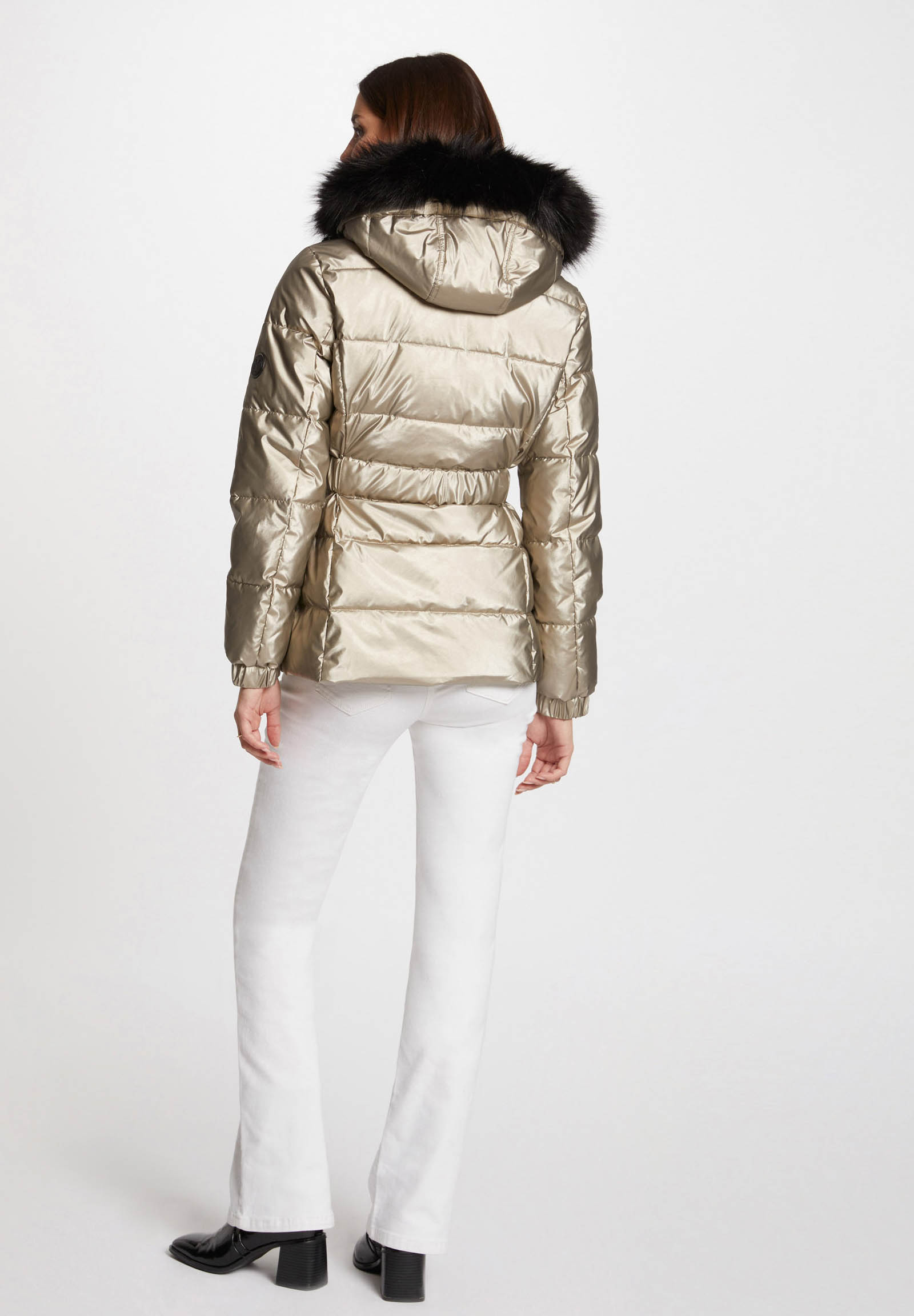 Realizzato in tessuti tecnici di alta qualità, questo piumino combina calore, leggerezza e un design glamour, perfetto per completare outfit quotidiani e look più ricercati.