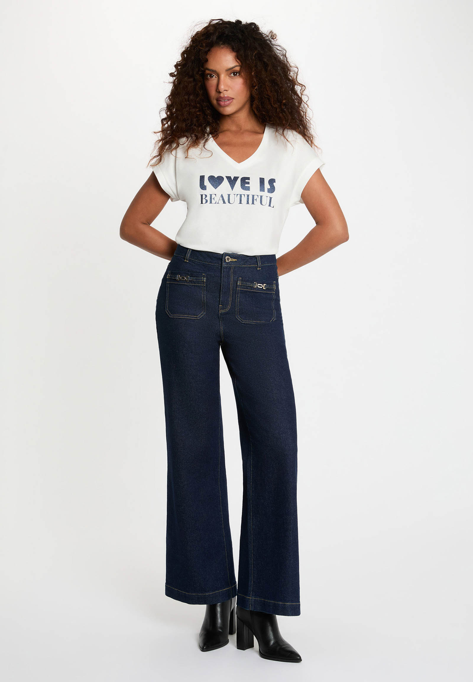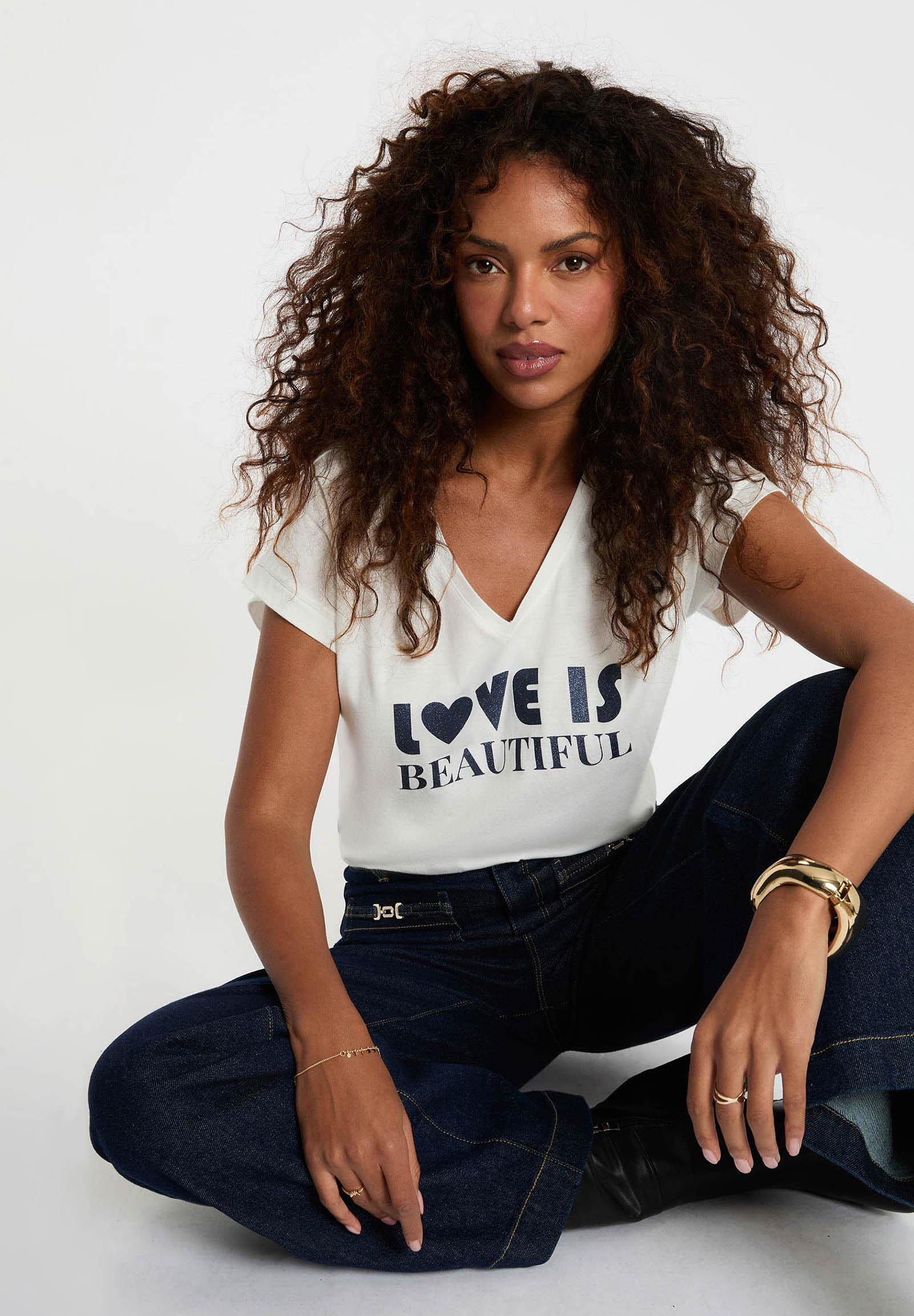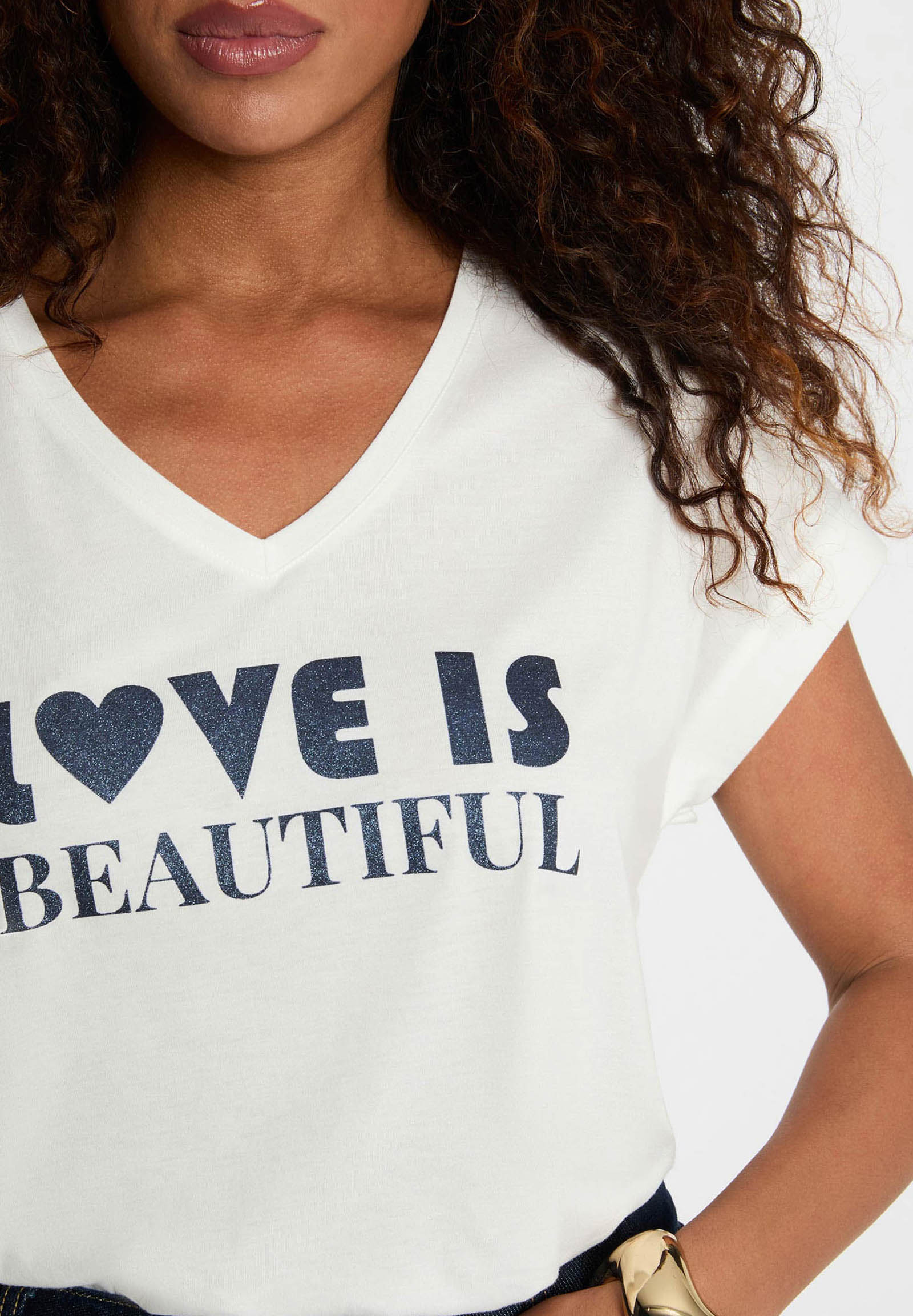 Il tessuto naturale e leggero assicura una vestibilità fluida e piacevole, ideale per la stagione primavera-estate e perfetta anche come base per outfit a strati. Il design con scollo a V e la stampa frontale Love is Beautiful donano un tocco moderno e romantico, rendendo questa T-shirt un must-have del guardaroba femminile.