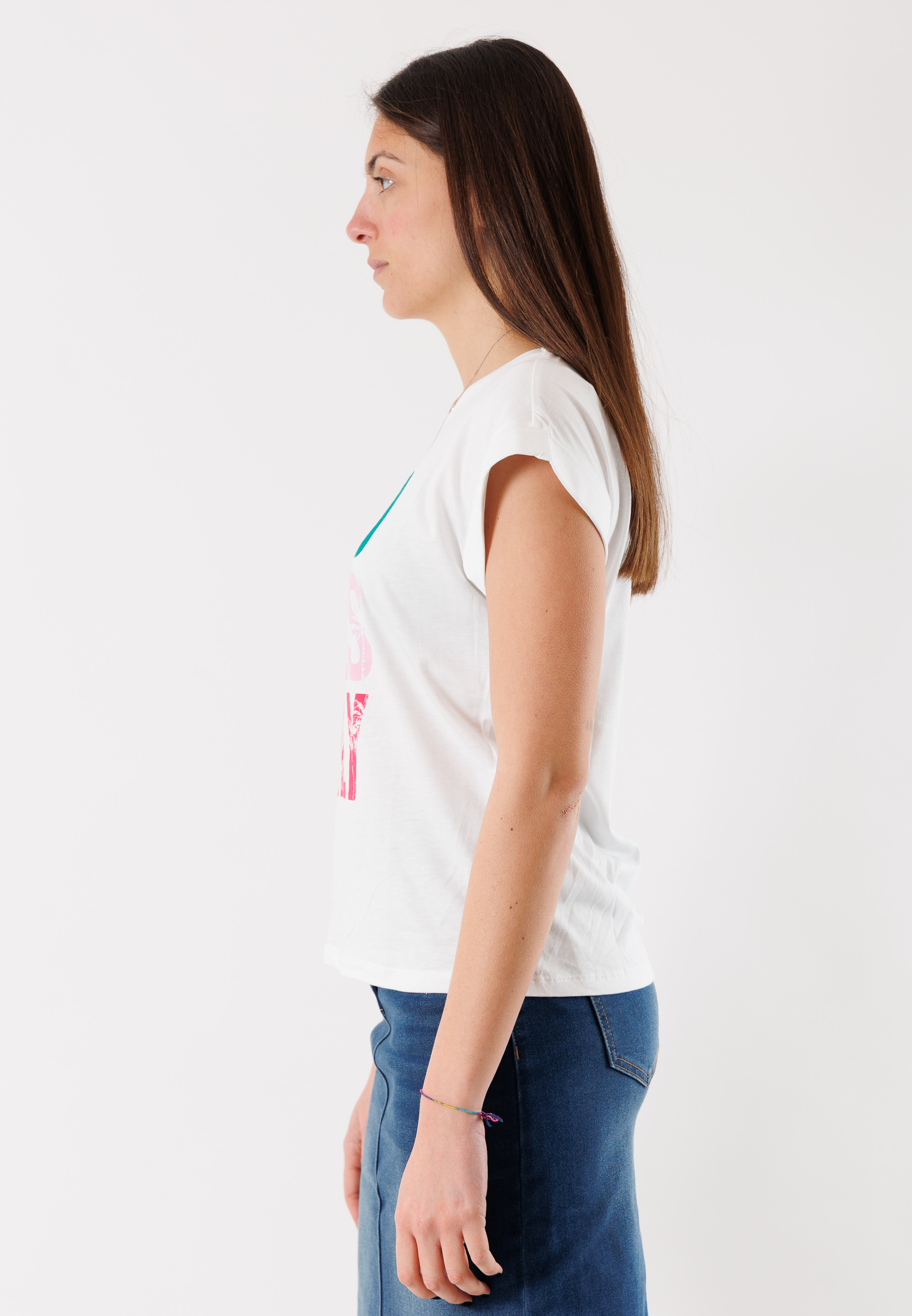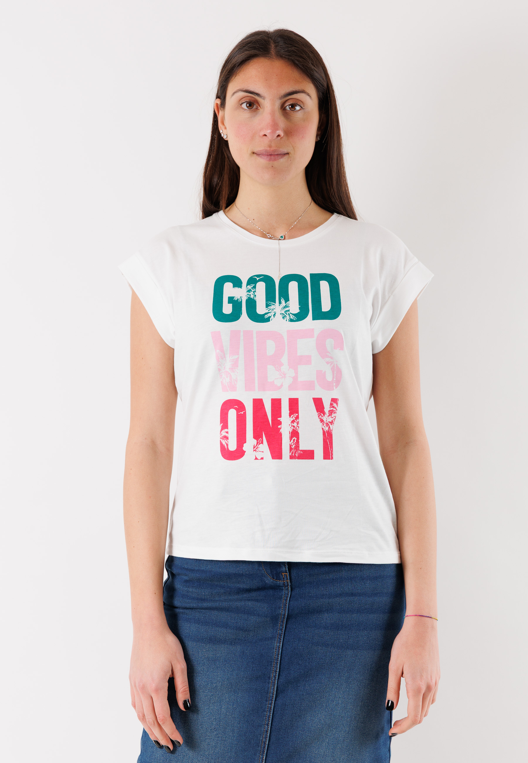 Il design presenta un classico scollo rotondo, maniche corte e una vestibilità morbida che favorisce la libertà di movimento. Il punto forte del modello è la stampa frontale GOOD VIBES ONLY, realizzata con colori vivaci che donano energia, positività e un tocco moderno al look.