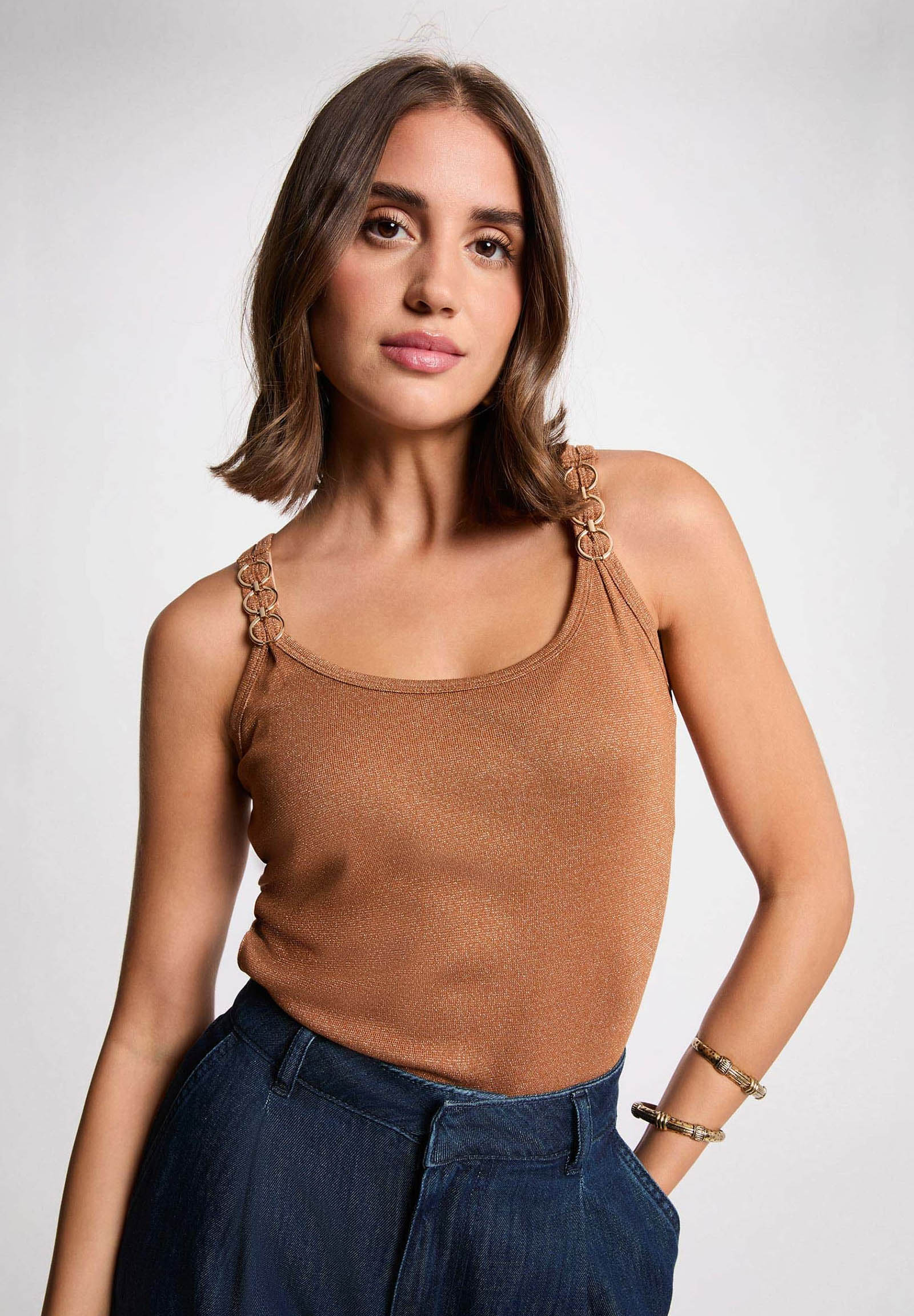 Il design con spalline sottili e linea pulita valorizza la silhouette, mentre leffetto leggermente brillante rende questo top ideale sia per il giorno che per la sera. La vestibilità confortevole segue le forme senza costringere, offrendo massima libertà di movimento.