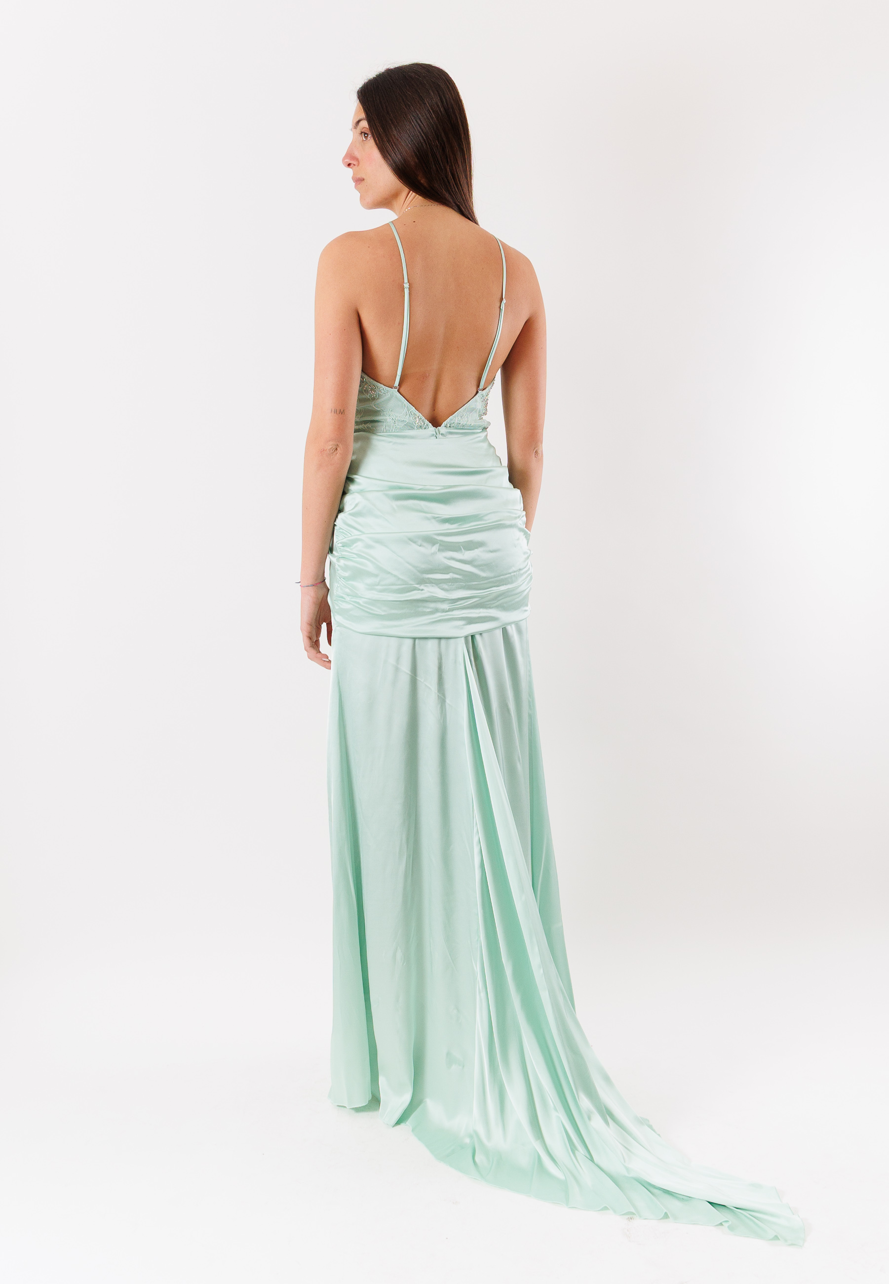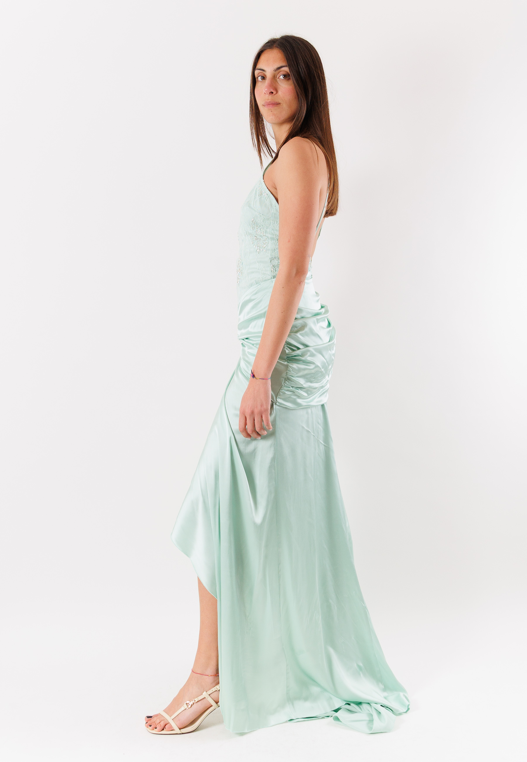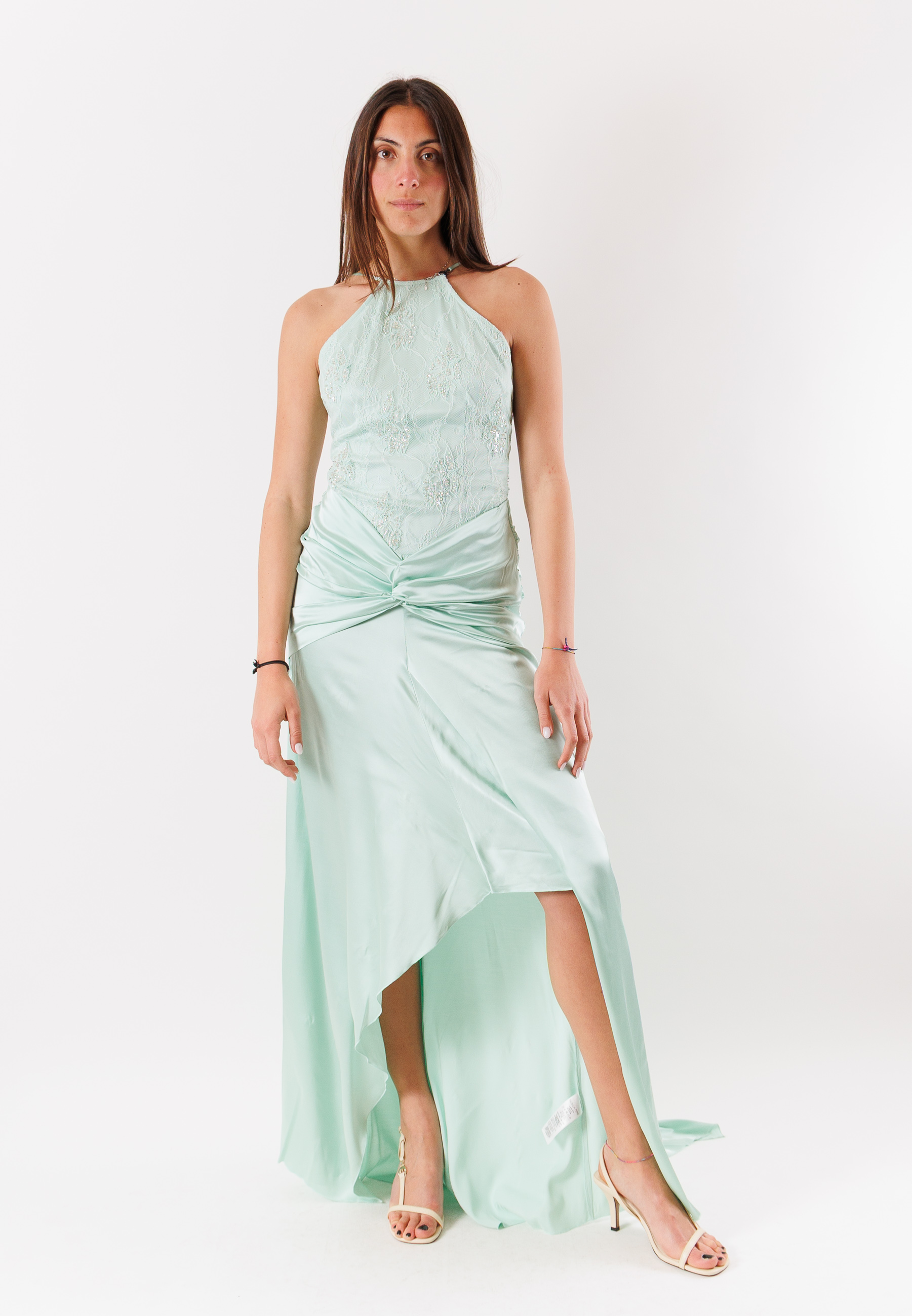 Il design si distingue per il taglio asimmetrico e la lunghezza maxi, elementi che creano dinamismo e slanciano la figura. La linea aderente sul busto è bilanciata da una gonna morbida e fluente, mentre le finiture pulite e la costruzione essenziale conferiscono uneleganza moderna e senza tempo. Il capo è ideale per occasioni speciali, eventi serali o cerimonie, grazie al suo equilibrio tra femminilità e carattere.