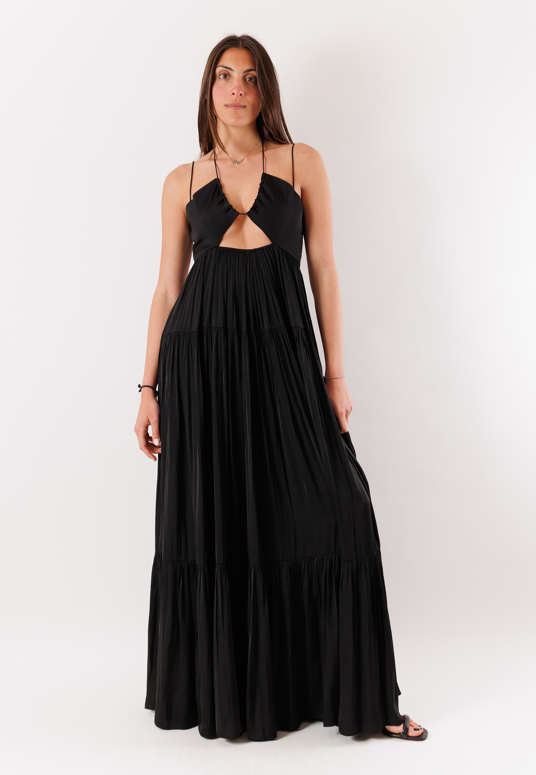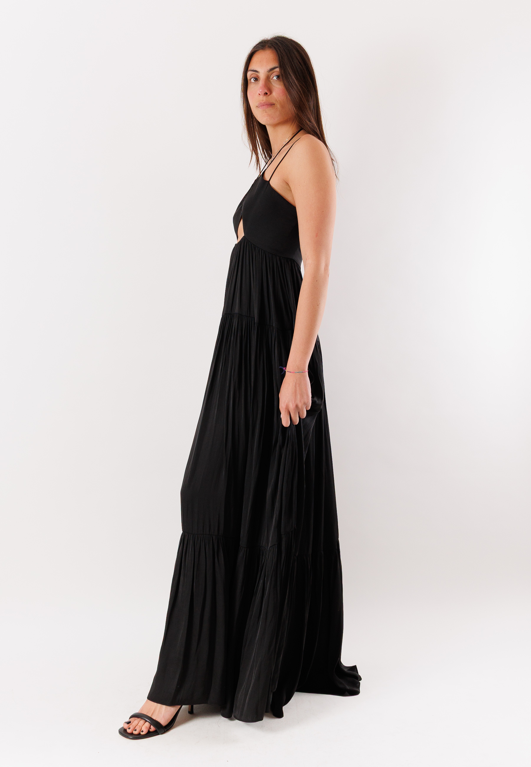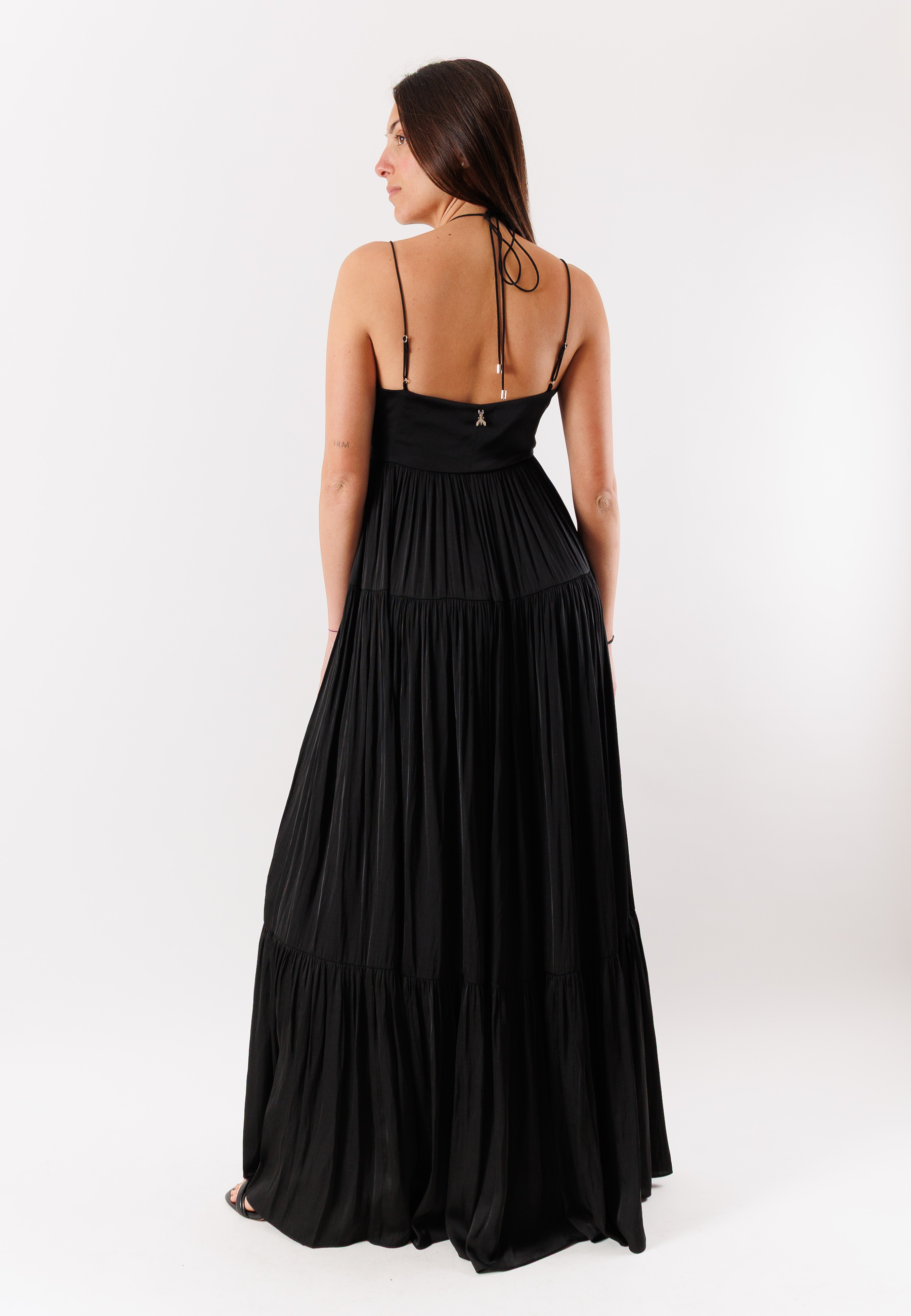 Il design si distingue per la parte superiore essenziale con spalline sottili e un taglio definito sul busto, che valorizza la linea del capo. Il protagonista è il gonnellone ampio e plissettato, che crea volume e movimento, donando allabito unallure elegante e sofisticata. La lunghezza maxi slancia la figura e rende il modello ideale per eventi serali, cerimonie o occasioni formali.