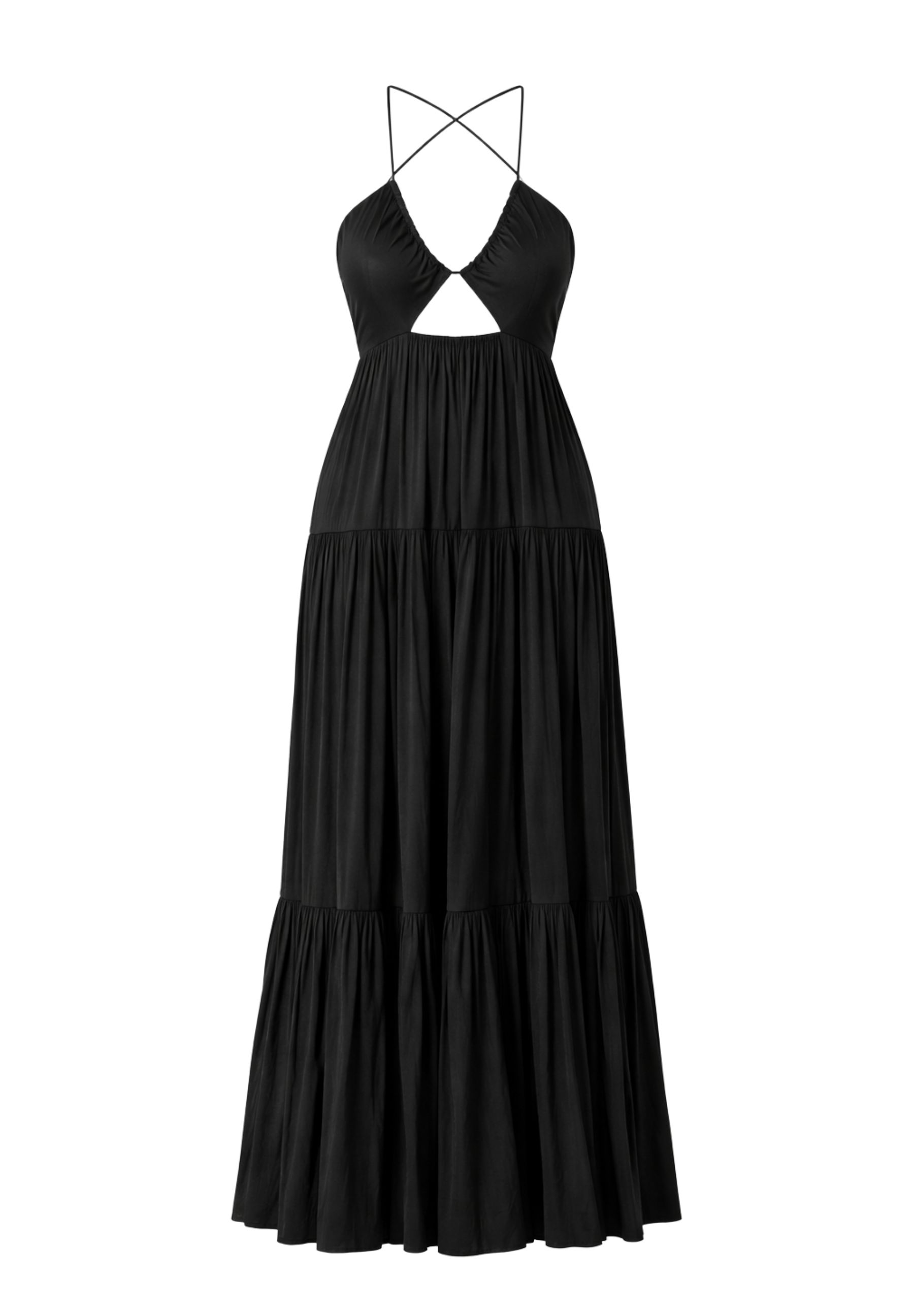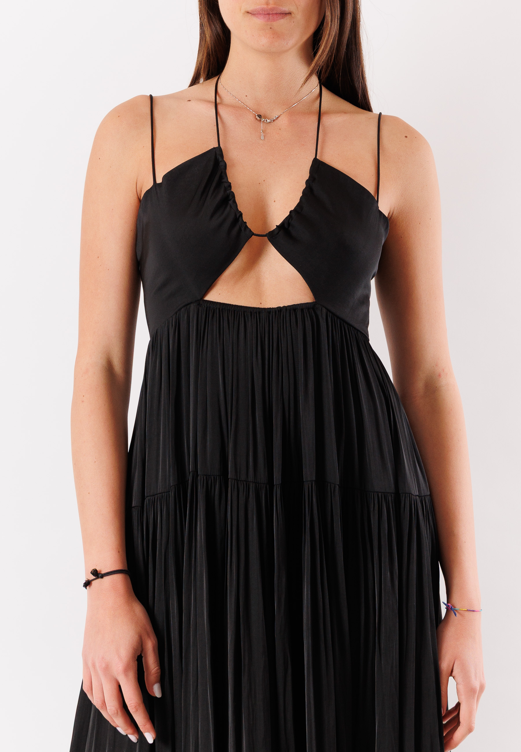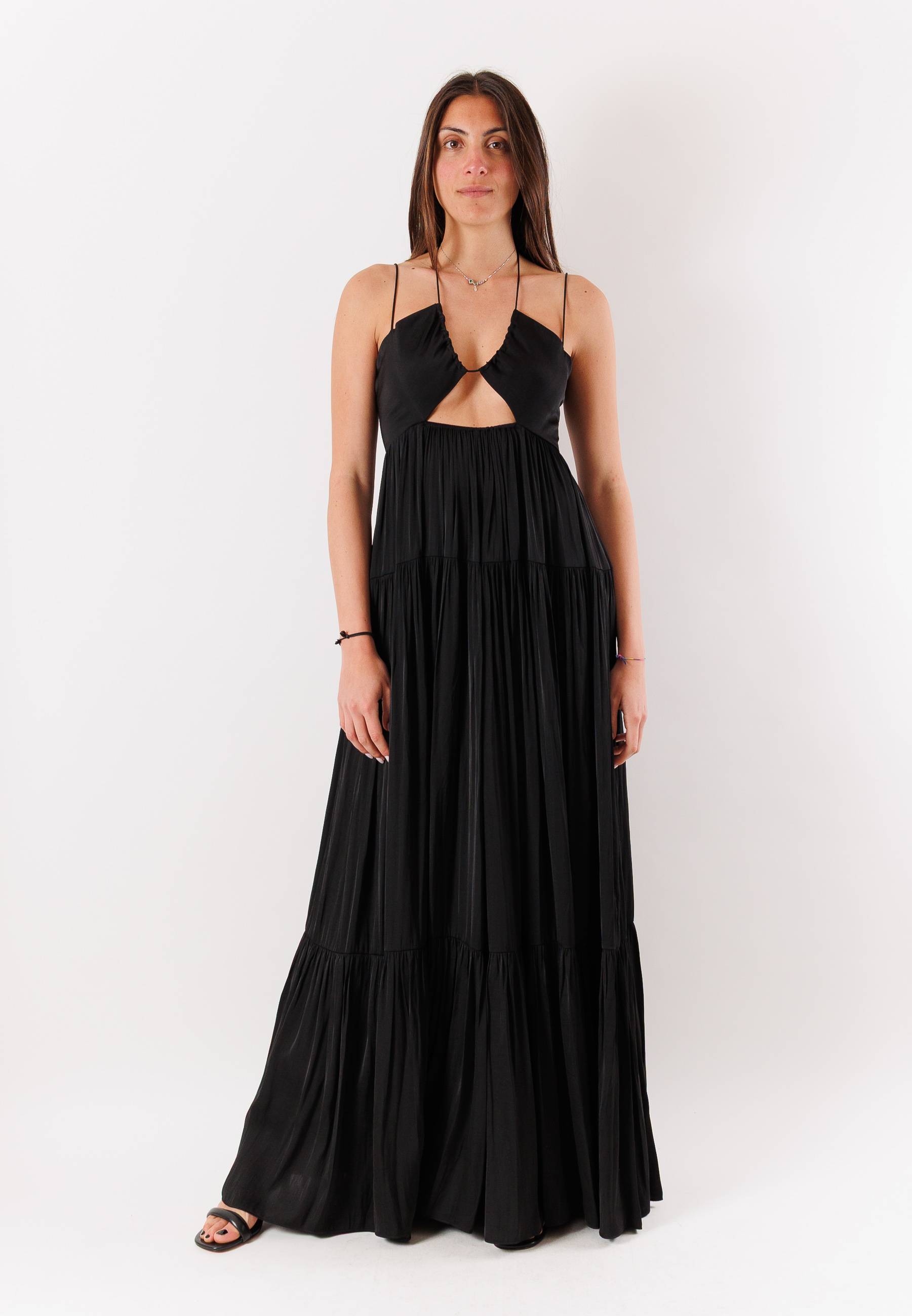 Il design si distingue per la parte superiore essenziale con spalline sottili e un taglio definito sul busto, che valorizza la linea del capo. Il protagonista è il gonnellone ampio e plissettato, che crea volume e movimento, donando allabito unallure elegante e sofisticata. La lunghezza maxi slancia la figura e rende il modello ideale per eventi serali, cerimonie o occasioni formali.
