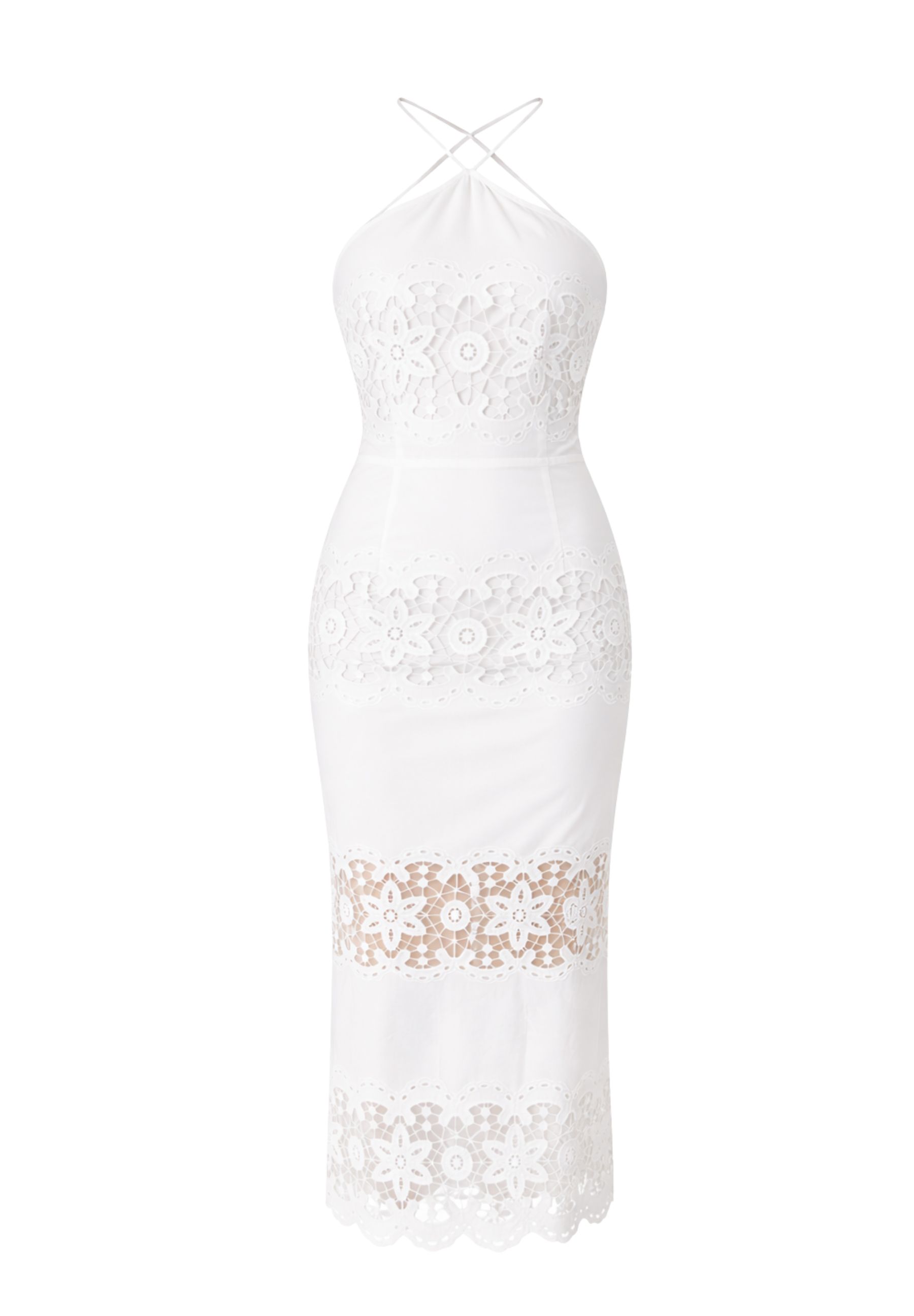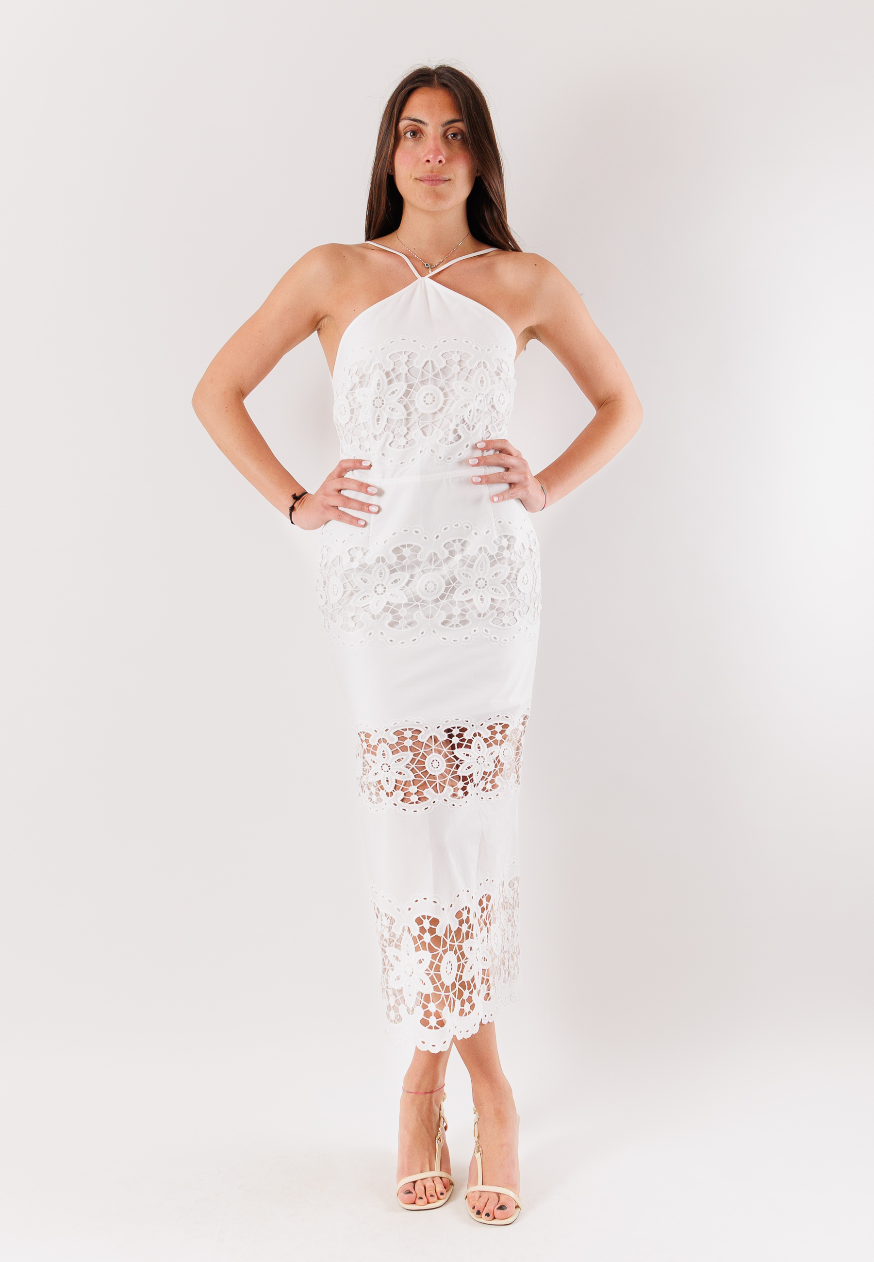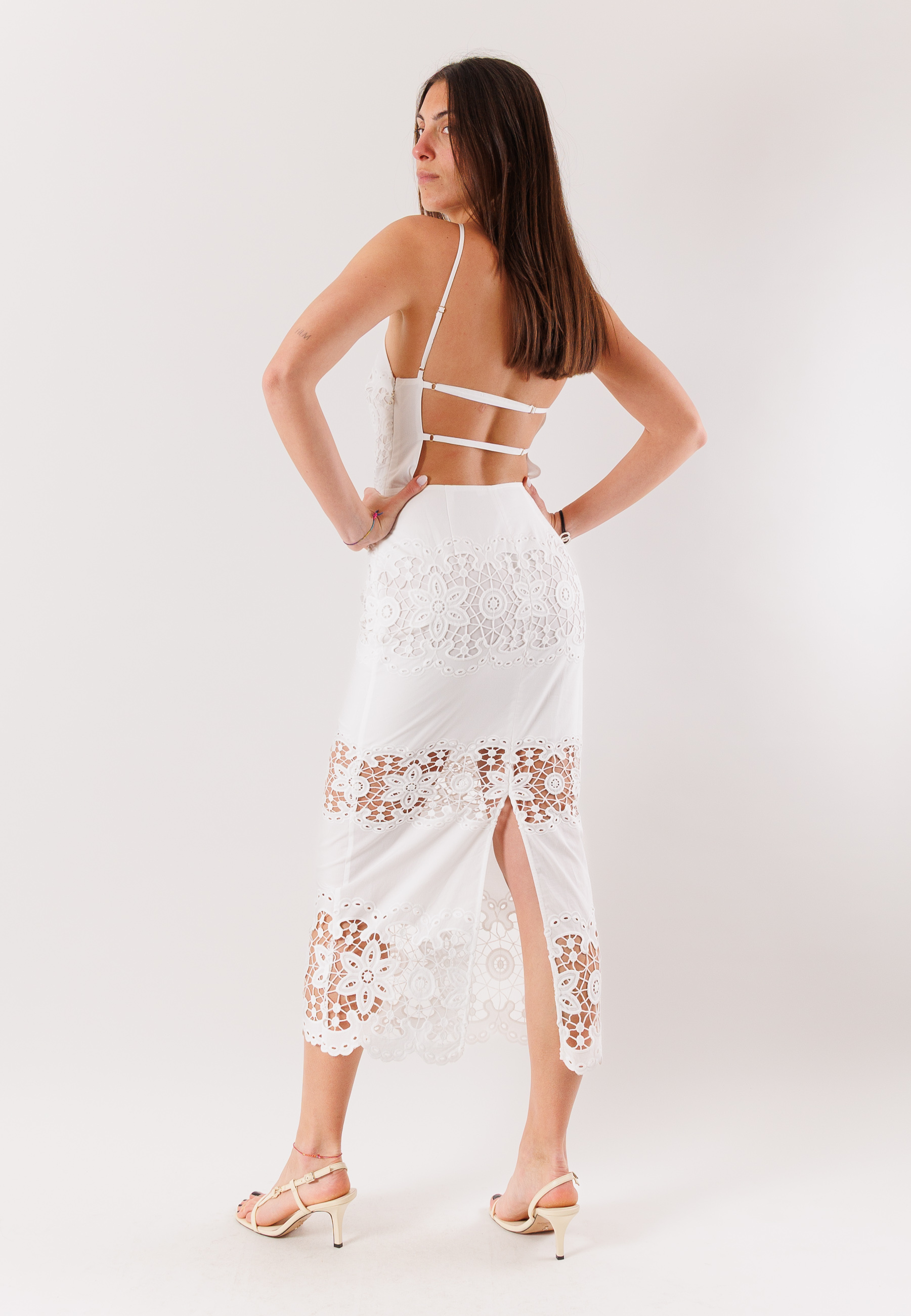 Il design si distingue per i ricercati inserti in pizzo traforato, posizionati con cura per creare un sofisticato gioco di trasparenze che dona leggerezza e femminilità al capo. La lunghezza lunga slancia la figura, mentre il taglio aderente sul busto e la linea pulita accompagnano delicatamente le forme, offrendo un equilibrio perfetto tra eleganza e sensualità.