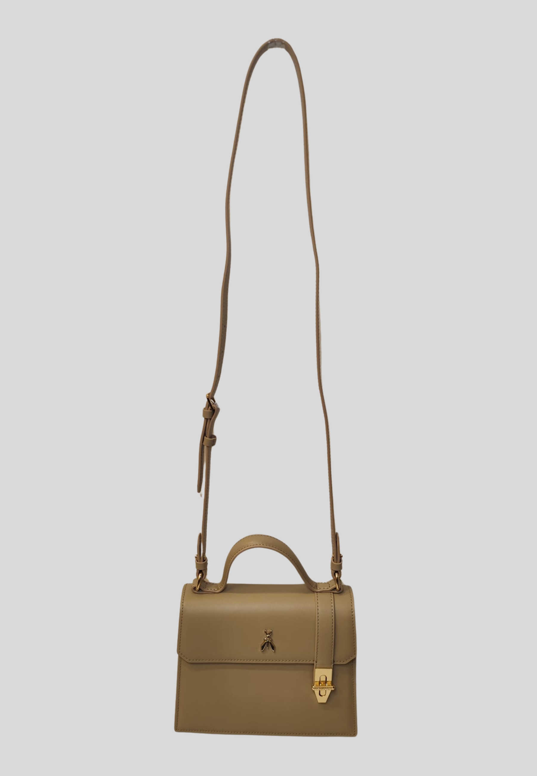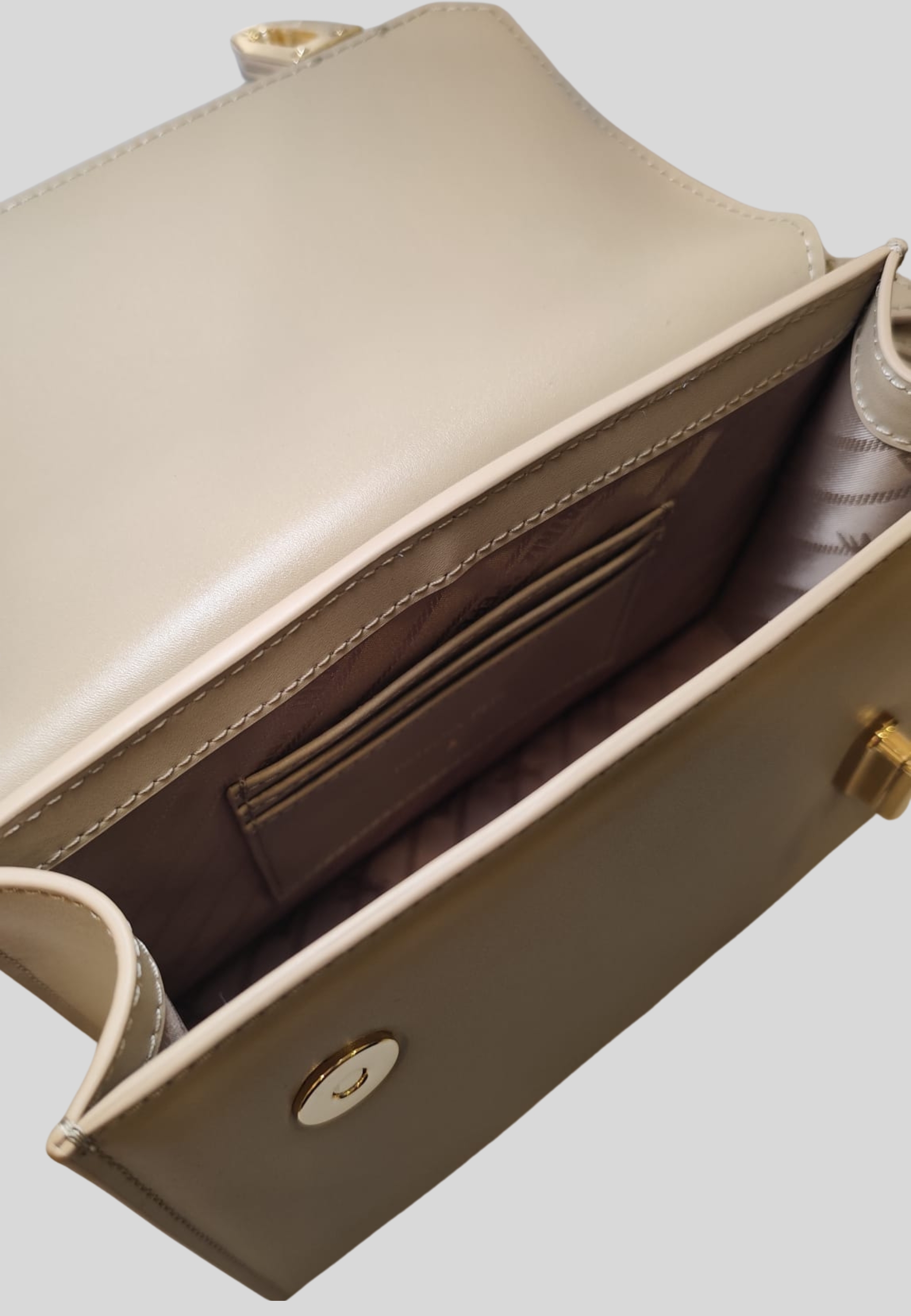 Il design strutturato è valorizzato da una patta frontale con chiusura metallica e da un pratico manico superiore, che consente un utilizzo versatile sia a mano che con tracolla (se prevista). Gli interni risultano ben organizzati, perfetti per custodire gli oggetti essenziali con ordine e praticità. I dettagli metallici e il logo discreto aggiungono un tocco iconico e riconoscibile.