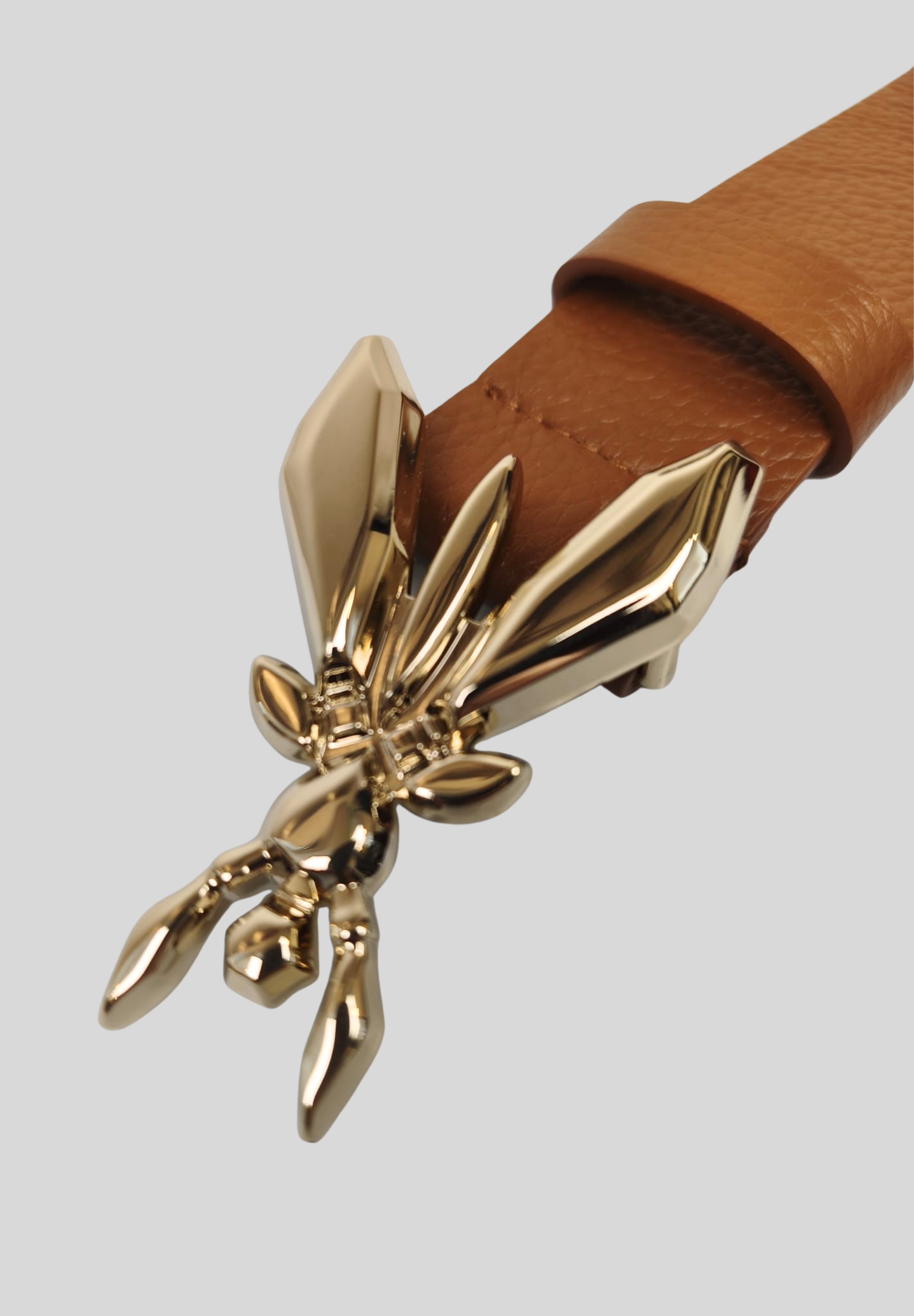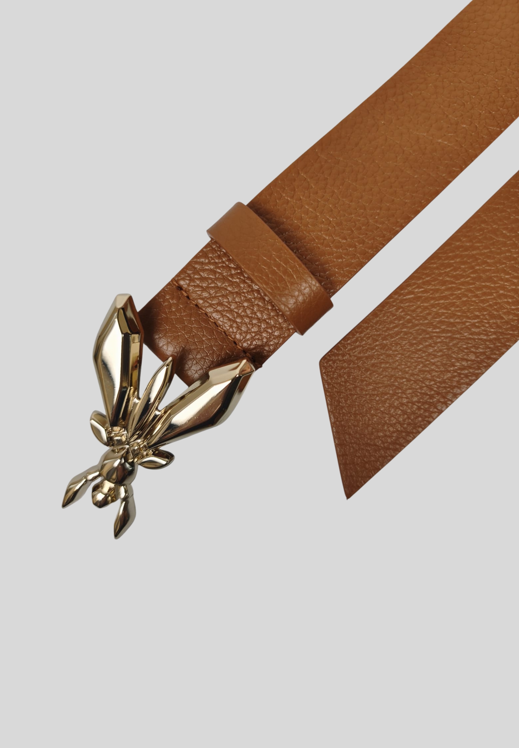 Il dettaglio protagonista è la fibbia gioiello dorata, che riproduce liconica Fly simbolo del brand: un elemento raffinato e luminoso, capace di trasformare anche il look più semplice in un insieme elegante e ricercato. Il passante in pelle abbinato completa il design con equilibrio e pulizia estetica.