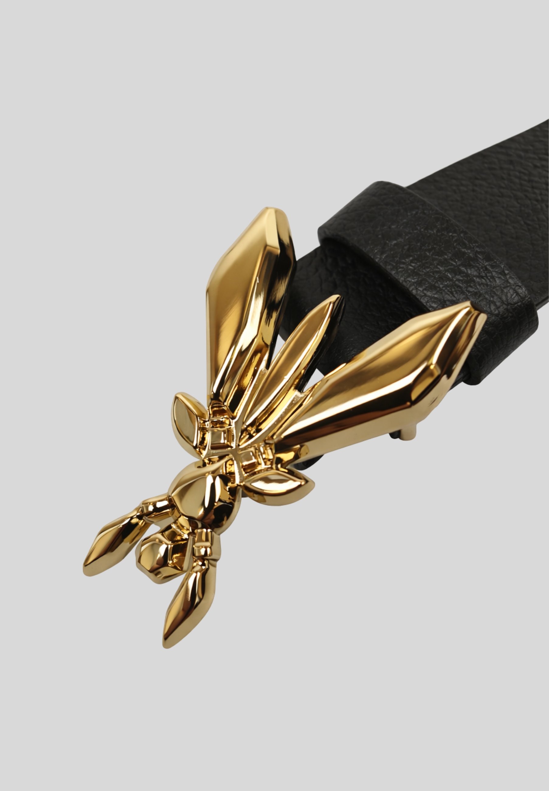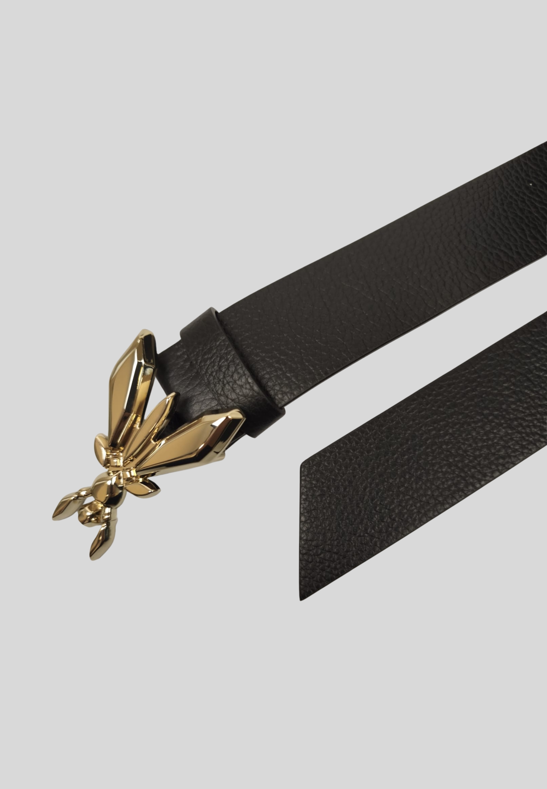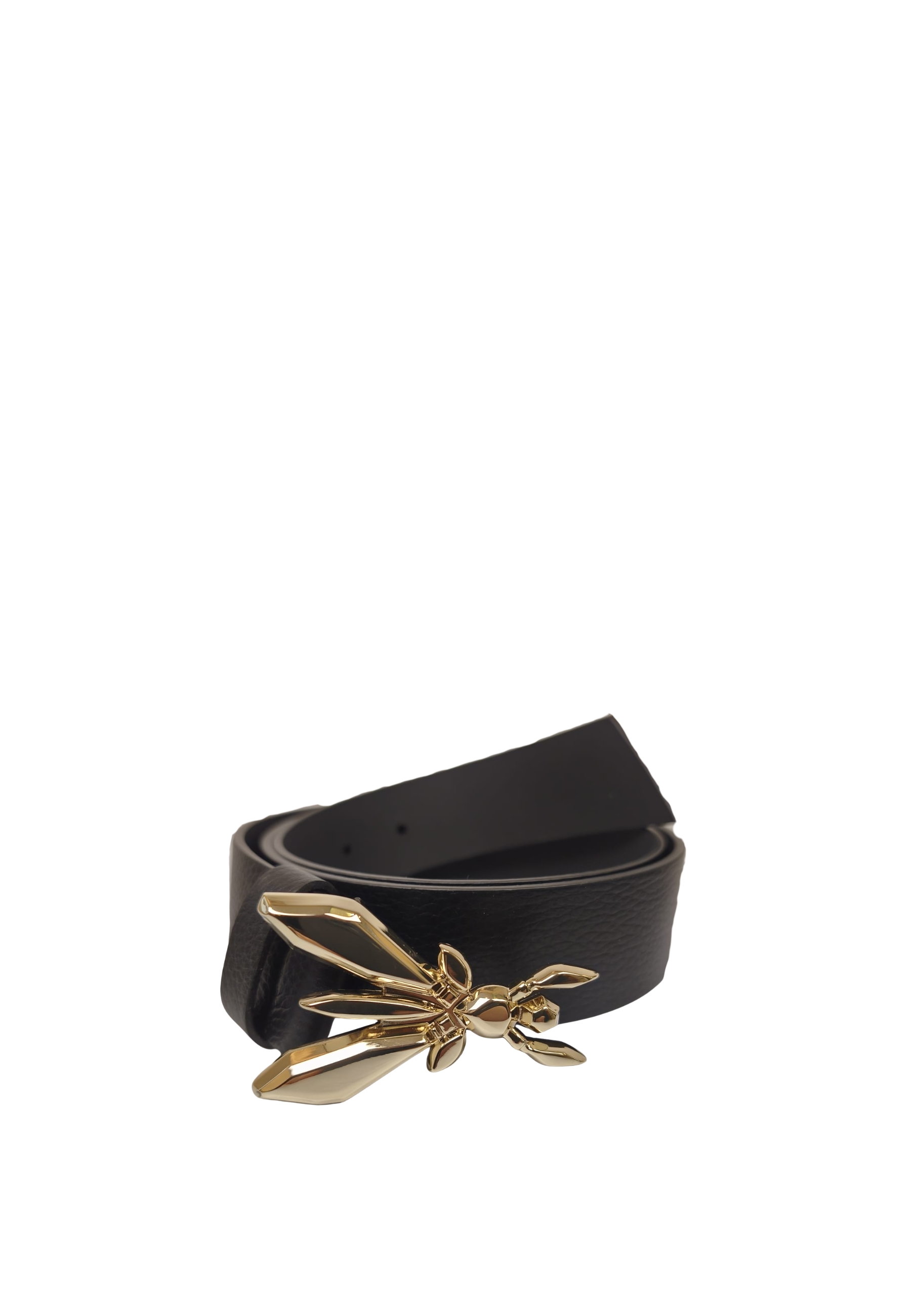 Il dettaglio protagonista è la fibbia gioiello dorata, che riproduce liconica Fly simbolo del brand: un elemento raffinato e luminoso, capace di trasformare anche il look più semplice in un insieme elegante e ricercato. Il passante in pelle abbinato completa il design con equilibrio e pulizia estetica.