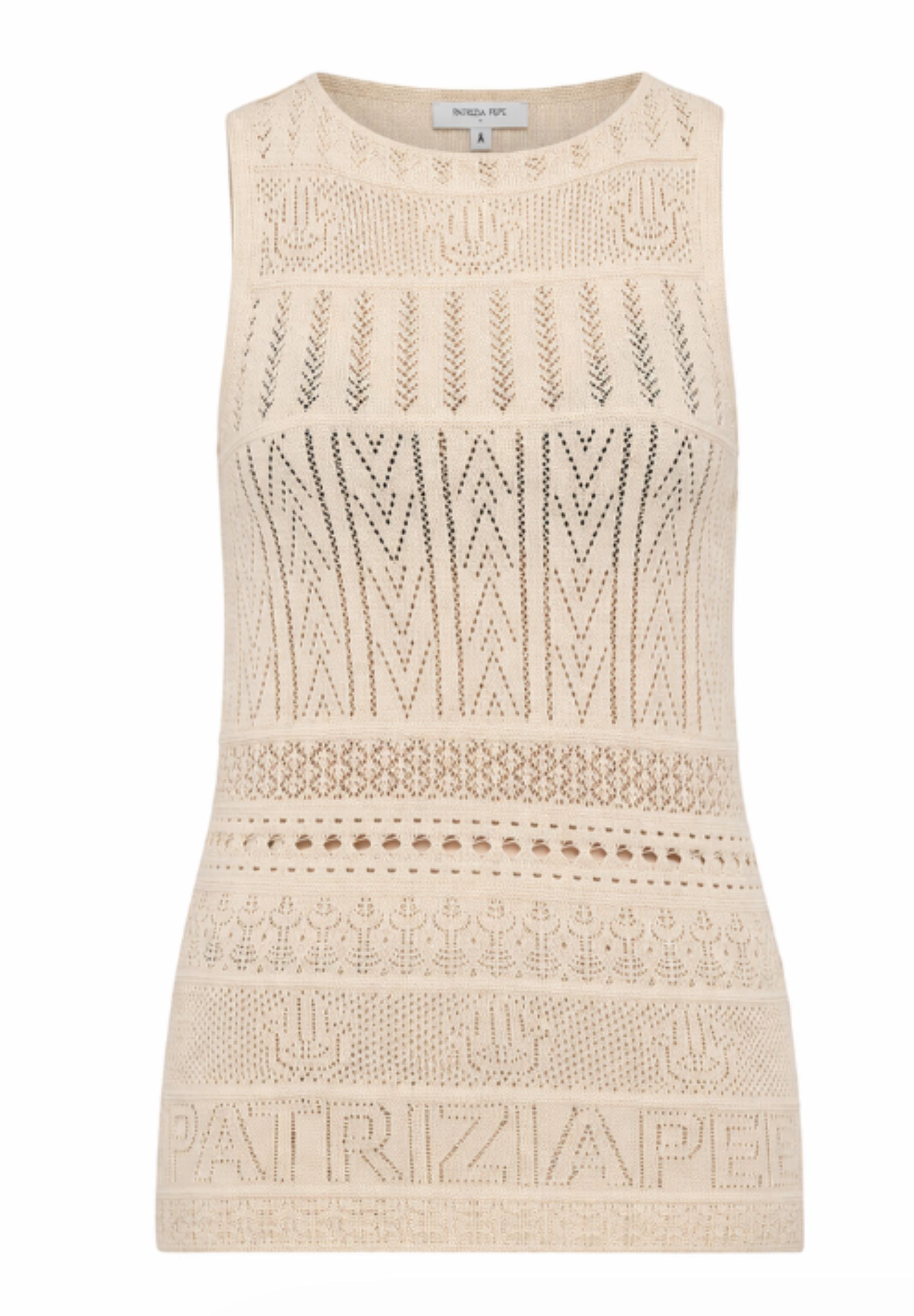 La lavorazione traforata crea un raffinato gioco di trame che dona leggerezza ed eleganza al design, rendendo il capo ideale per la stagione primavera-estate. Il taglio smanicato esalta le linee, mentre il dettaglio sul retro con apertura e laccetto aggiunge un tocco distintivo e ricercato, tipico dello stile Patrizia Pepe.