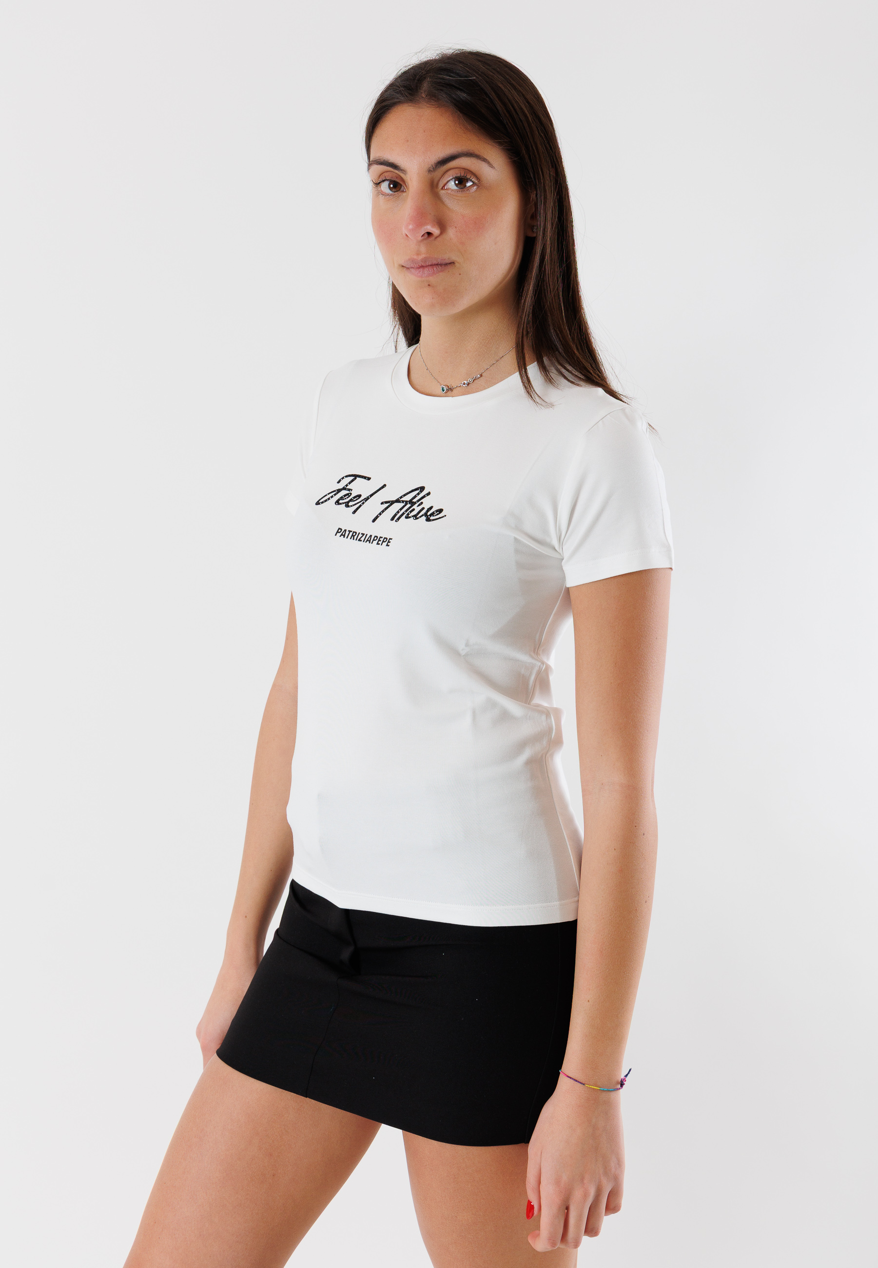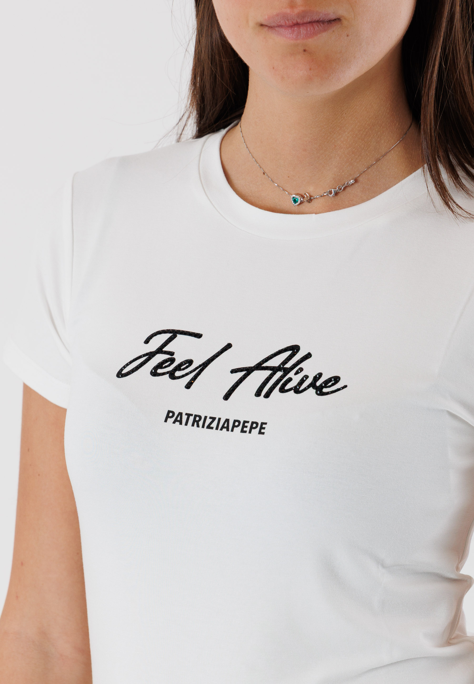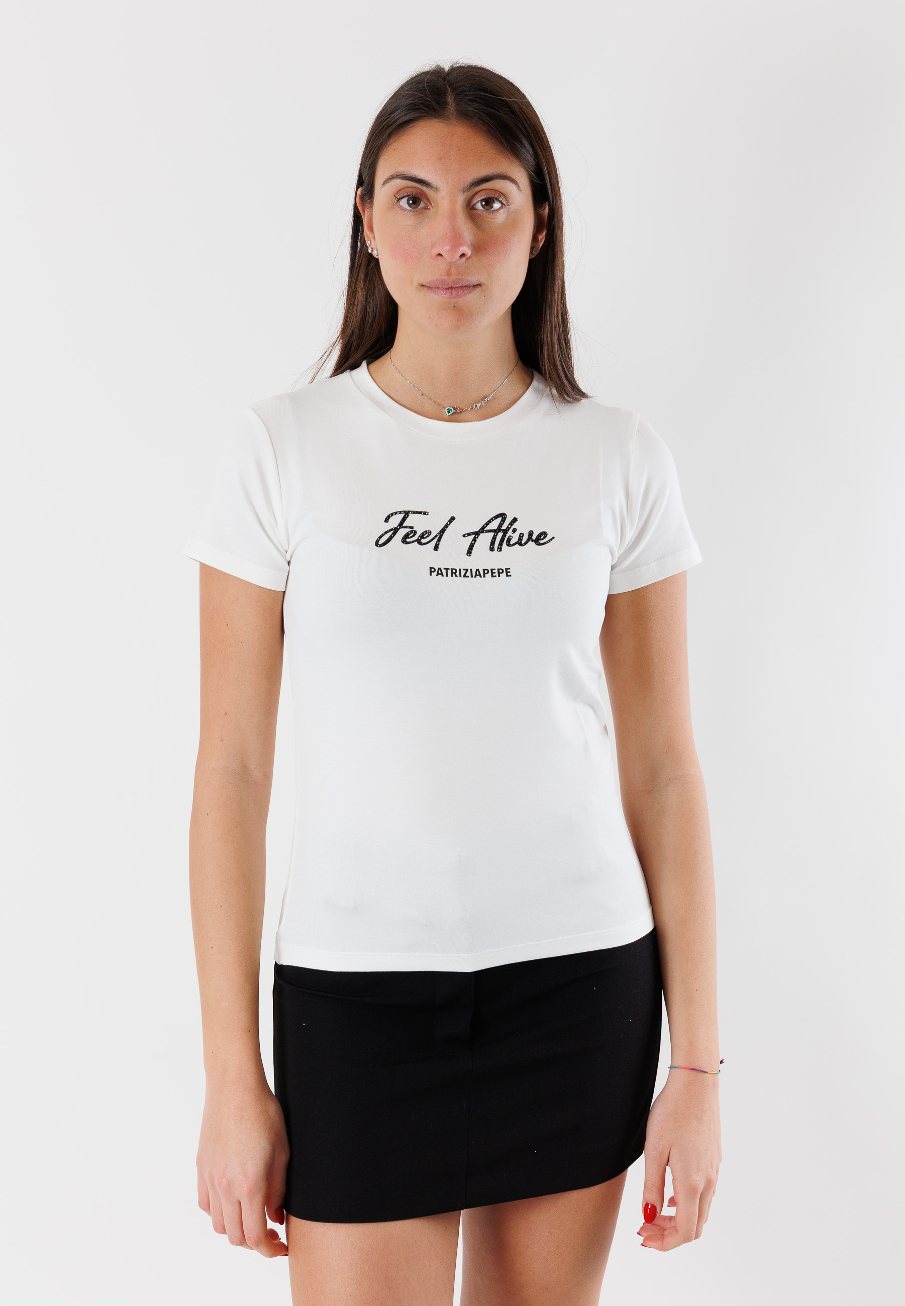 Da abbinare a gonne, pantaloni o denim, questa t-shirt rappresenta un must-have del guardaroba femminile firmato Patrizia Pepe, pensato per una donna moderna e sicura di sé.