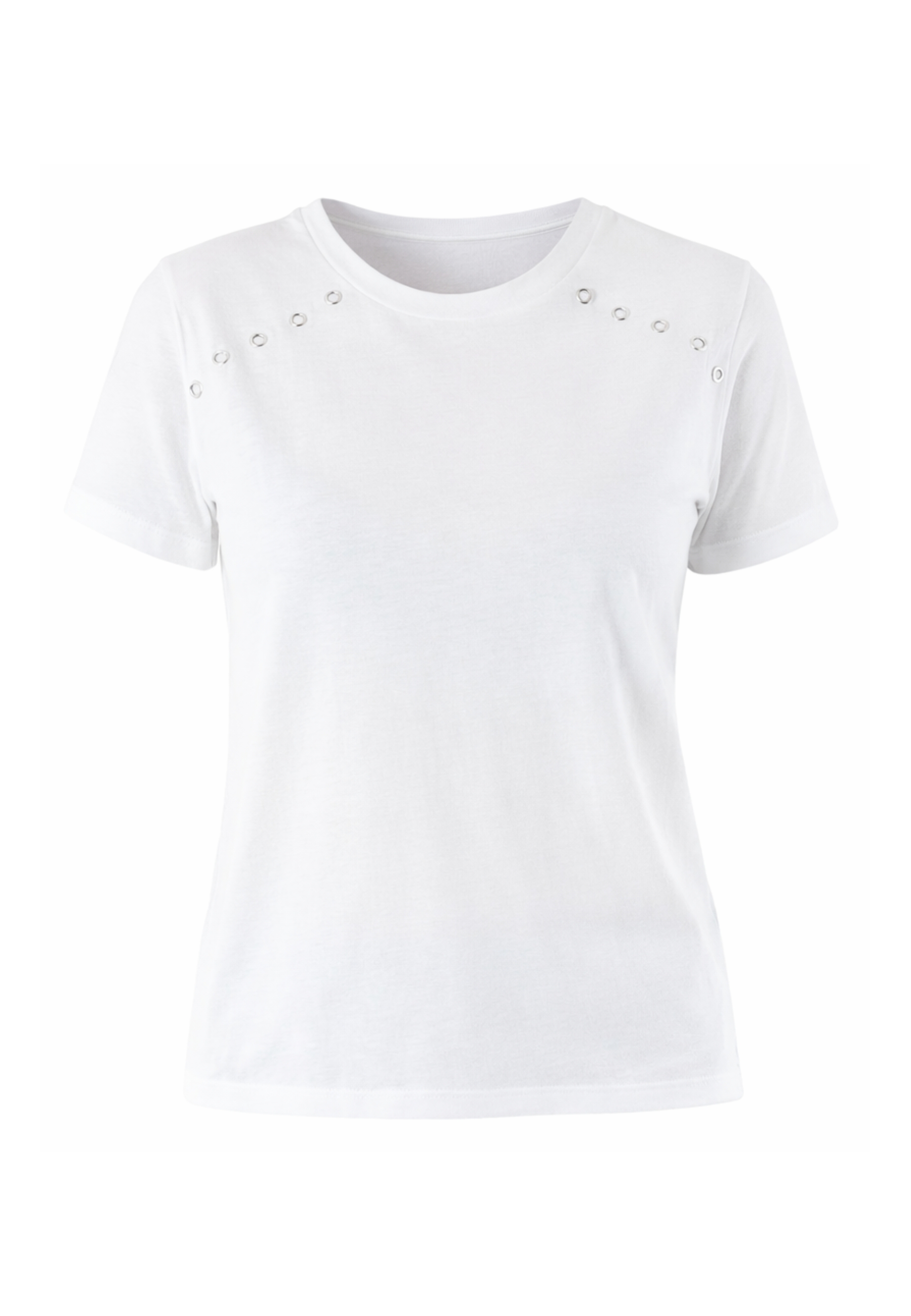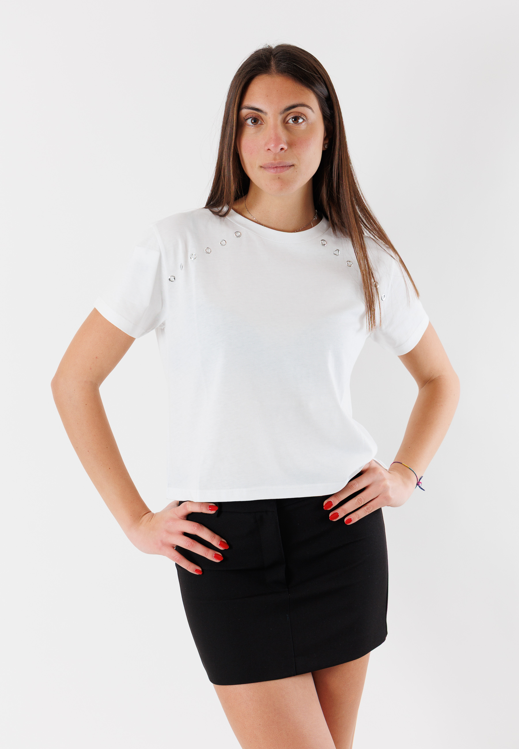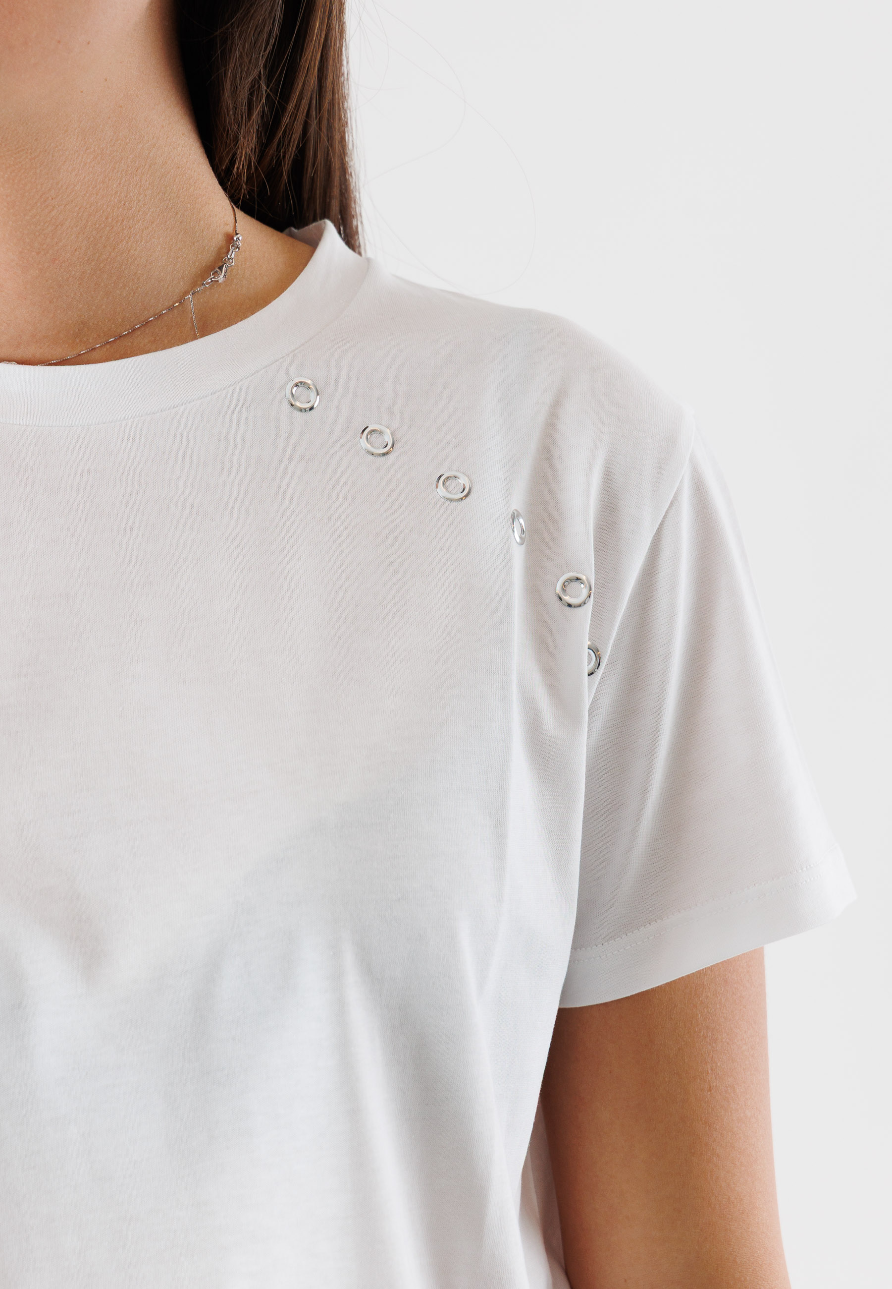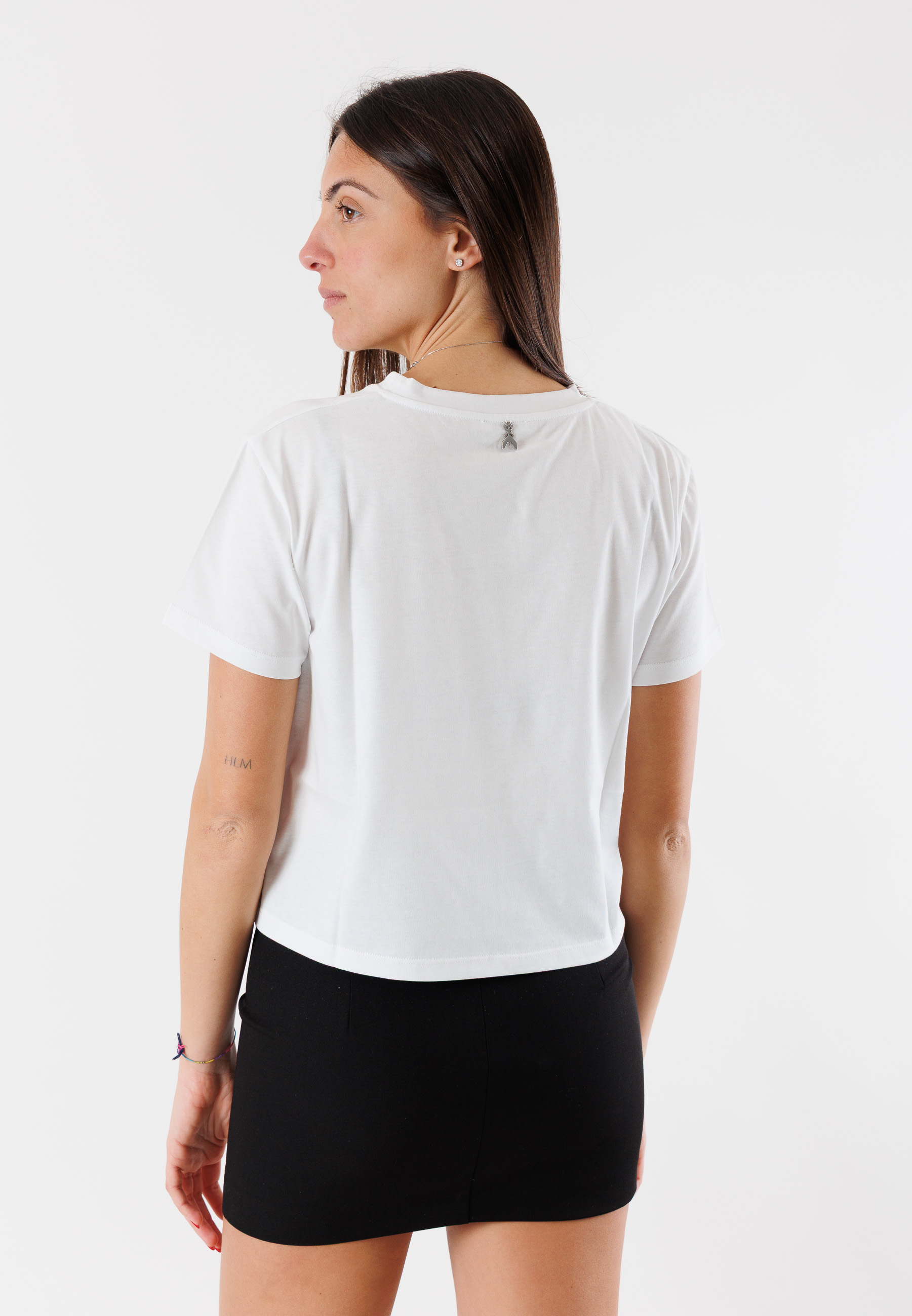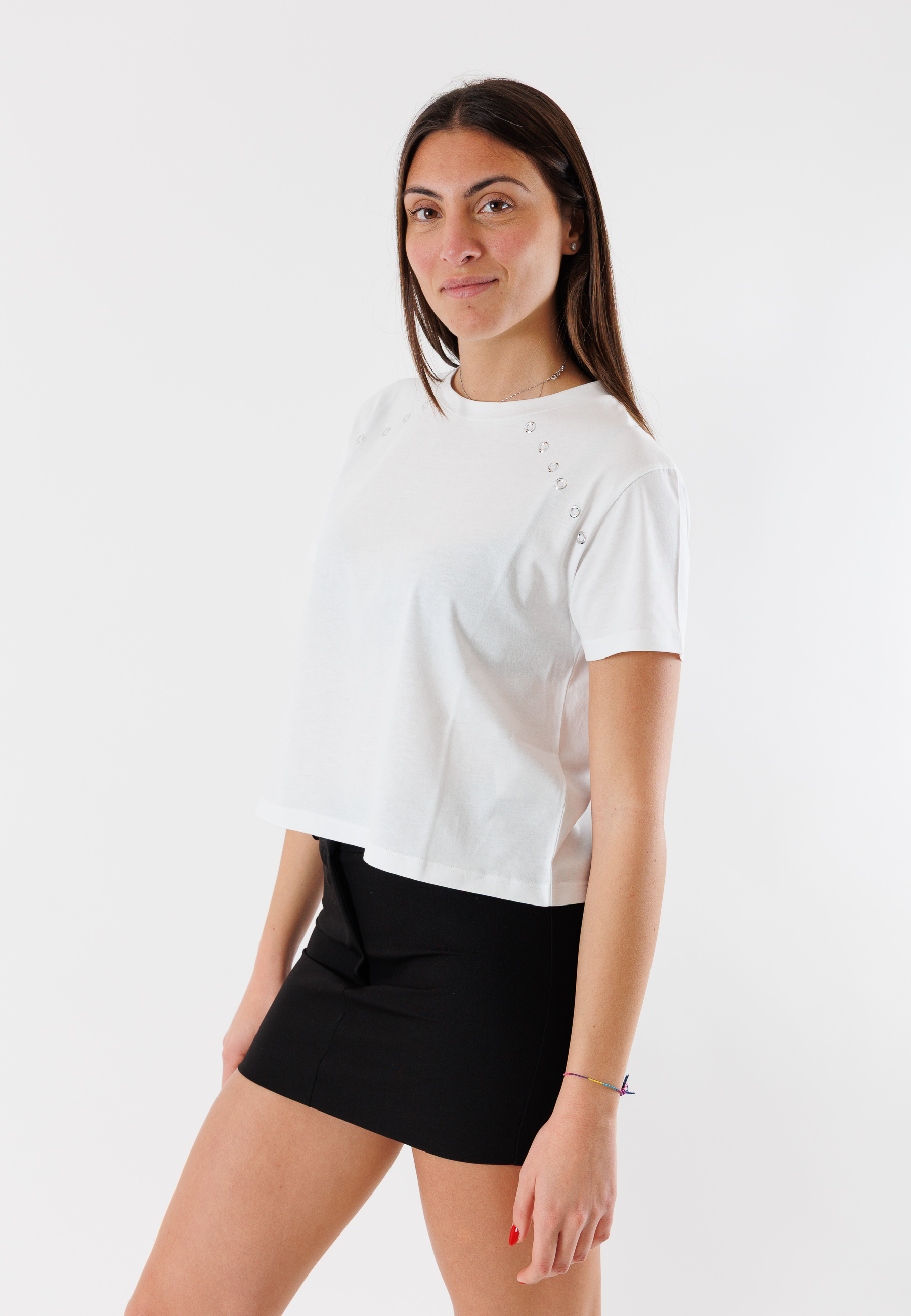 T-shirt Patrizia Pepe da donna dal design pulito e raffinato, arricchita da delicati dettagli gioiello sulla spalla che donano luminosità e carattere a un capo essenziale del guardaroba femminile. Una proposta versatile, ideale per elevare anche i look più semplici con un tocco sofisticato.