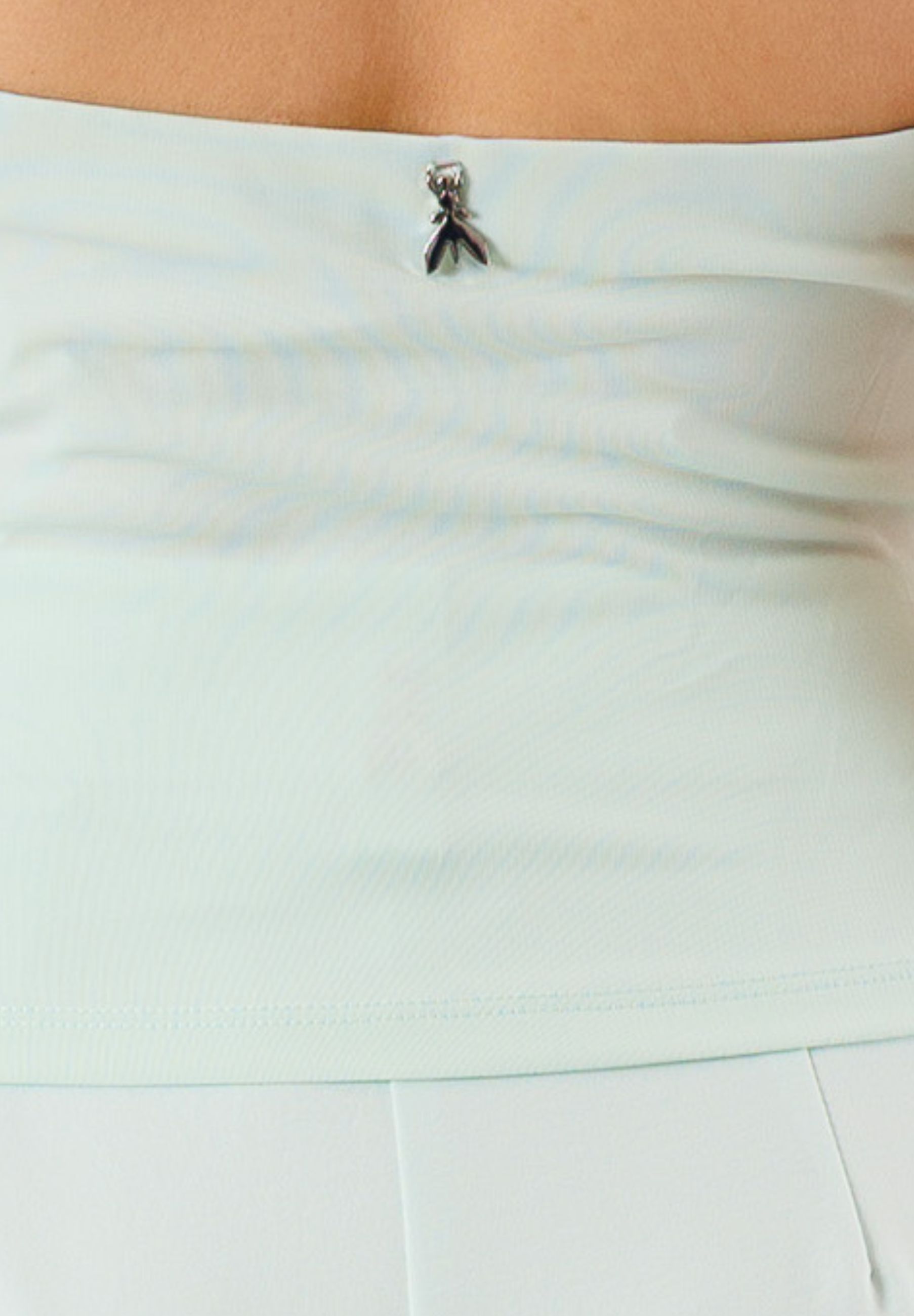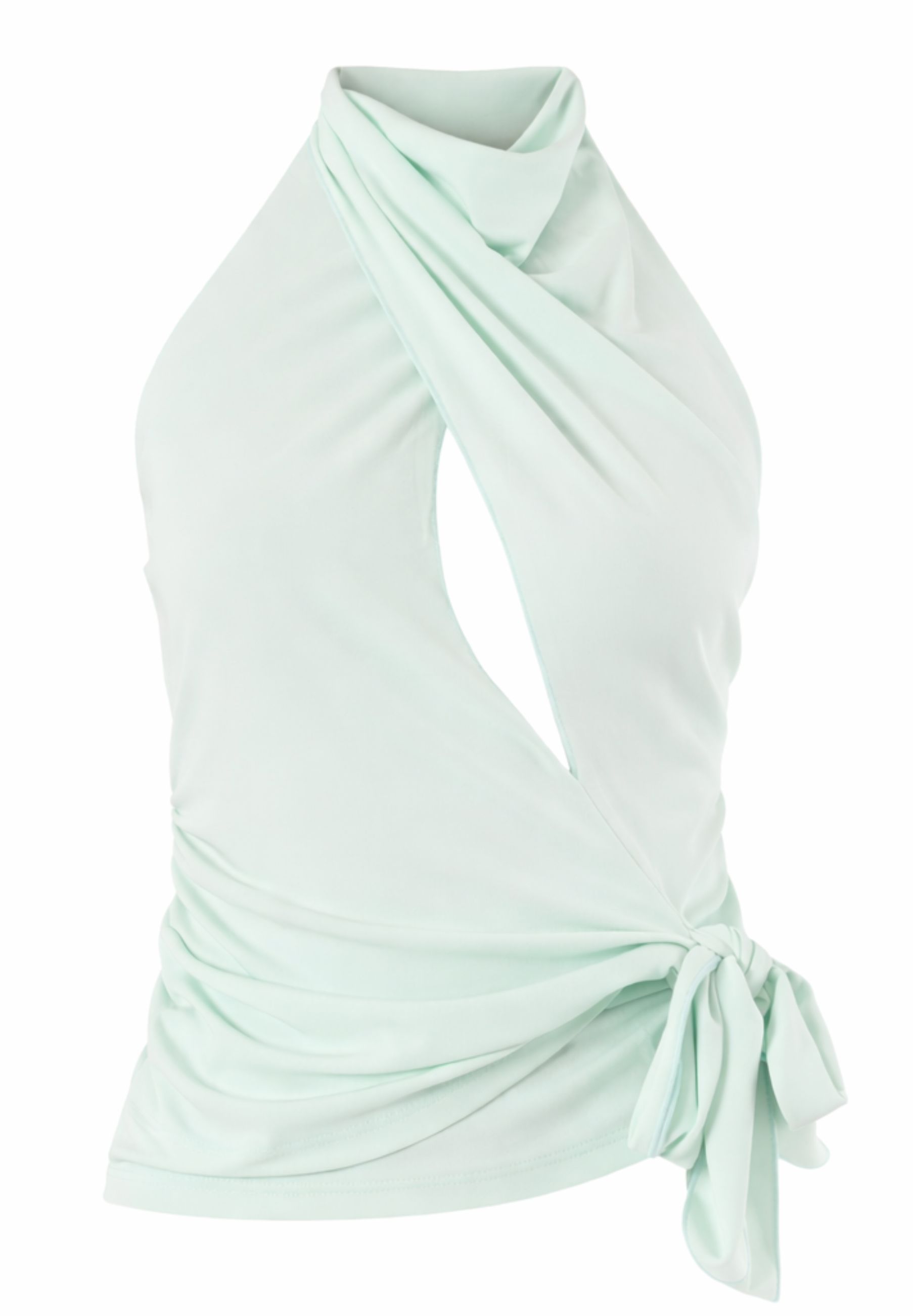 Il design presenta un scollo incrociato effetto halter, che crea un elegante gioco di linee sul davanti, mentre il retro scoperto aggiunge un tocco moderno e femminile. Il dettaglio annodato laterale dona movimento e carattere al capo, rendendolo distintivo e immediatamente riconoscibile.