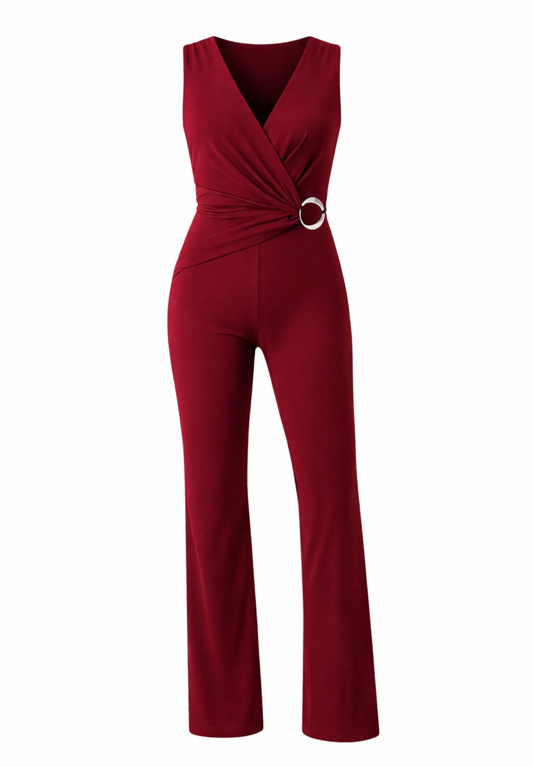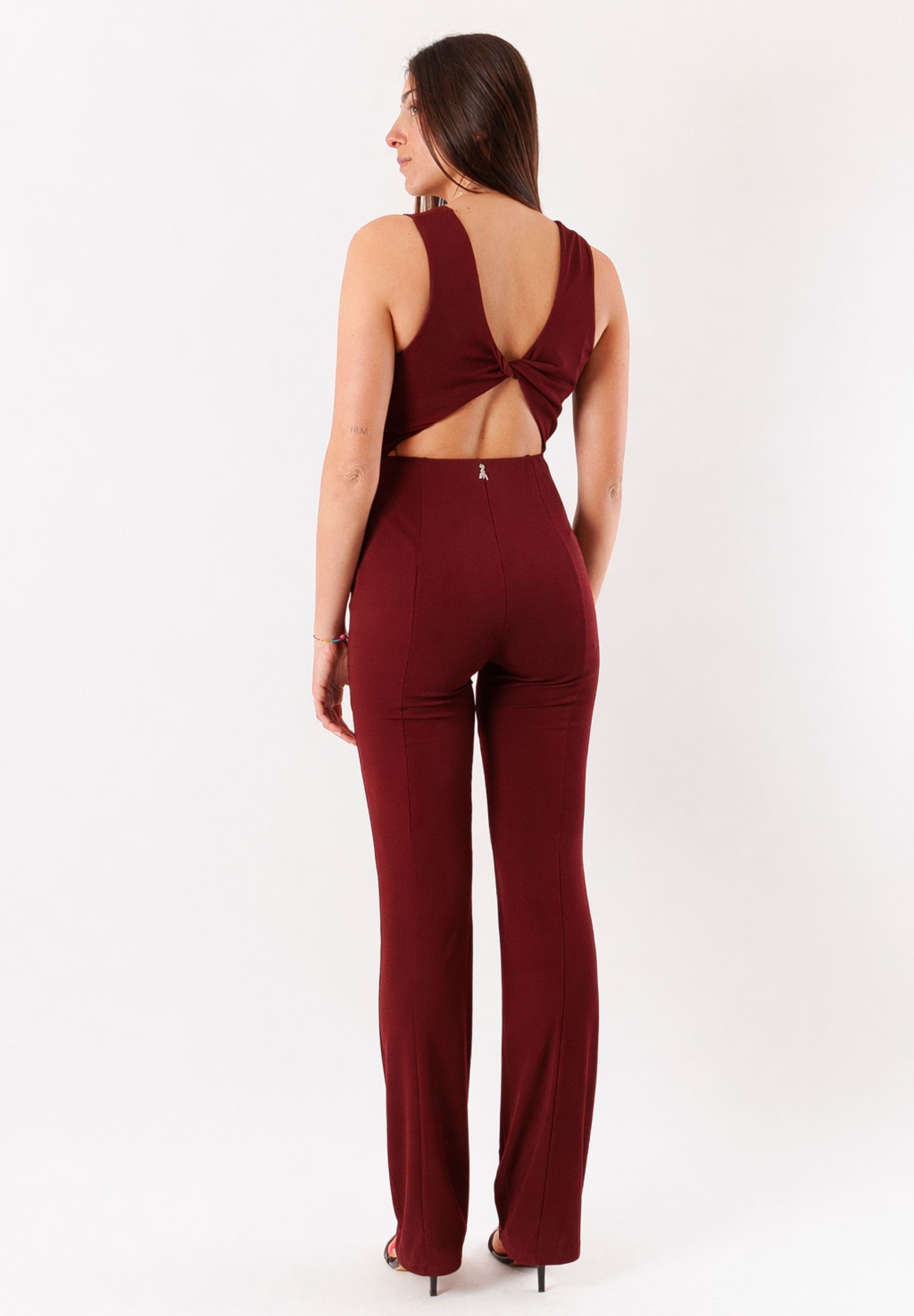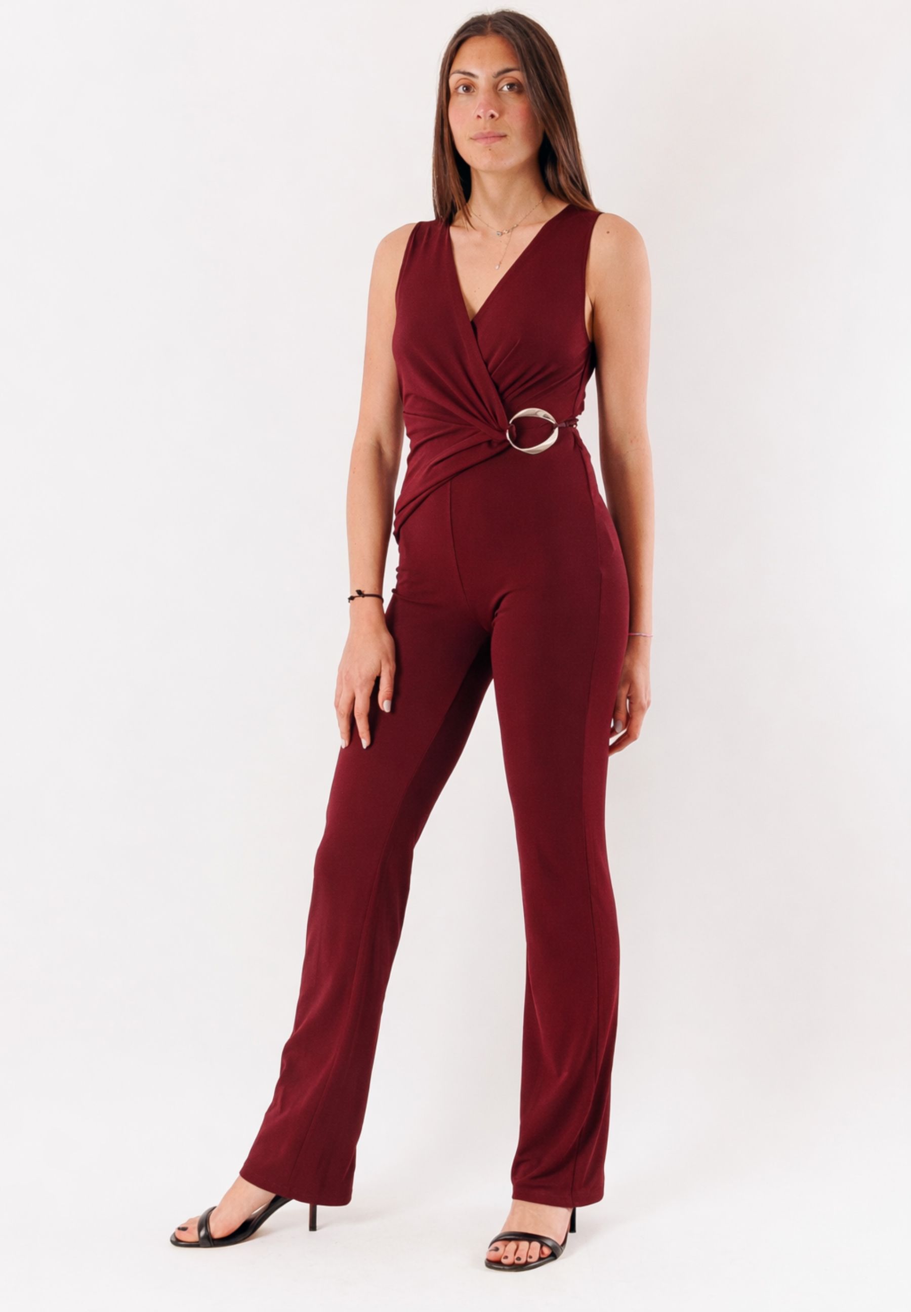 Il design presenta un scollo incrociato che definisce il busto e una vita evidenziata da un inserto gioiello ad anello, dettaglio iconico che dona luce e carattere al capo. Il taglio smanicato e la linea lunga con gamba leggermente ampia slanciano la silhouette, mentre il retro con apertura discreta aggiunge un tocco contemporaneo e ricercato.