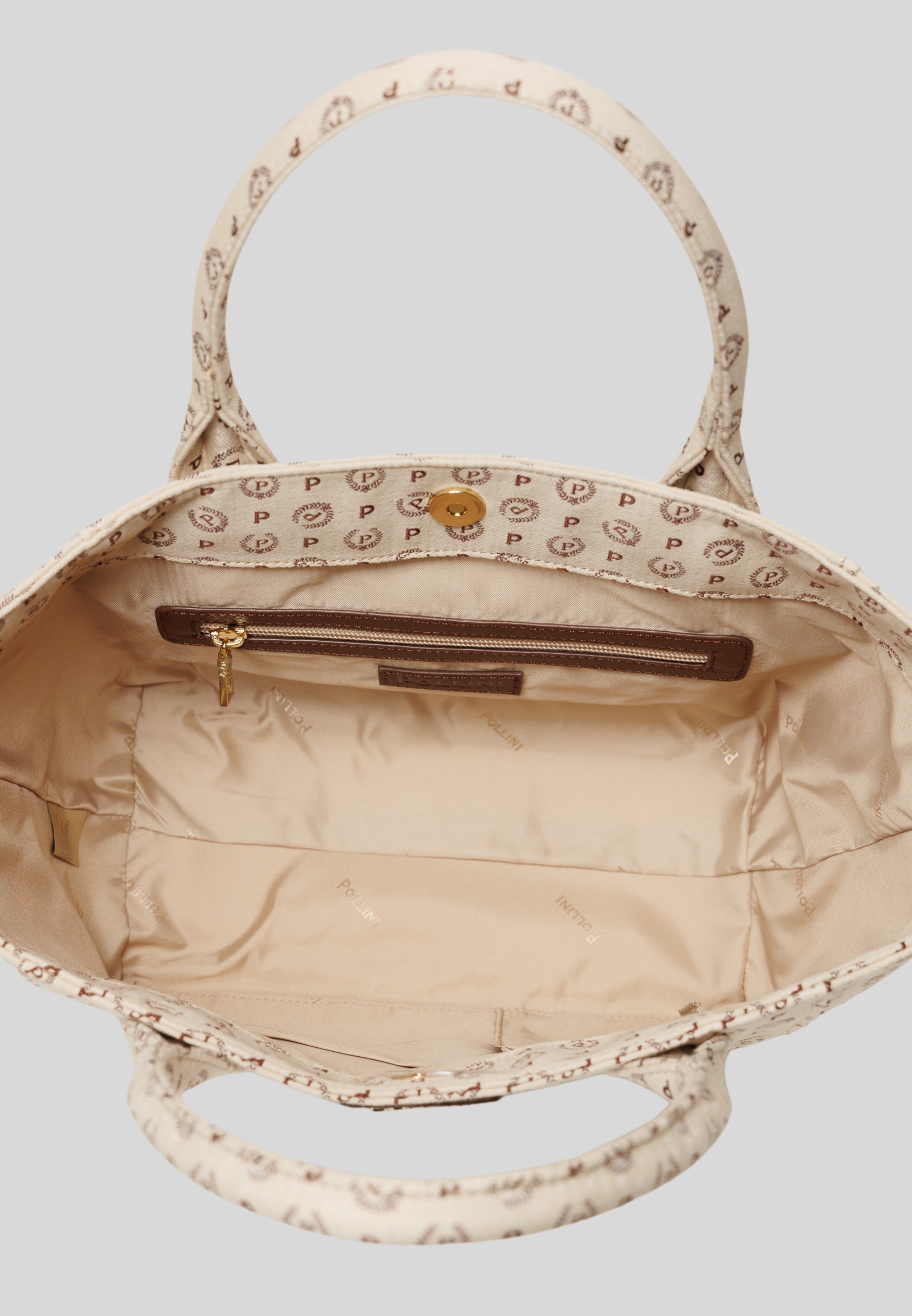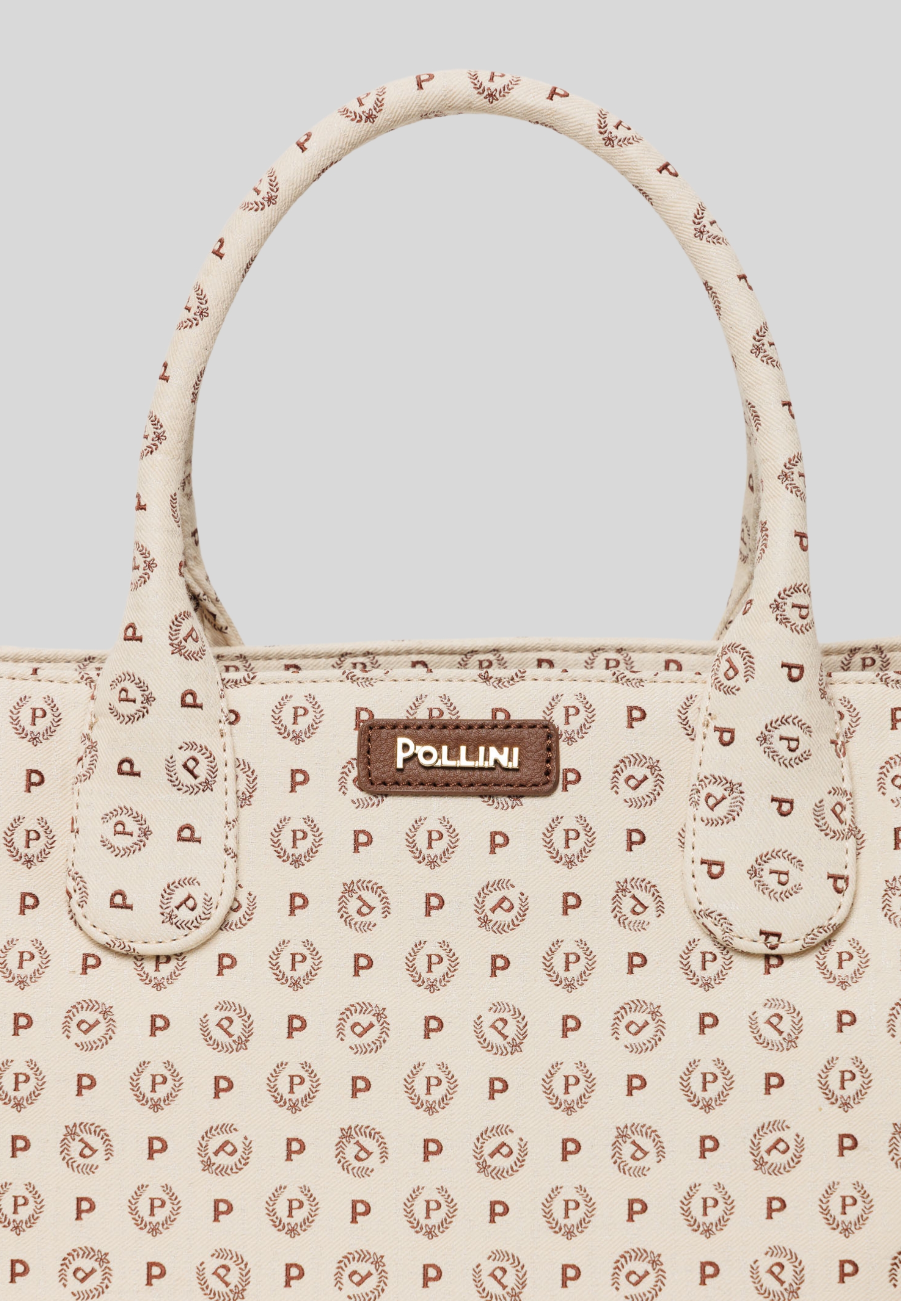 Shopper firmata Pollini è realizzata in resistente tessuto canvas beige con stampa all-over del logo "P" in rosso. Dotata di doppi manici imbottiti e cuciture rinforzate, è perfetta per accompagnarti ogni giorno con stile.